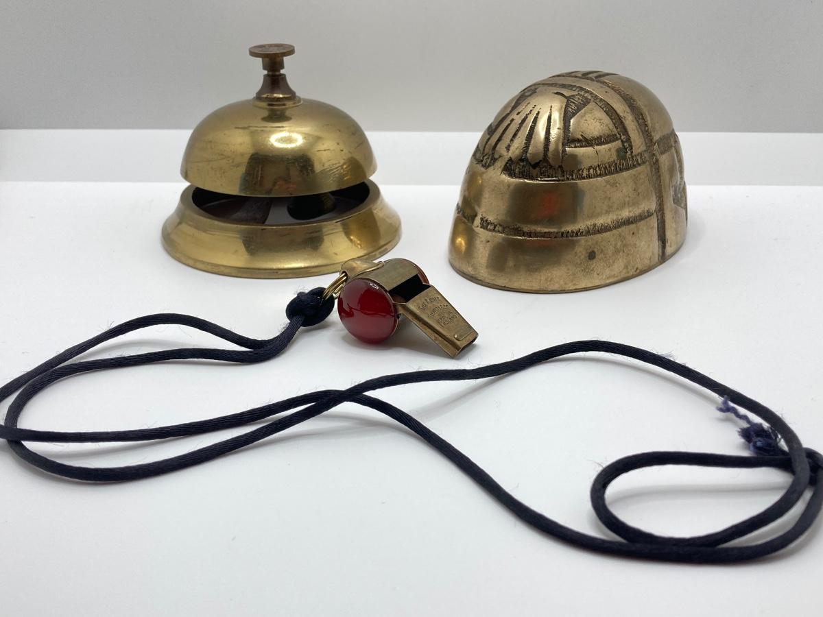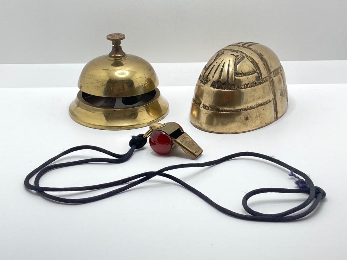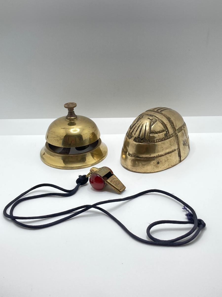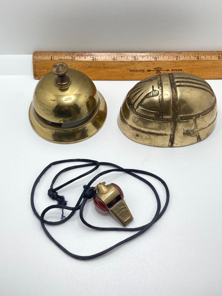 LOT 251: Vintage Brass Collection - Scarab Paper Weight, Service Desk Bell and The Acme Thunderer Made in England Whistle