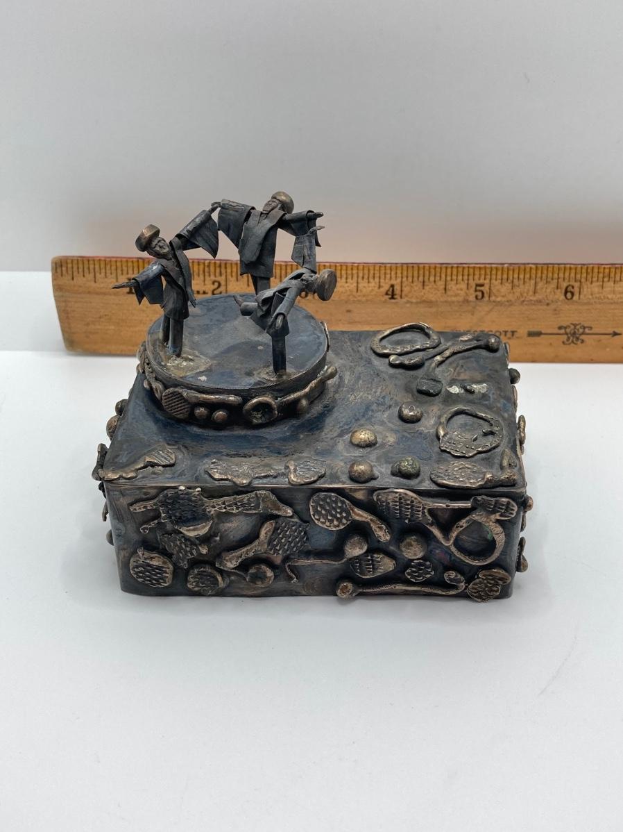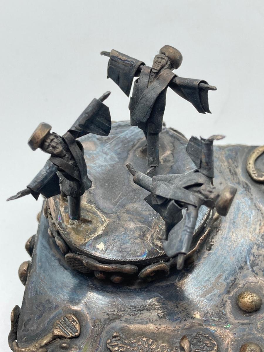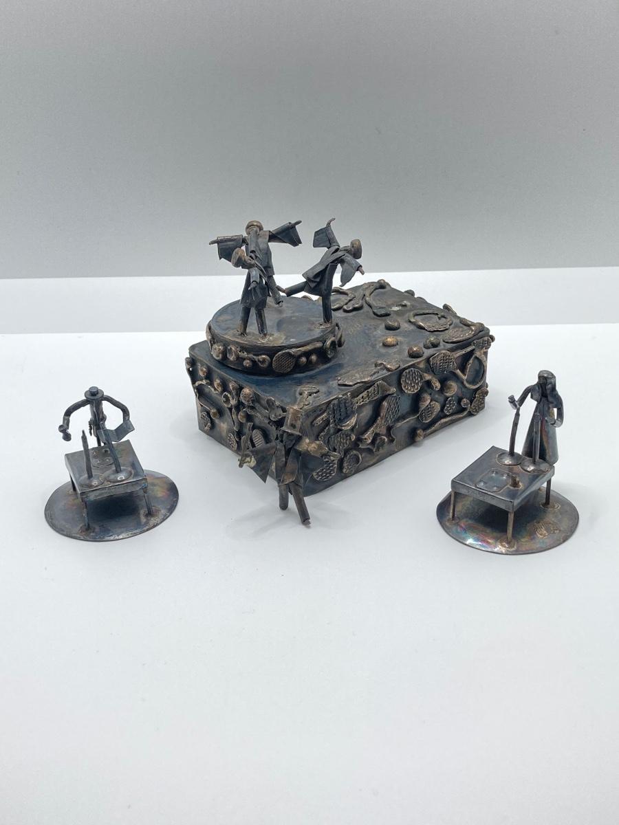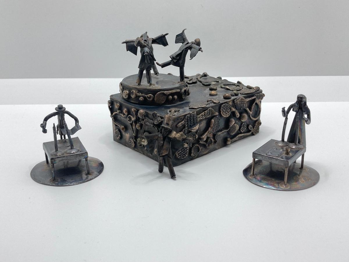 LOT 253: Vintage Figural Silverplate Music Box Hava Nagila Judaica Fiddler with Two Sterling Israel Jerusalem Miniature Figures