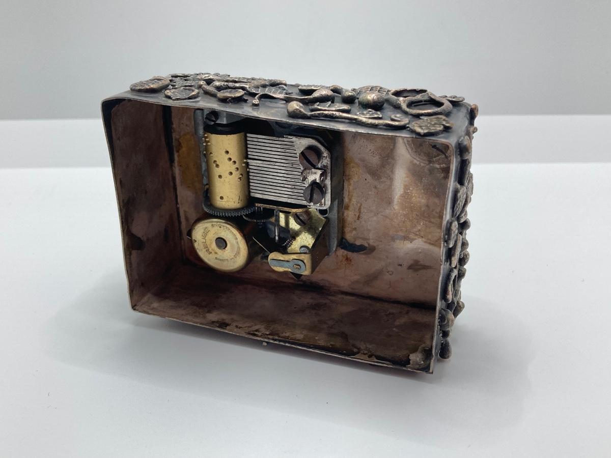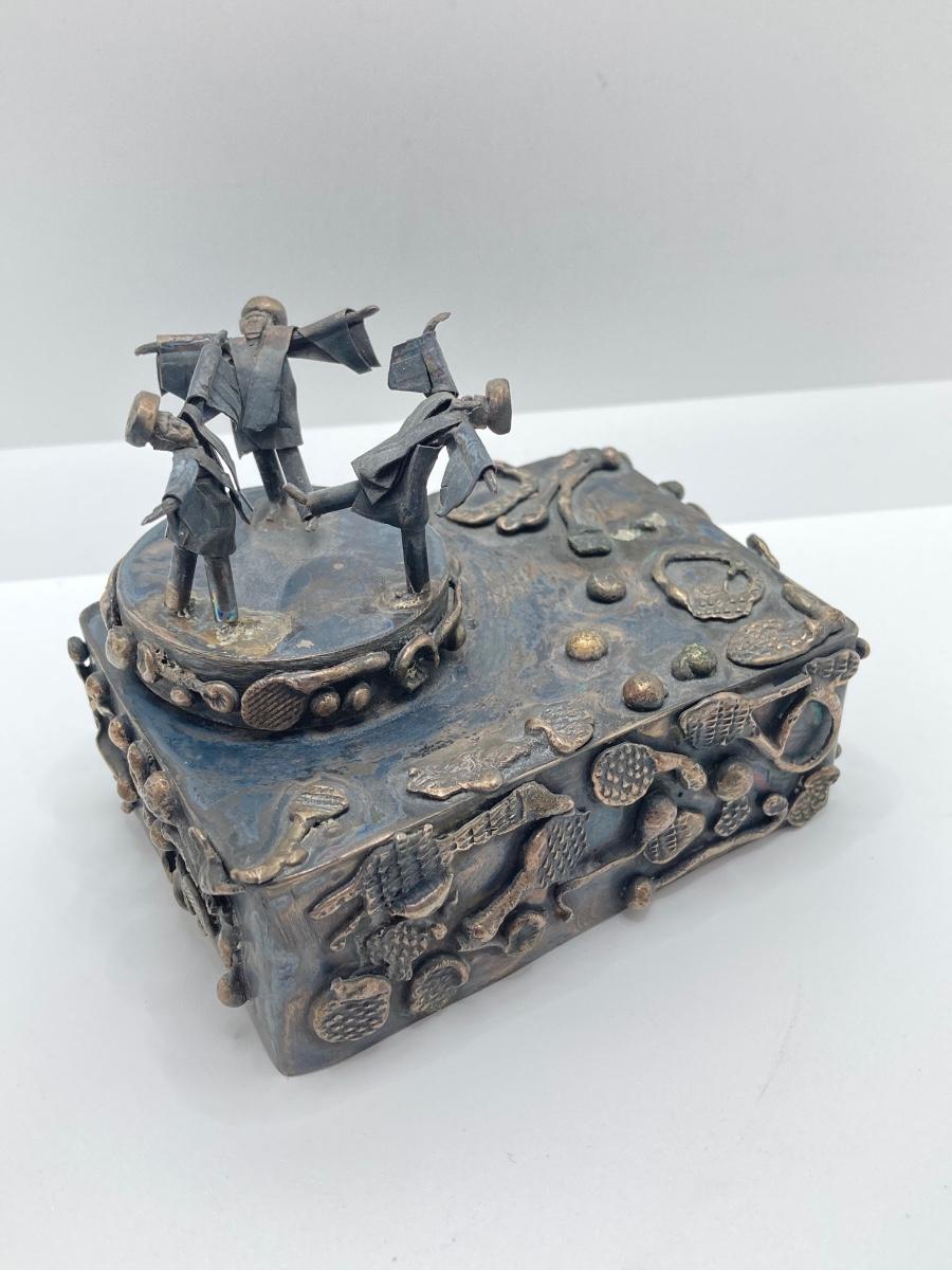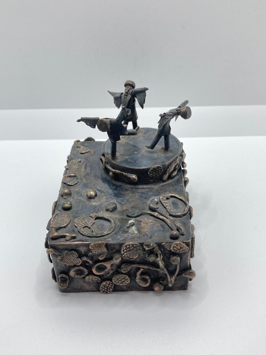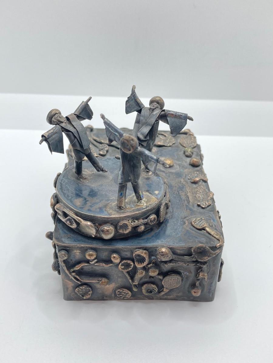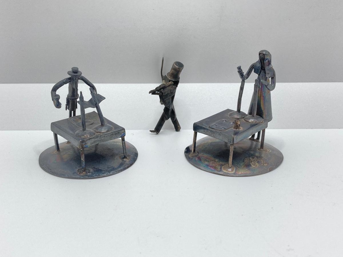 LOT 253: Vintage Figural Silverplate Music Box Hava Nagila Judaica Fiddler with Two Sterling Israel Jerusalem Miniature Figures