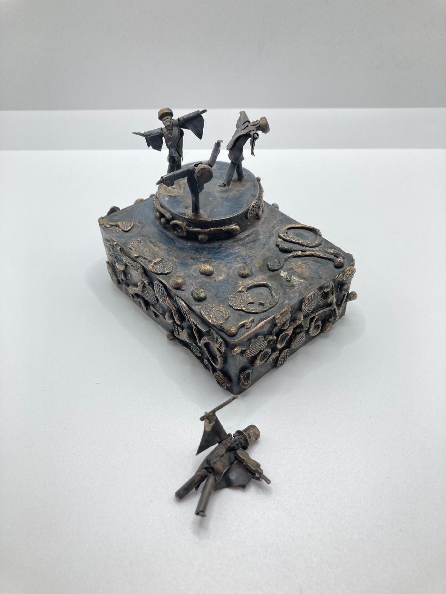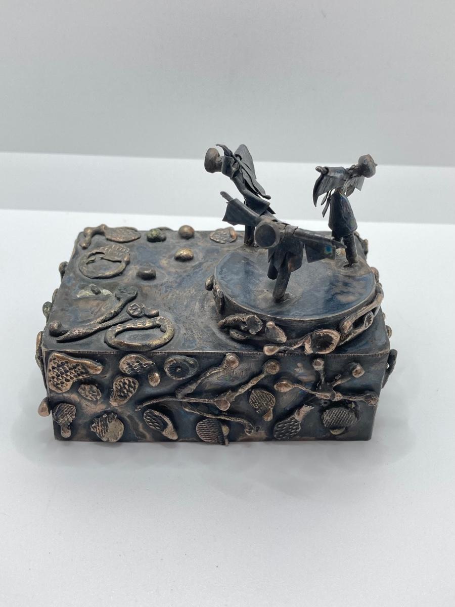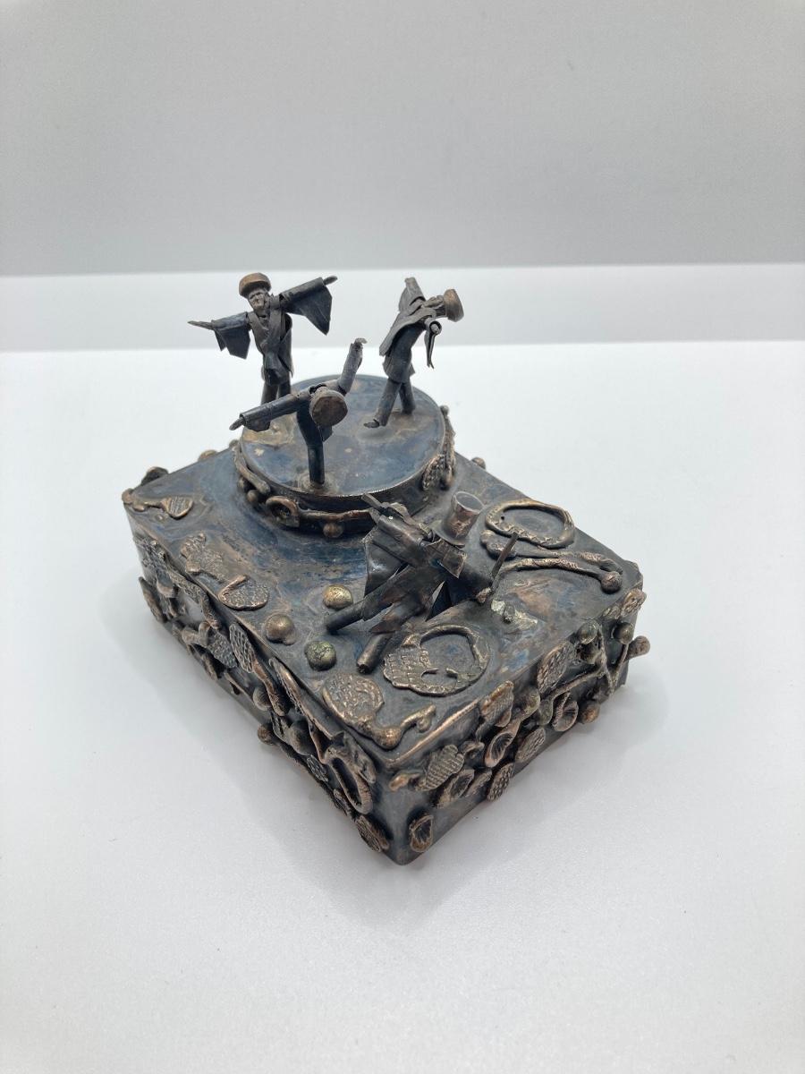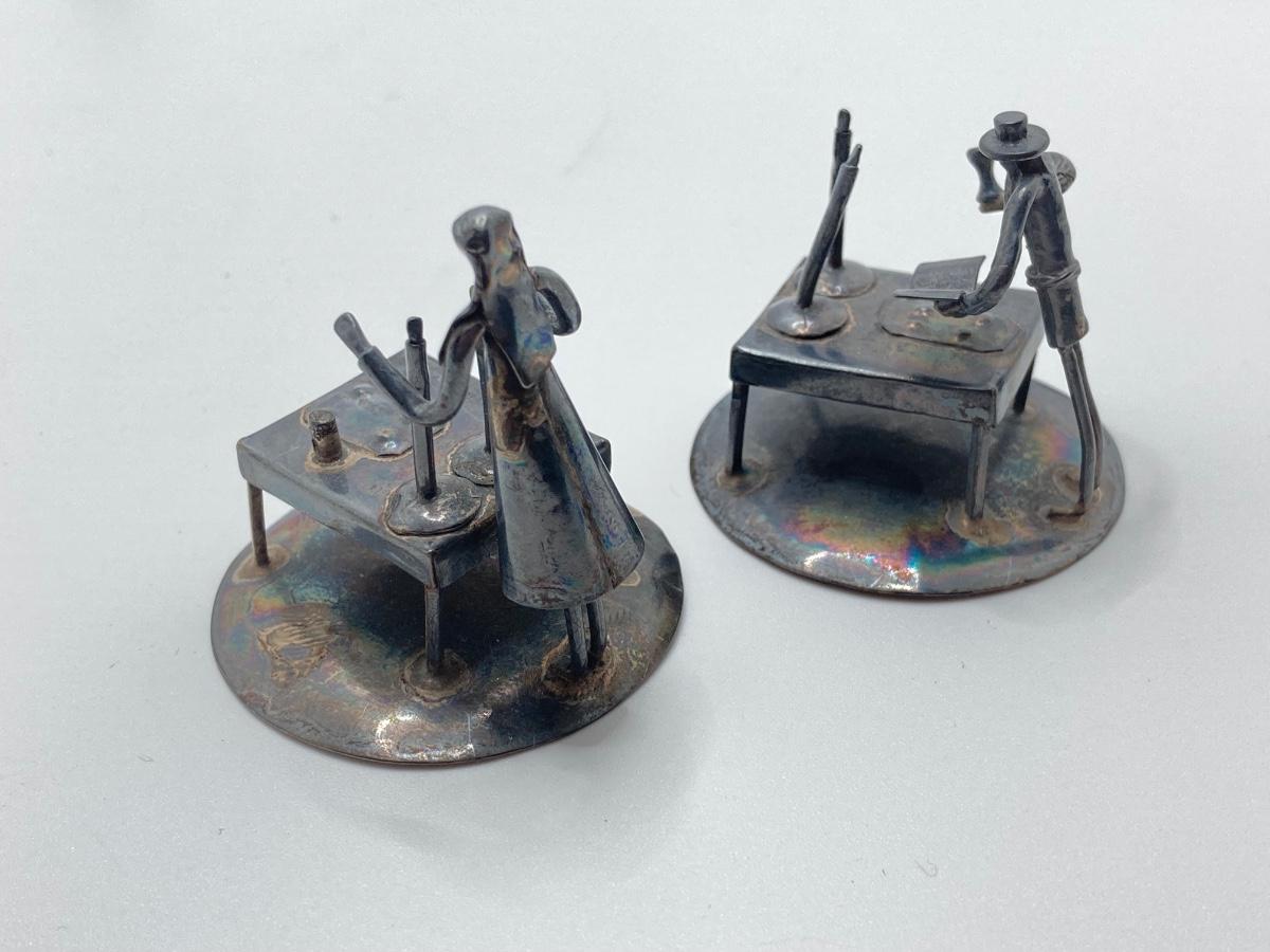 LOT 253: Vintage Figural Silverplate Music Box Hava Nagila Judaica Fiddler with Two Sterling Israel Jerusalem Miniature Figures
