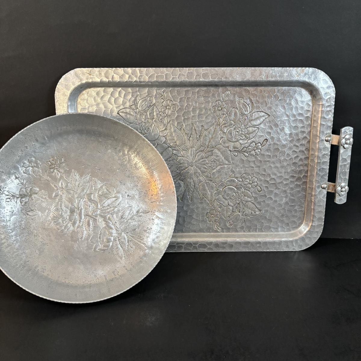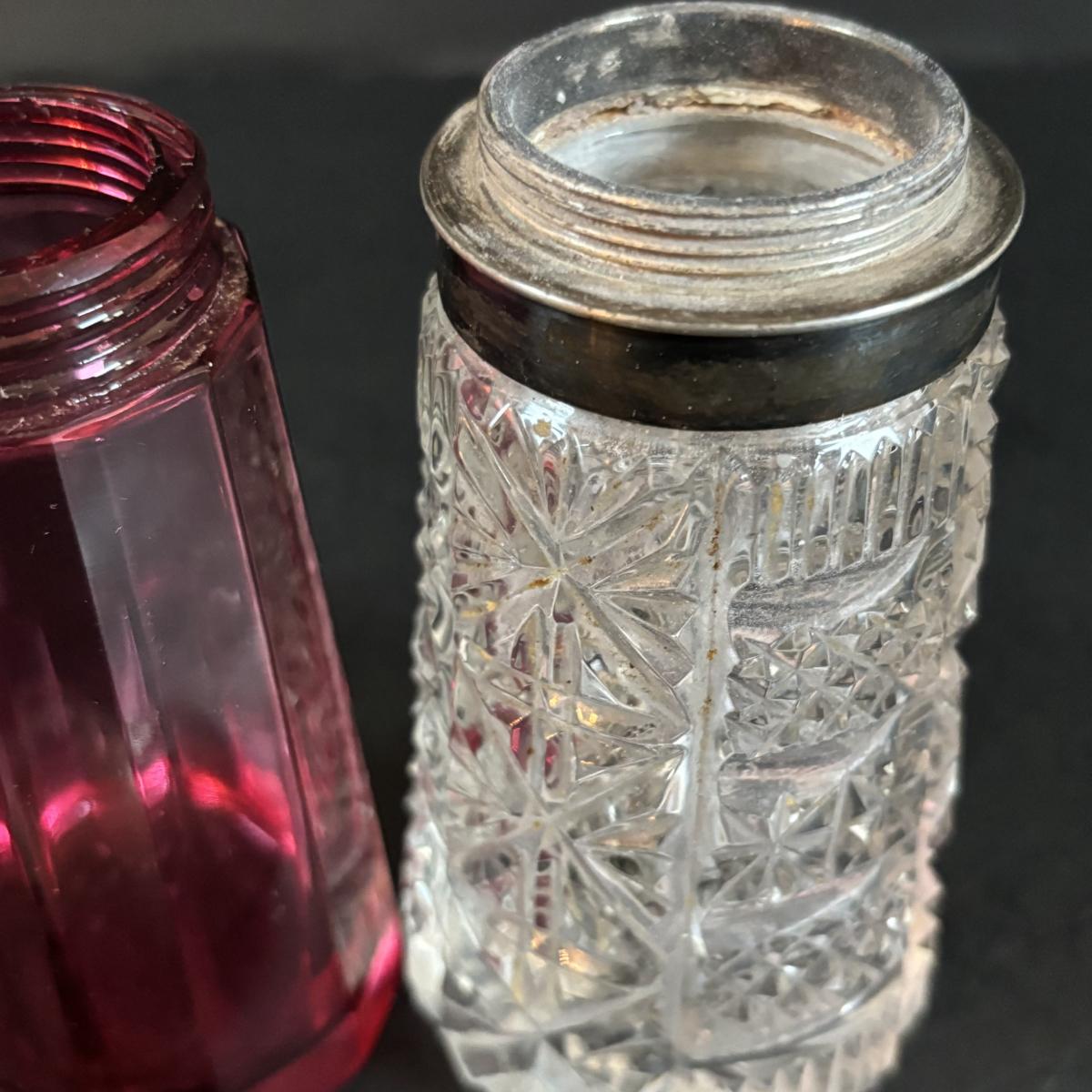 LOT 309: Vintage Biscuit Jars: Floral Glazed Porcelain & Glass, Cranberry Glass Sugar Shaker, Crystal Sugar Shaker, Hammer Aluminum Trays & More