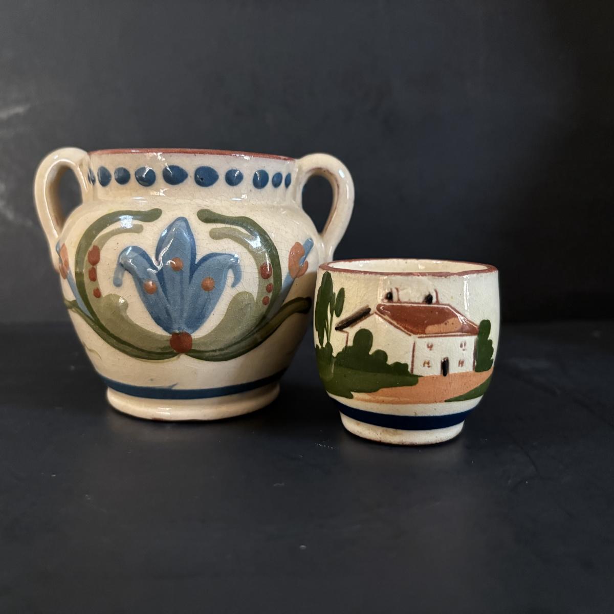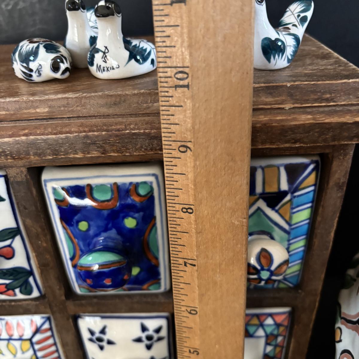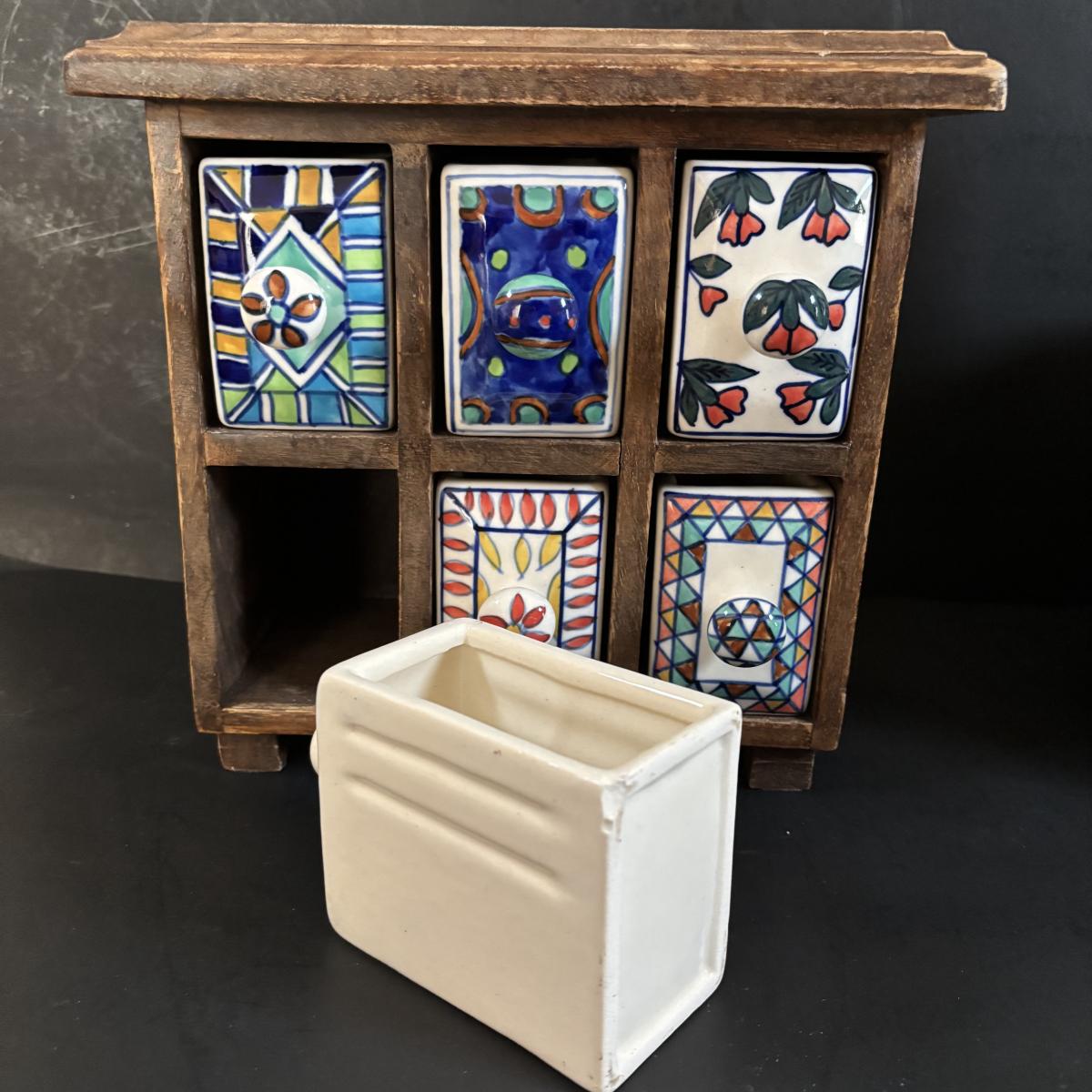 LOT 313: Wooden & Ceramic Apothecary/Spice Cabinet, Hecho En Mexico Pottery Hen Planter, Pottery, Devon Motto Ware Egg Cup & More