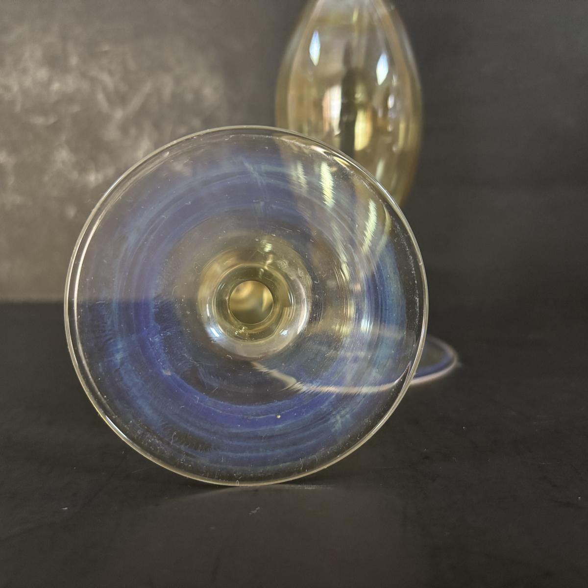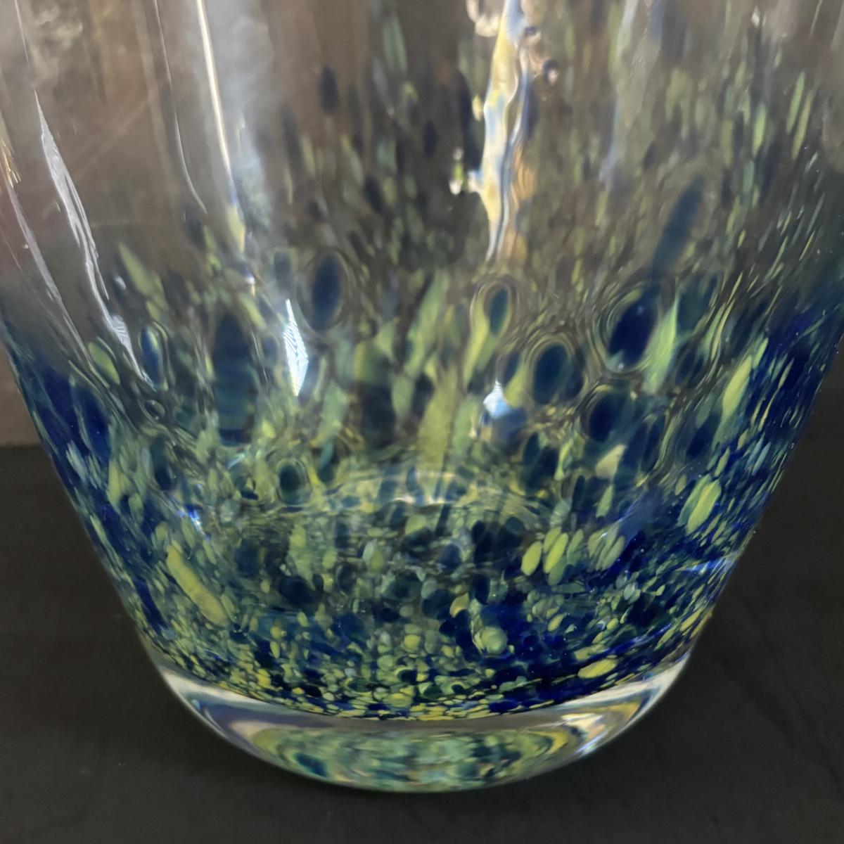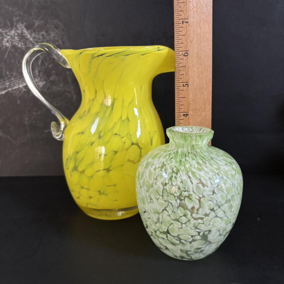 LOT 317: Art Glass Yellow Pitcher & Green Confetti Bud Vase, Delicate Glass Candlestick w/a hint of Yellow, LE Smith Flower Basket, Blue Green Yellow Confetti to Clear Vase