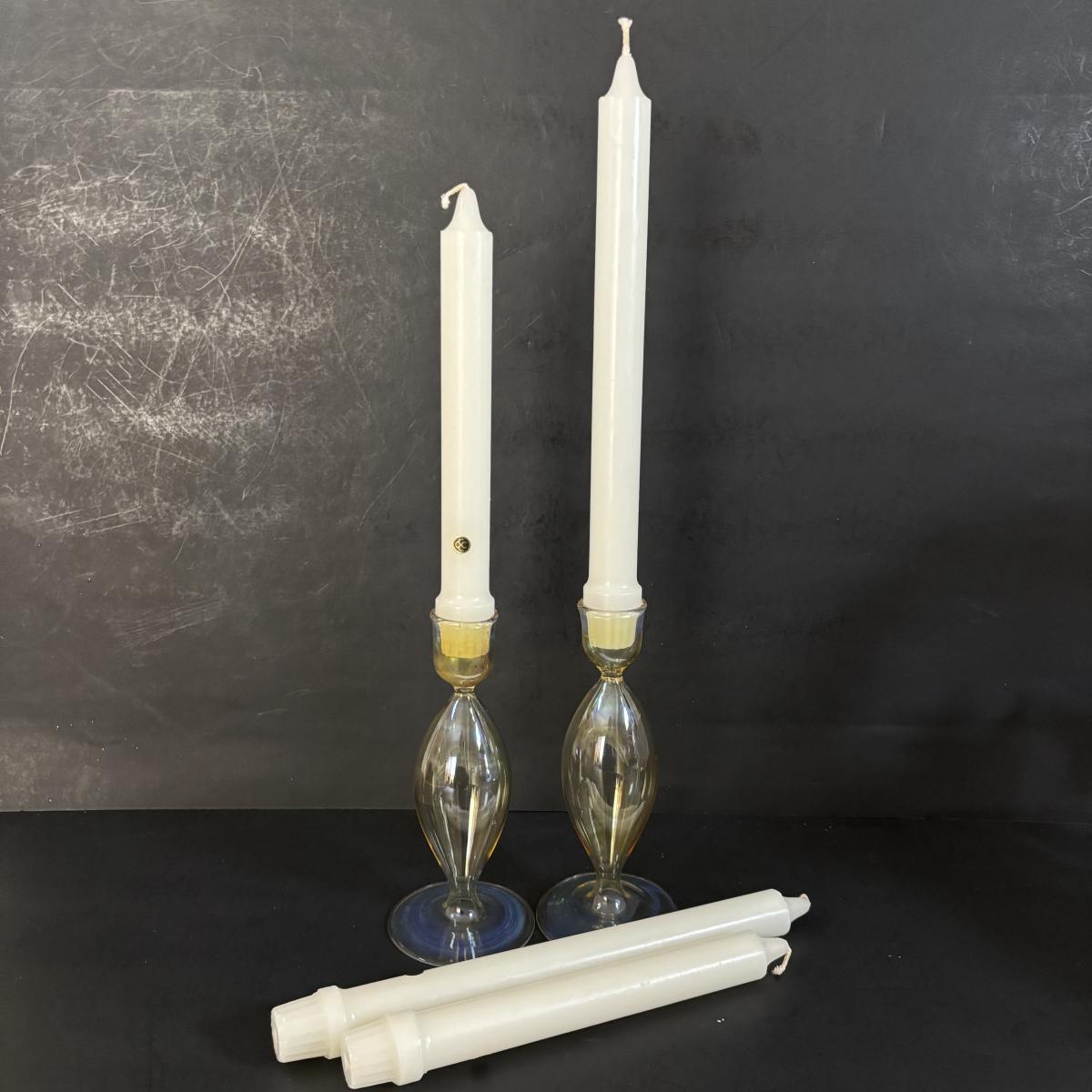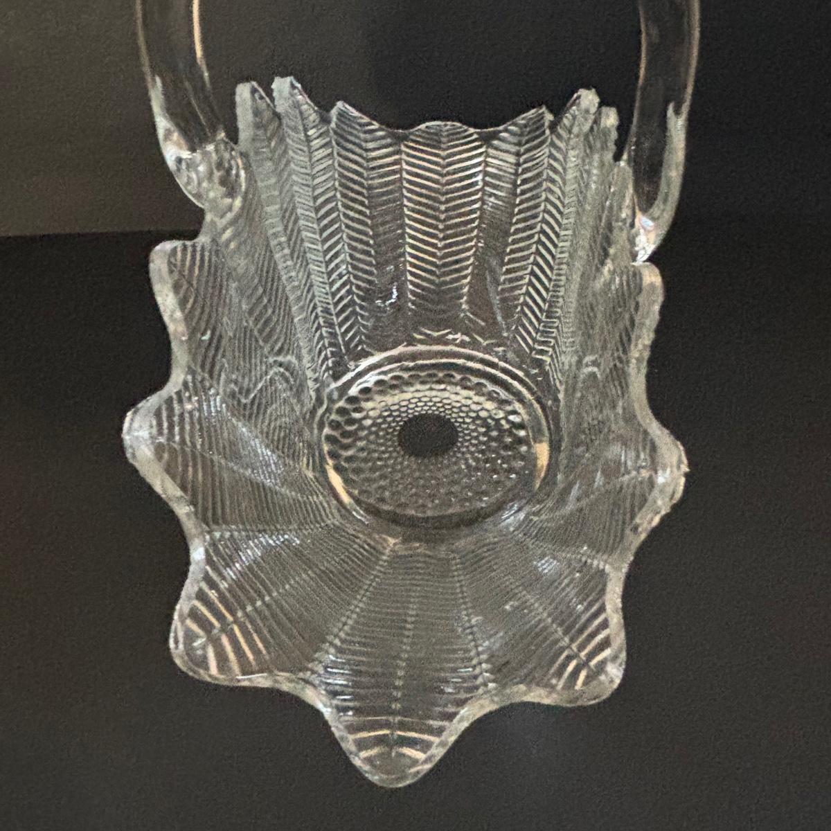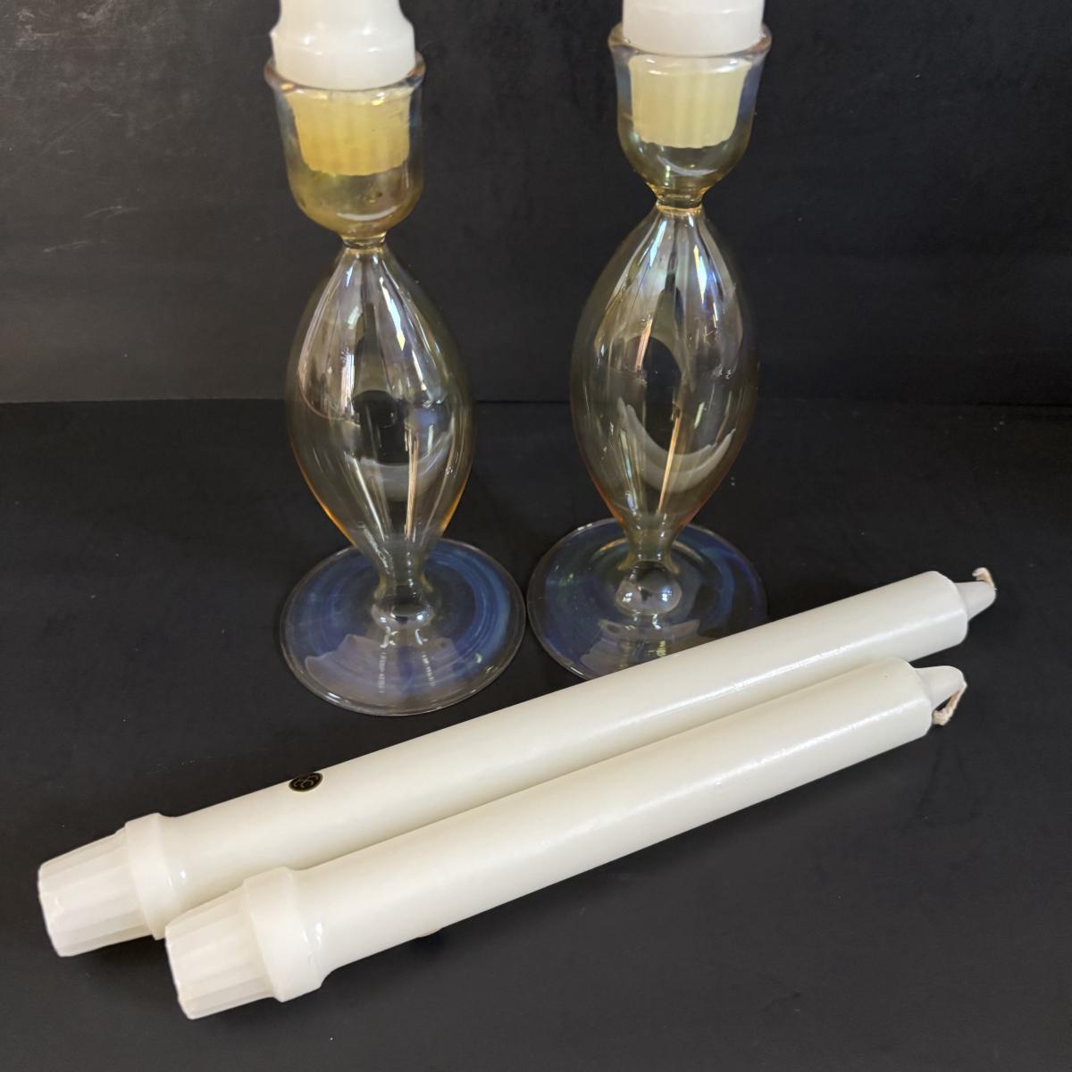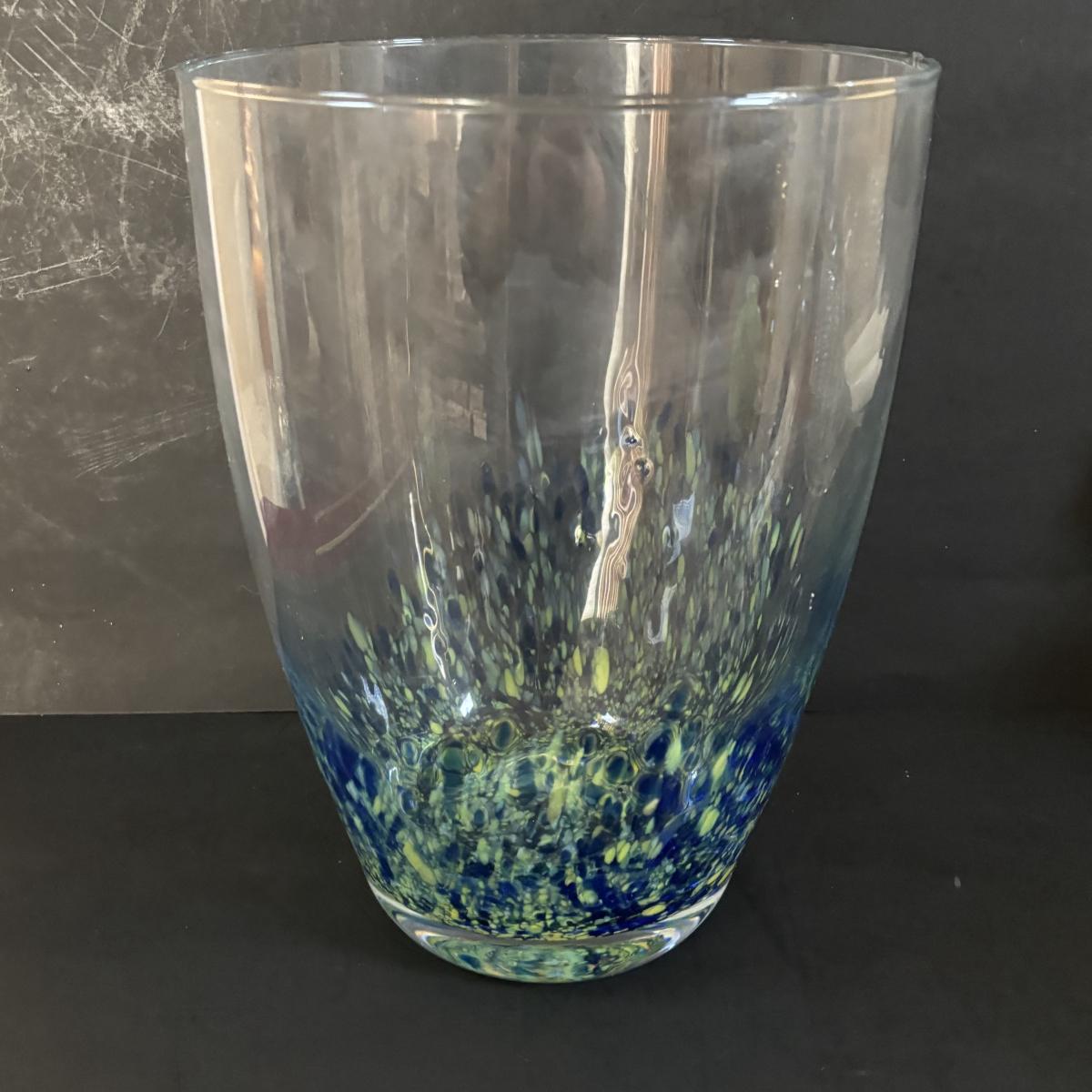 LOT 317: Art Glass Yellow Pitcher & Green Confetti Bud Vase, Delicate Glass Candlestick w/a hint of Yellow, LE Smith Flower Basket, Blue Green Yellow Confetti to Clear Vase