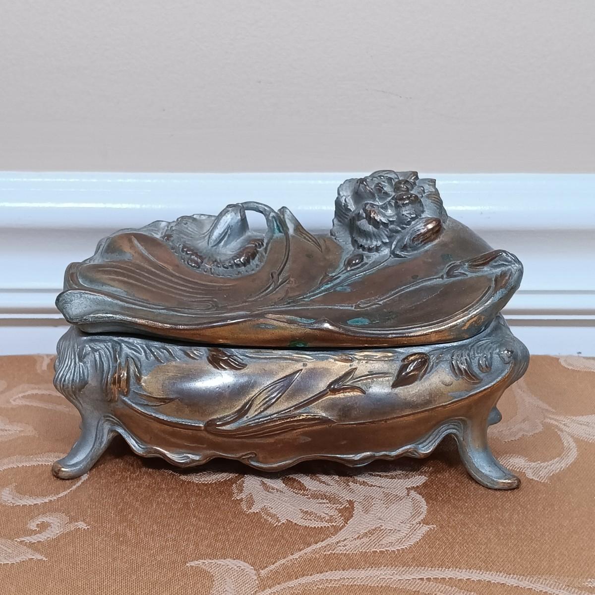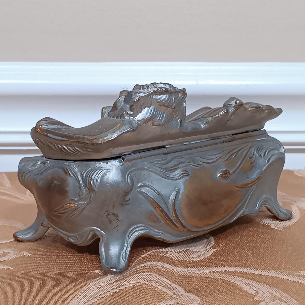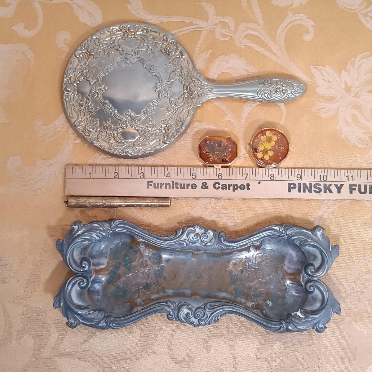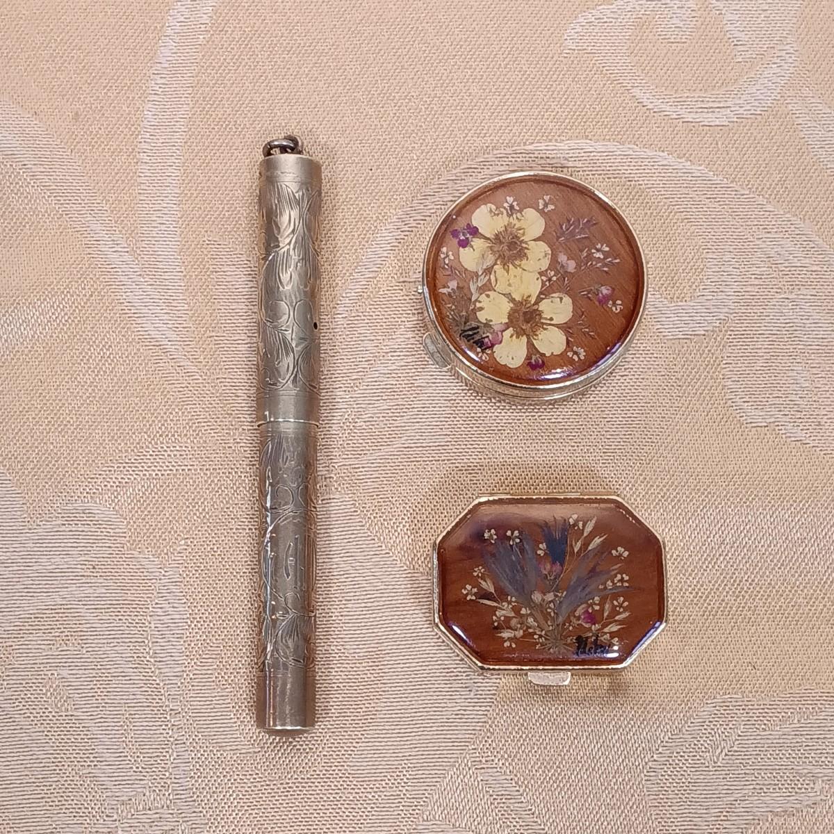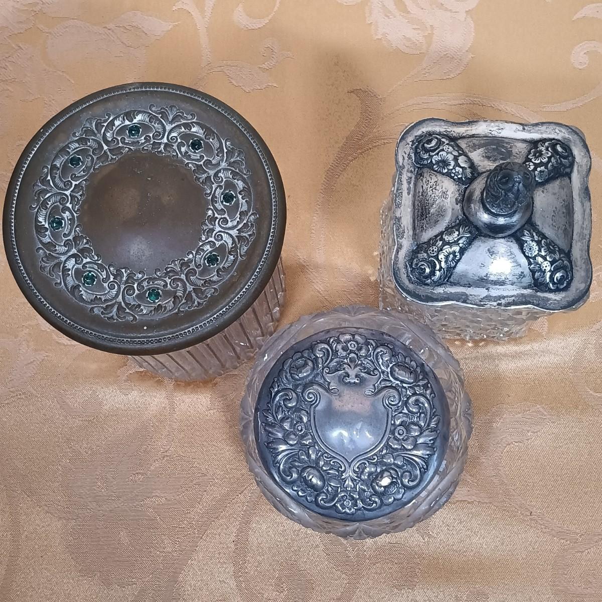 LOT 345: Antique J.B. Art Nouveau Jewelry Box, Crystal Powder Jars, Small Engraved Metal Fountain Pen & More