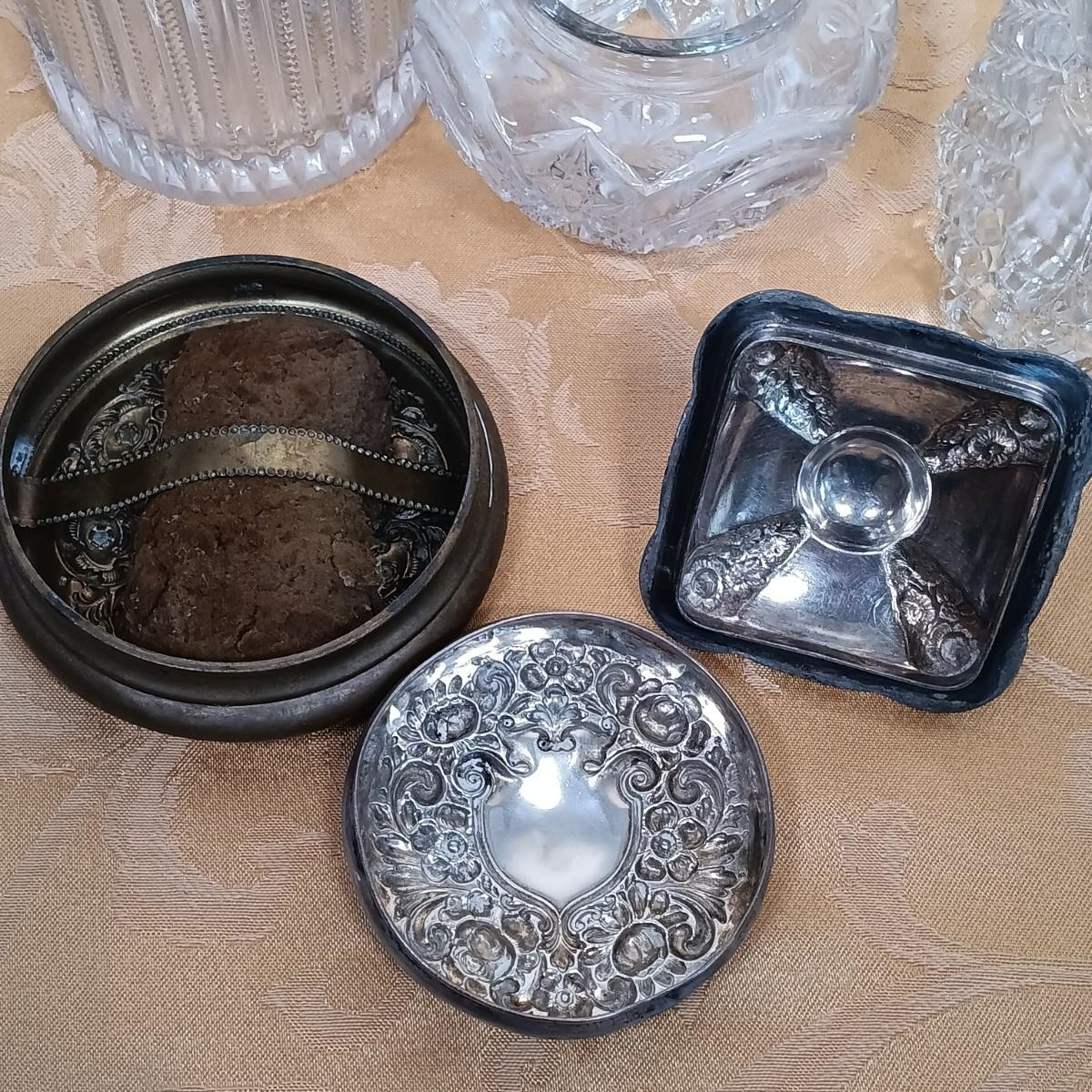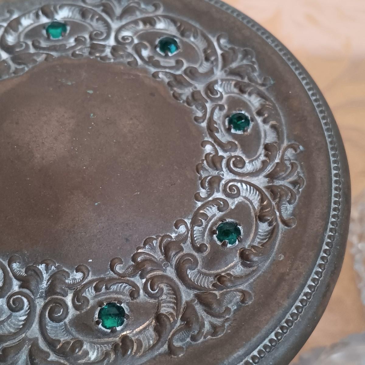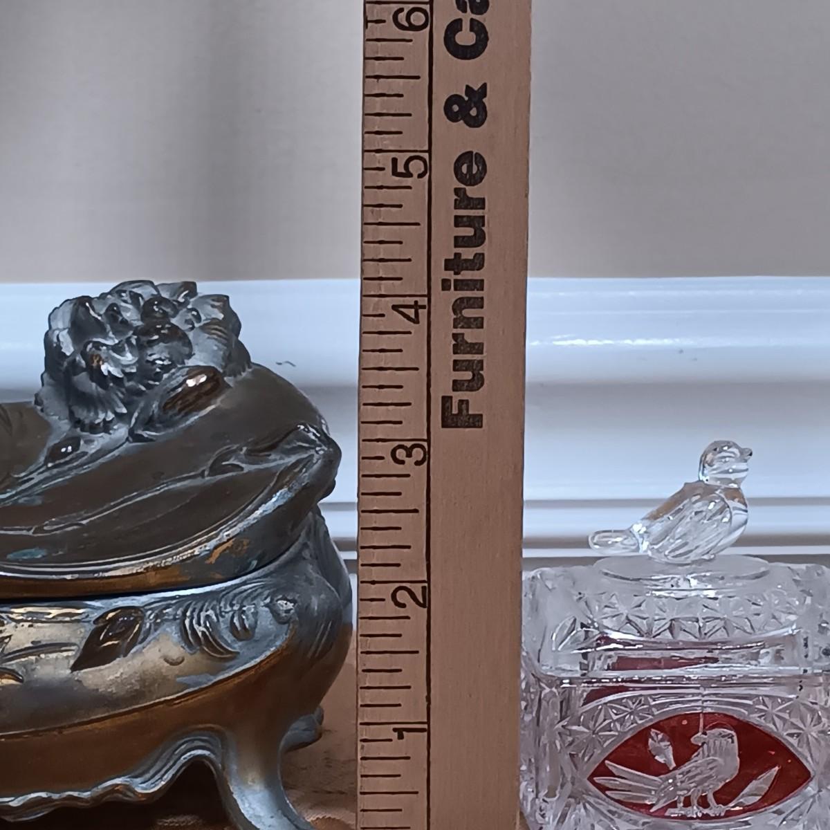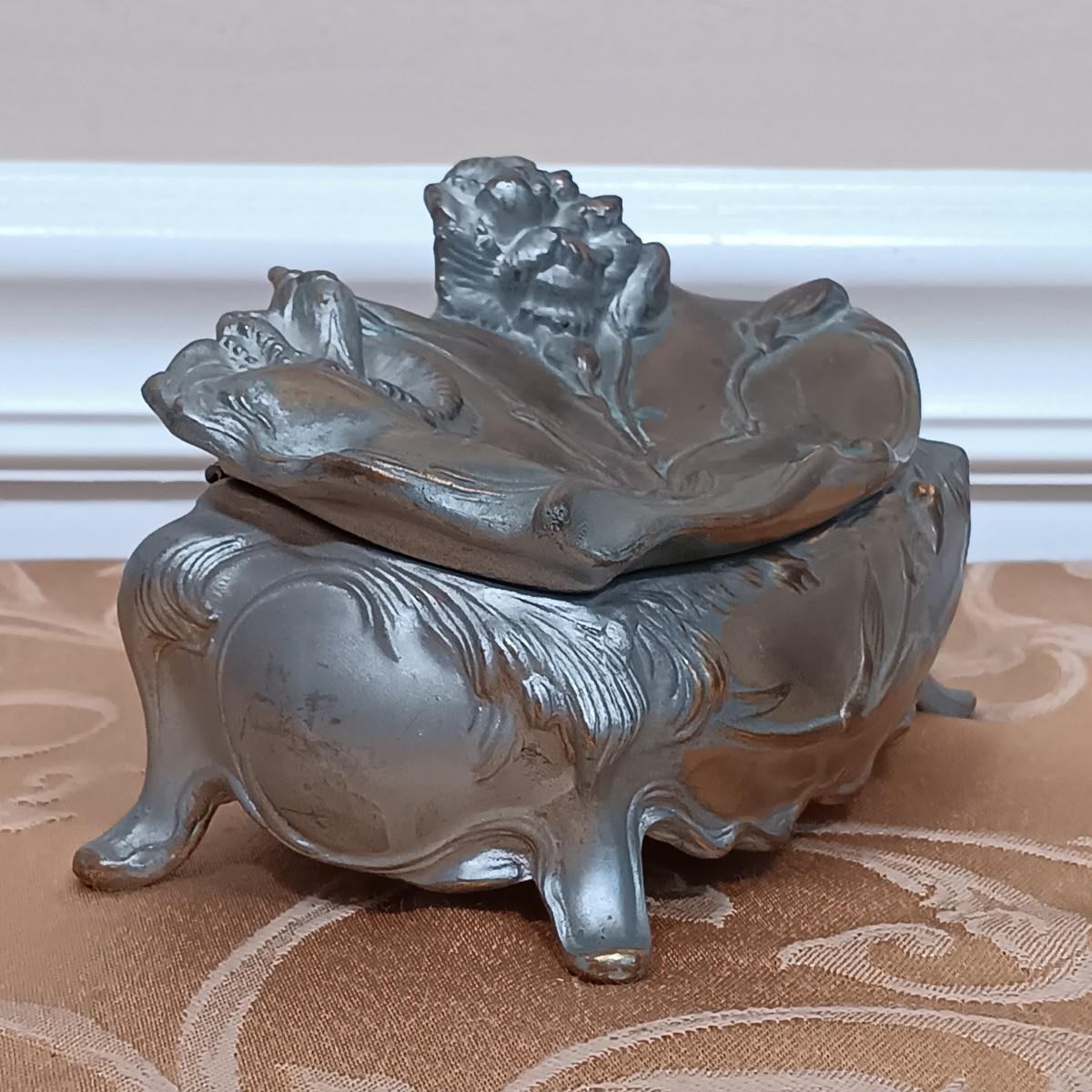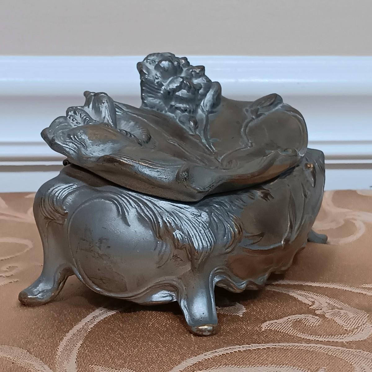 LOT 345: Antique J.B. Art Nouveau Jewelry Box, Crystal Powder Jars, Small Engraved Metal Fountain Pen & More