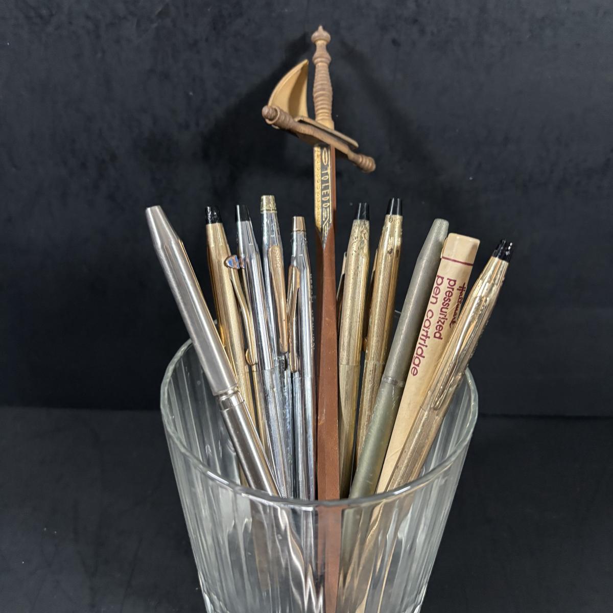 LOT 352: Cross Pen Collection along w/Chromatic & Wooden Pens & Signed Print