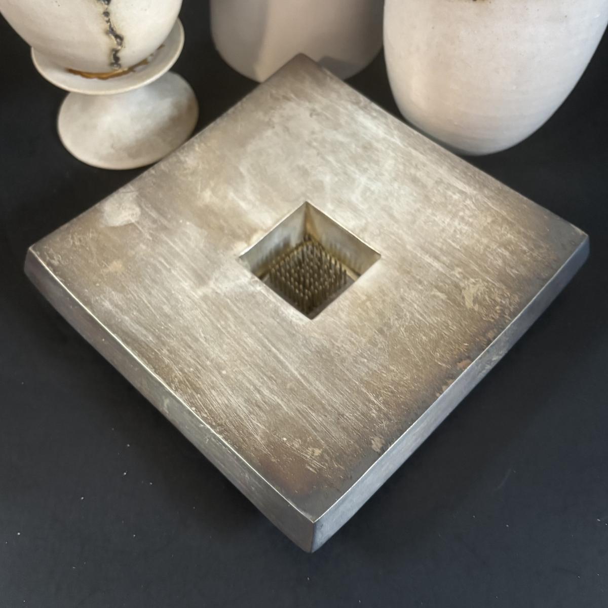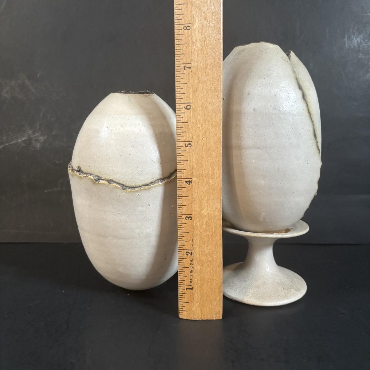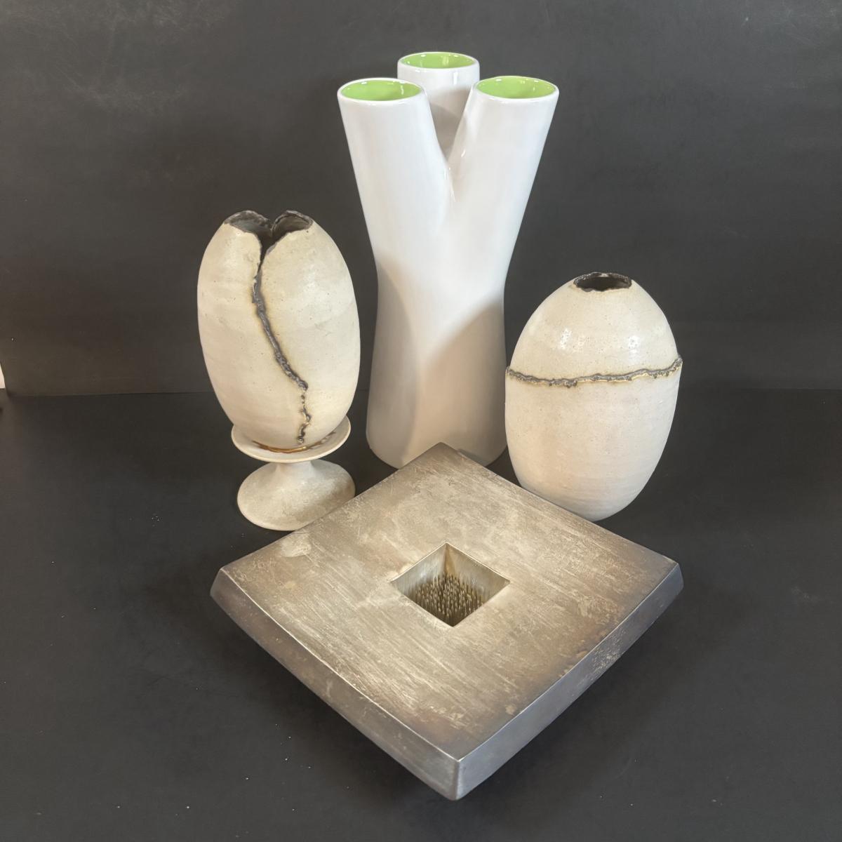LOT 360: Pottery Egg Shaped Vases,Design by Designwright Upside Down Vase, Pottery Barn Square Metal Flower Holder w/Flower Frog