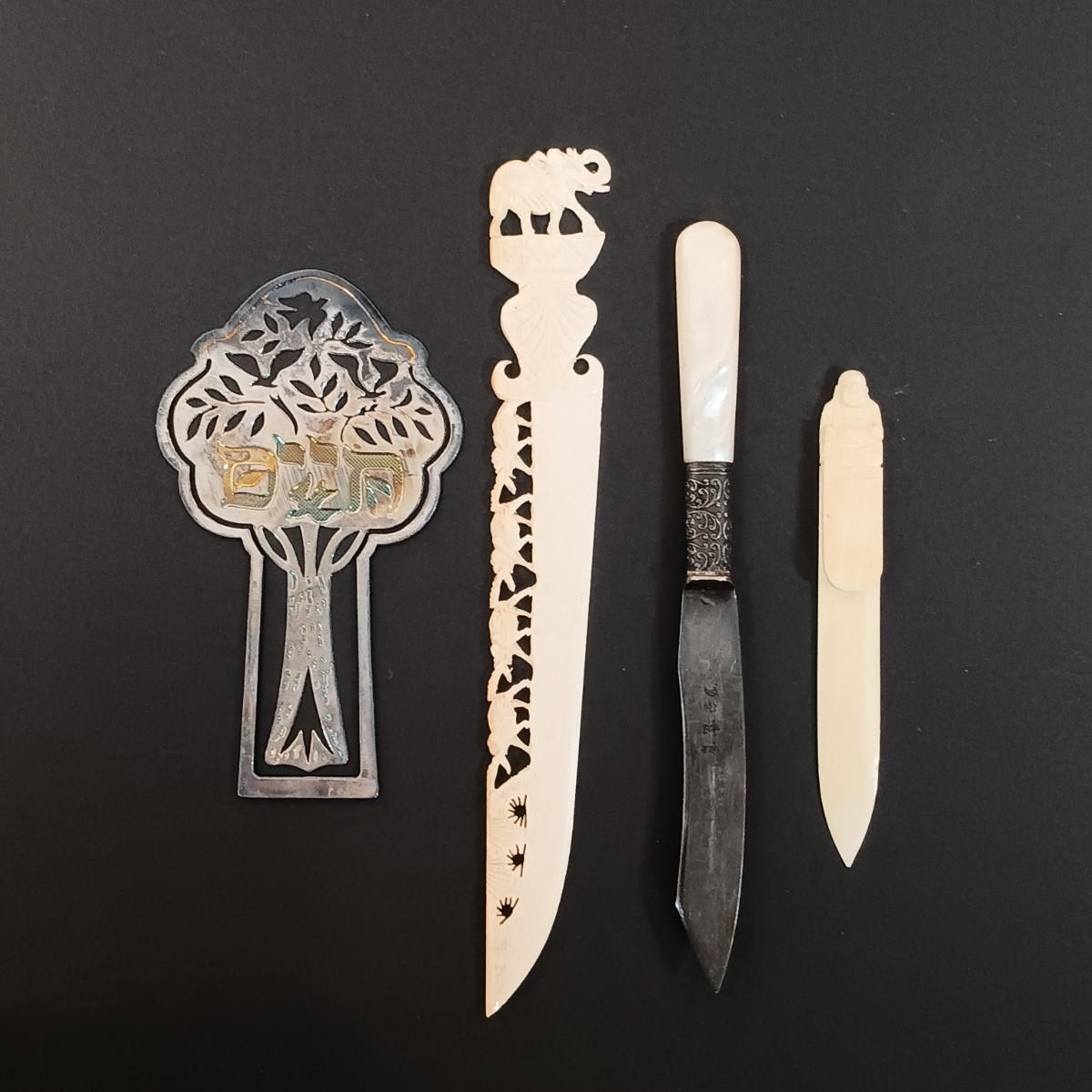 LOT 436: A Little Museum Collection- Folding Metal Book End, Stylized Letter Openers, Woven Shawl, Beaded Hummingbird & More