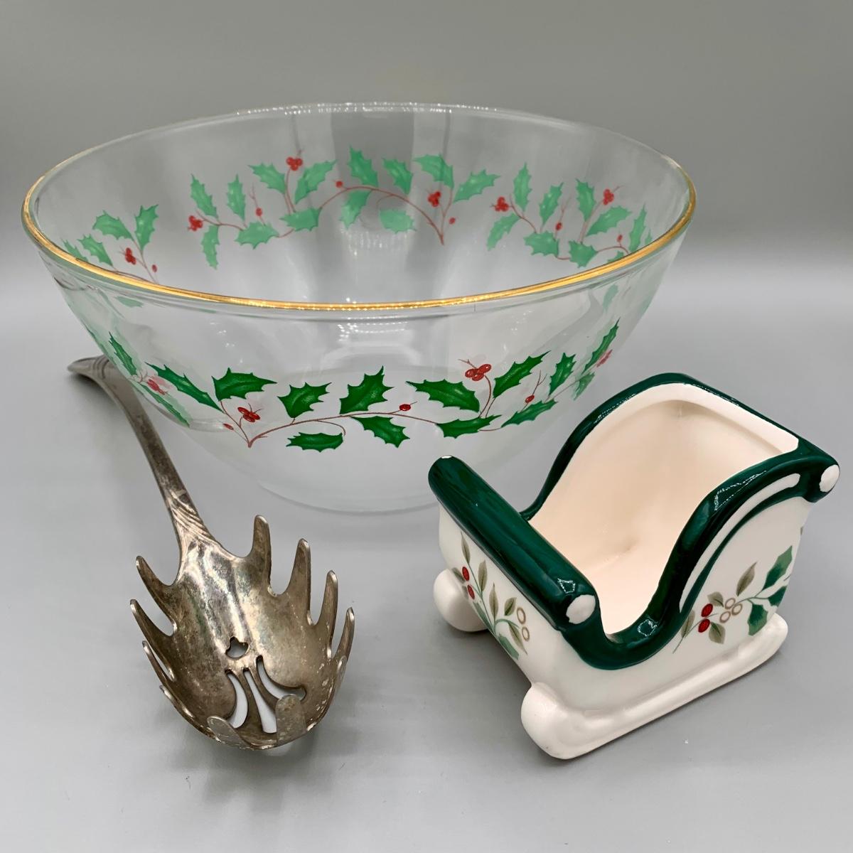 LOT 27 L: Lenox Holiday Dimension Collection Bowl, Silverplate Serving Spoon, Pfaltzgraff "Winterberry" Sweetener Holder, & More