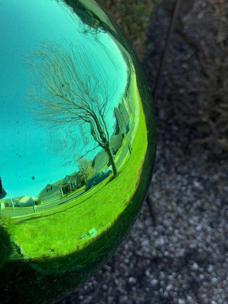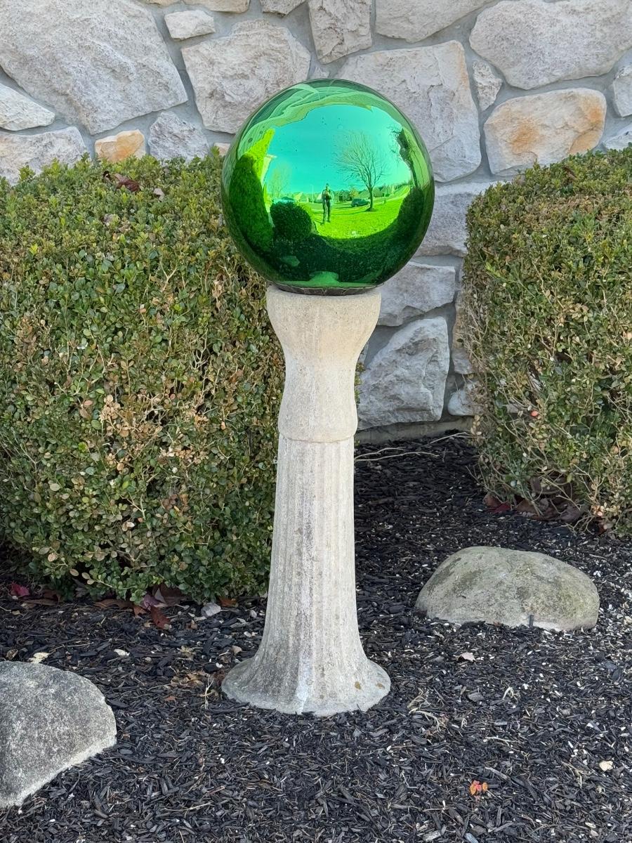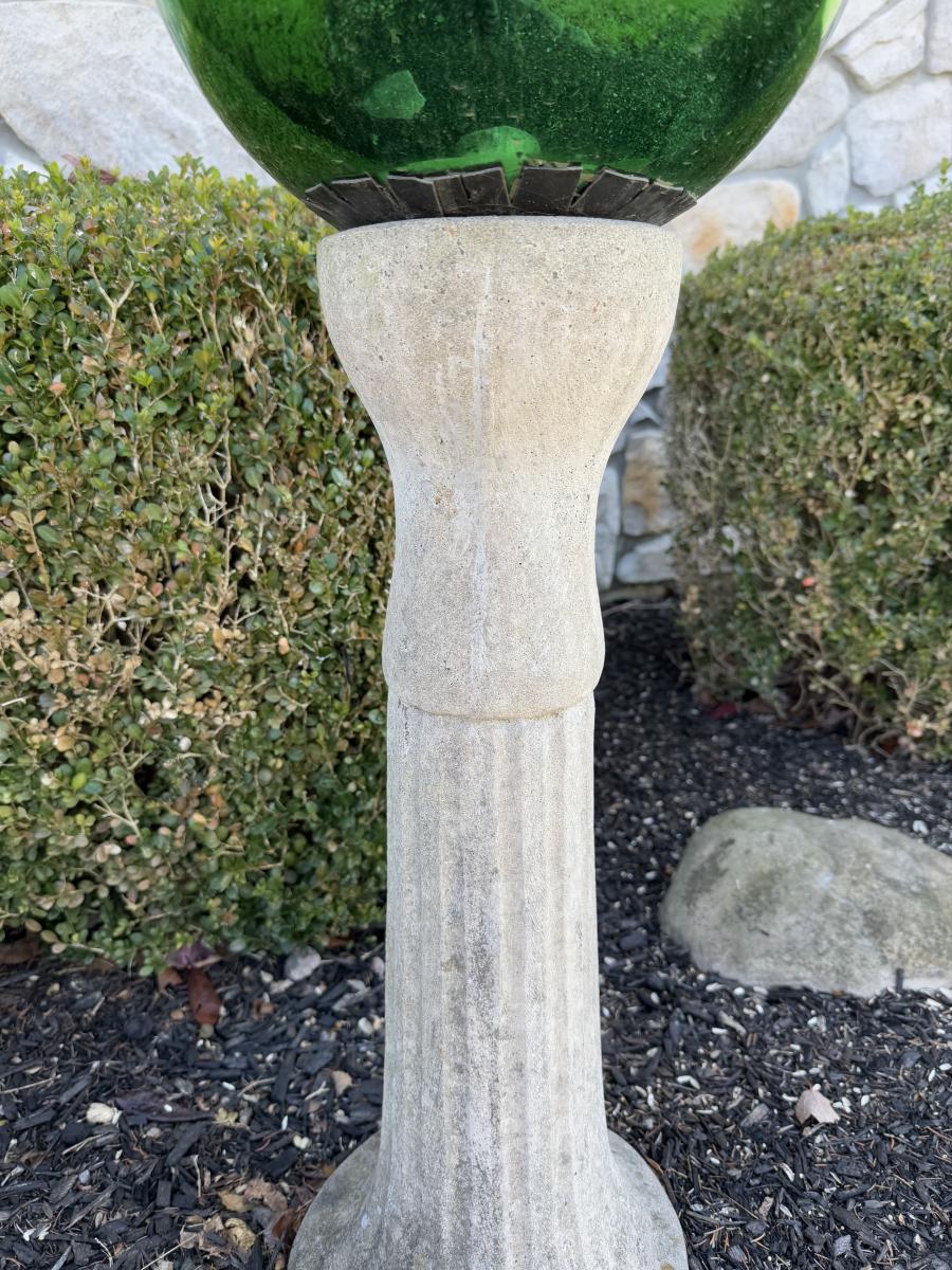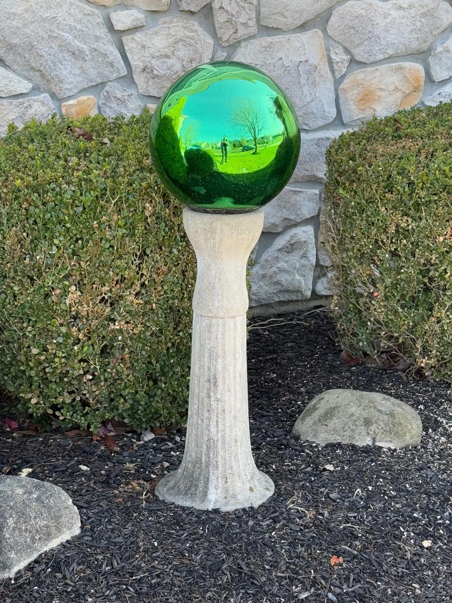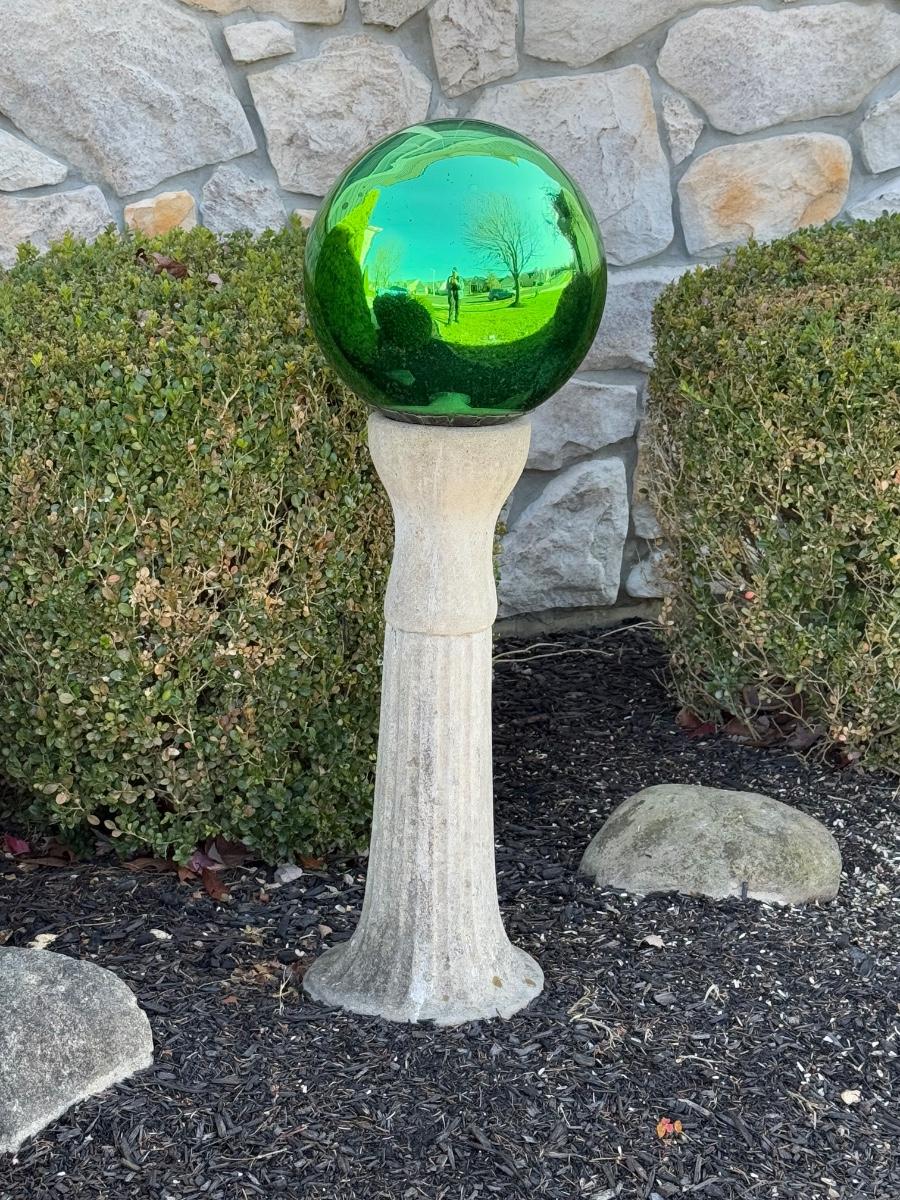 LOT 121Y: Green Mirrored Gazing Ball w/ Concrete Stand