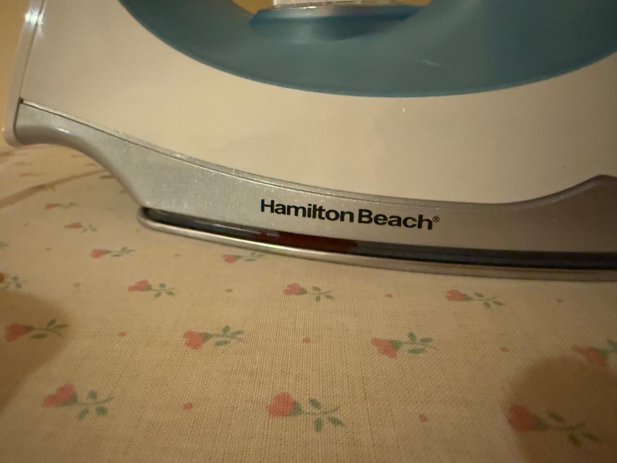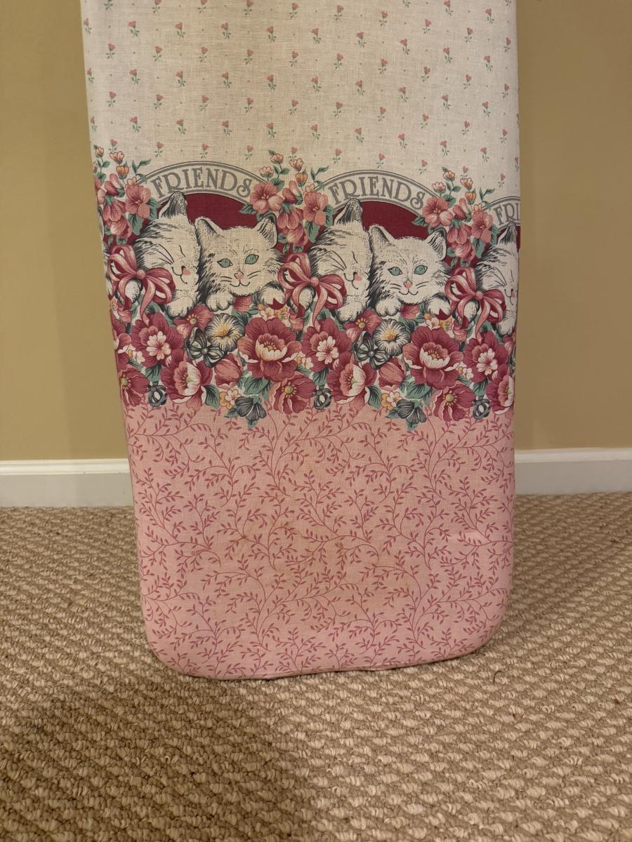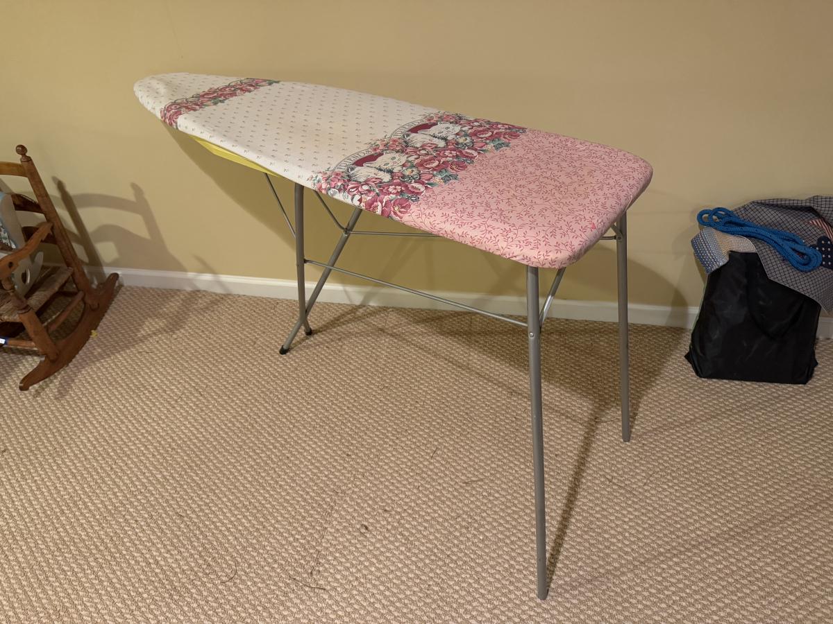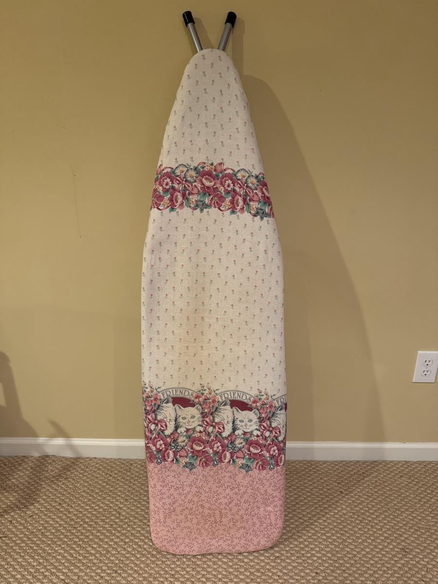 LOT 168B: Floral Cat Ironing Board, Buttoneer, Shoe Shine Kit & Hamilton Beach Iron Model 14010
