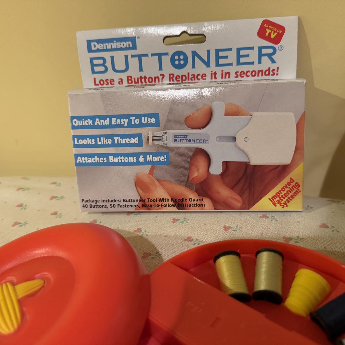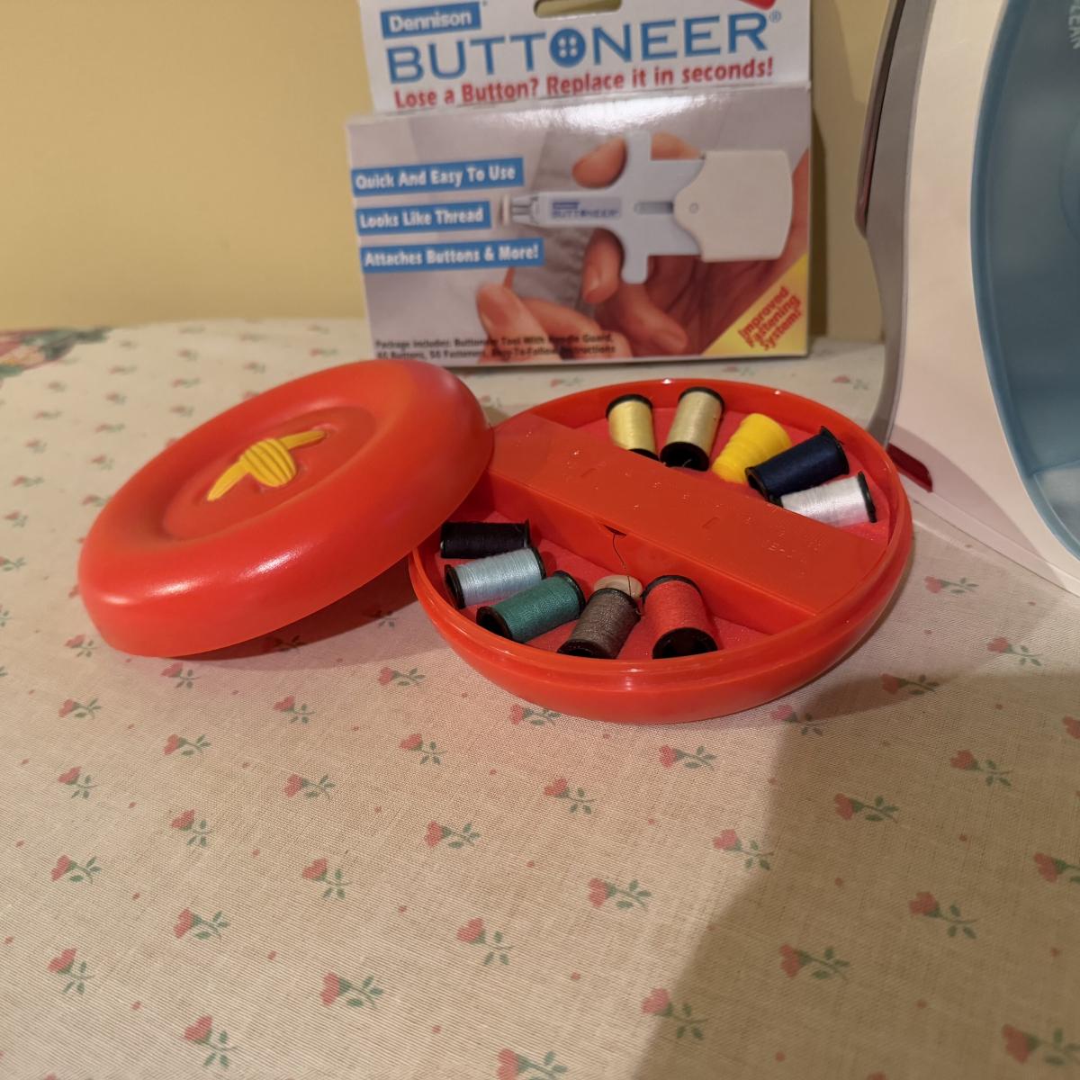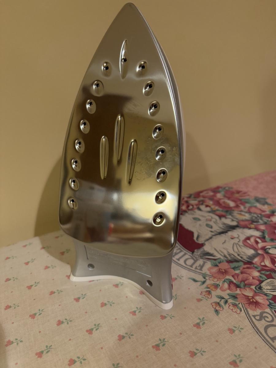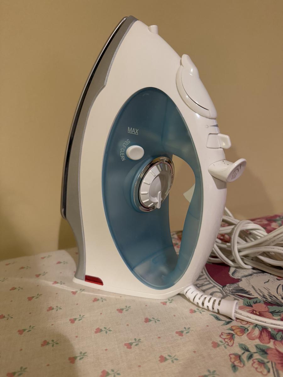 LOT 168B: Floral Cat Ironing Board, Buttoneer, Shoe Shine Kit & Hamilton Beach Iron Model 14010