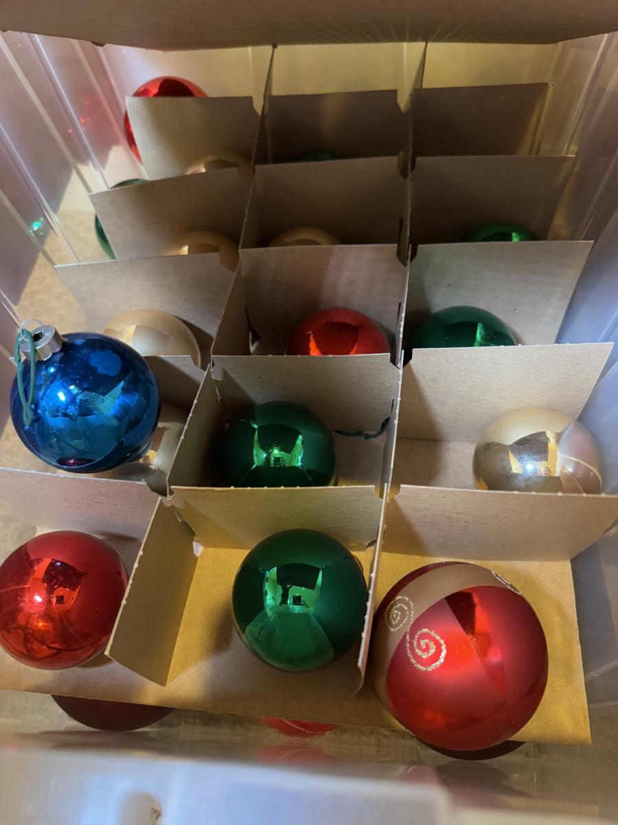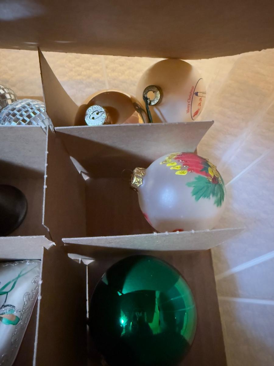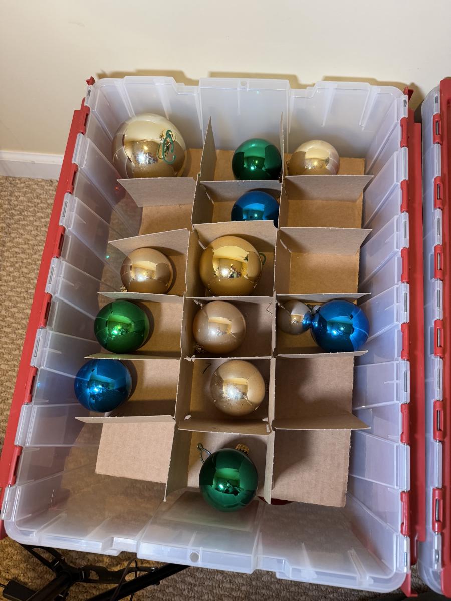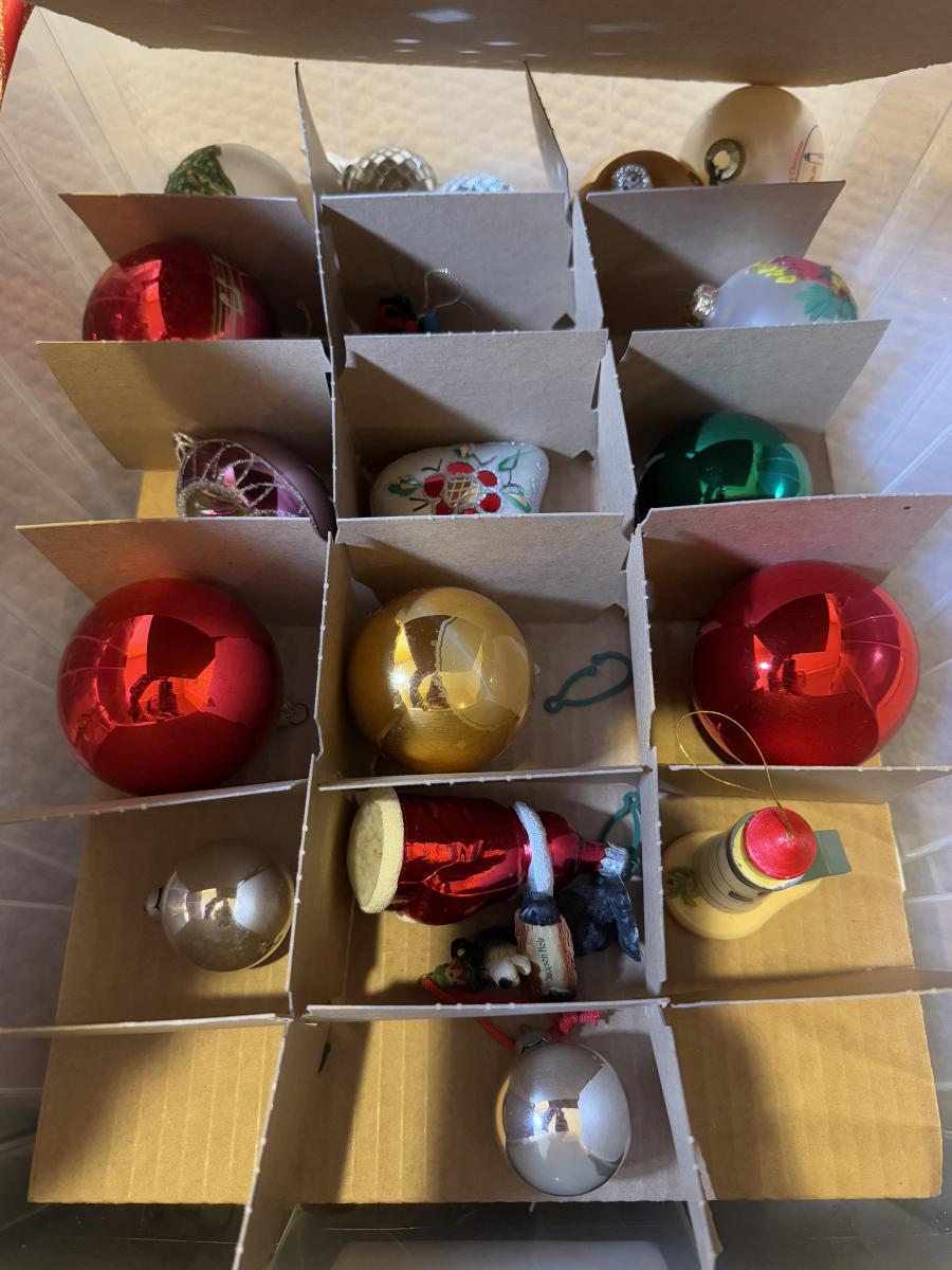 LOT 179B: Two Holiday Ornament Storage Totes w/ Glass Ornaments, Mini Tree