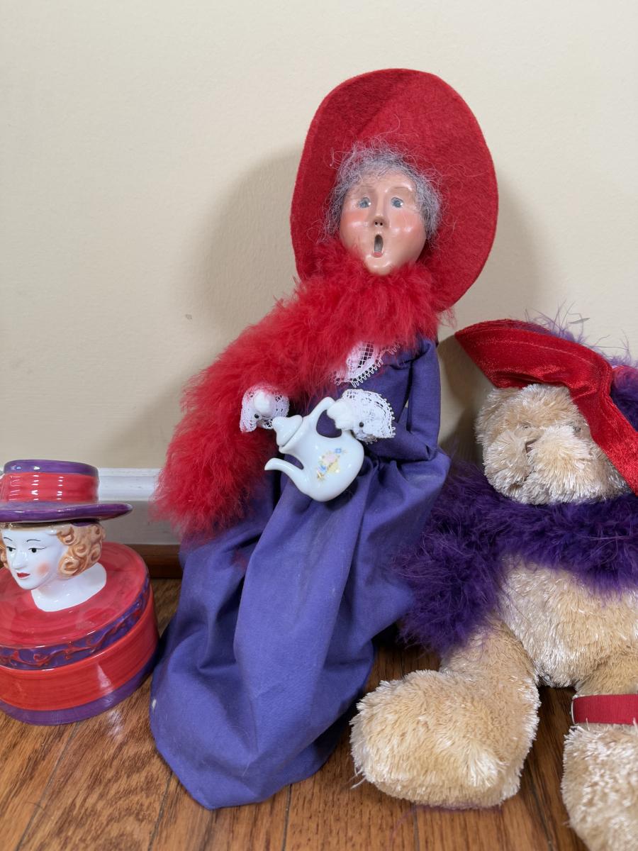 LOT 185N: Red Hat Lady Collection - Byer's Choice, Bear, Watch & Trinket Dish