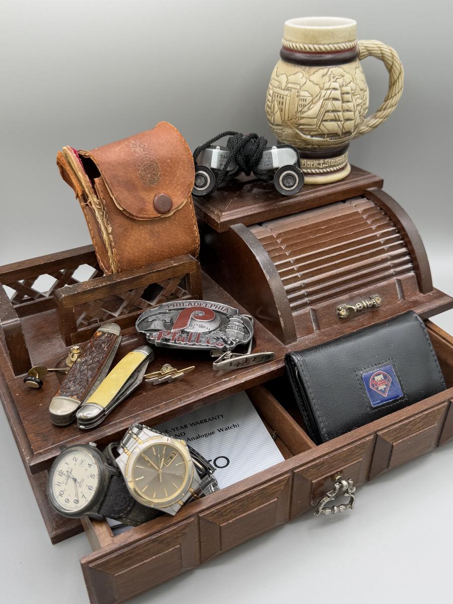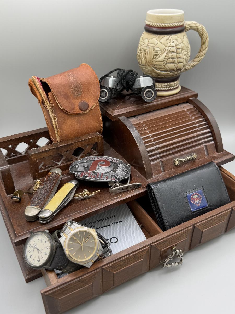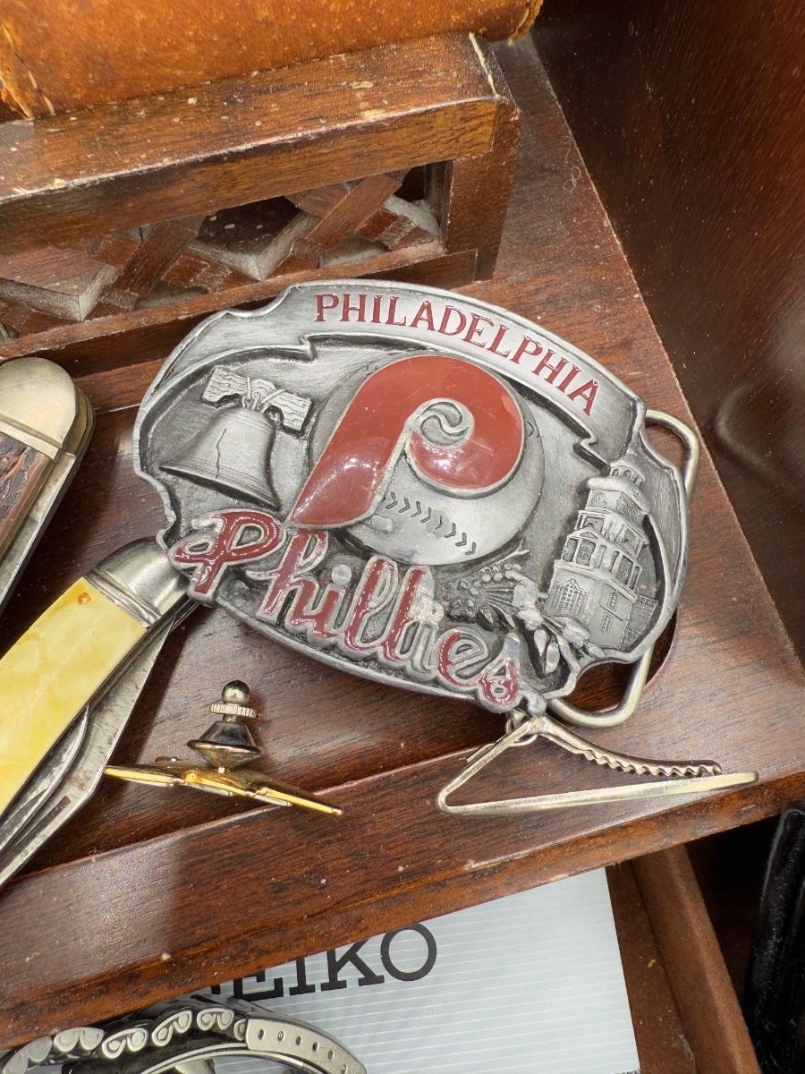LOT 199J: Vintage Desktop Organizer, Avon Ship Mug, Phillies Belt Buckle, Pocket Knives & More