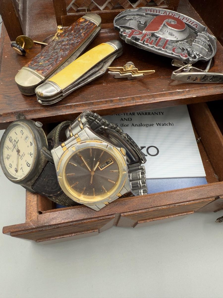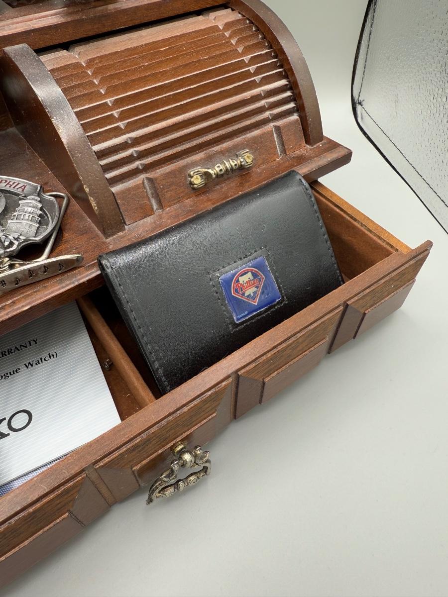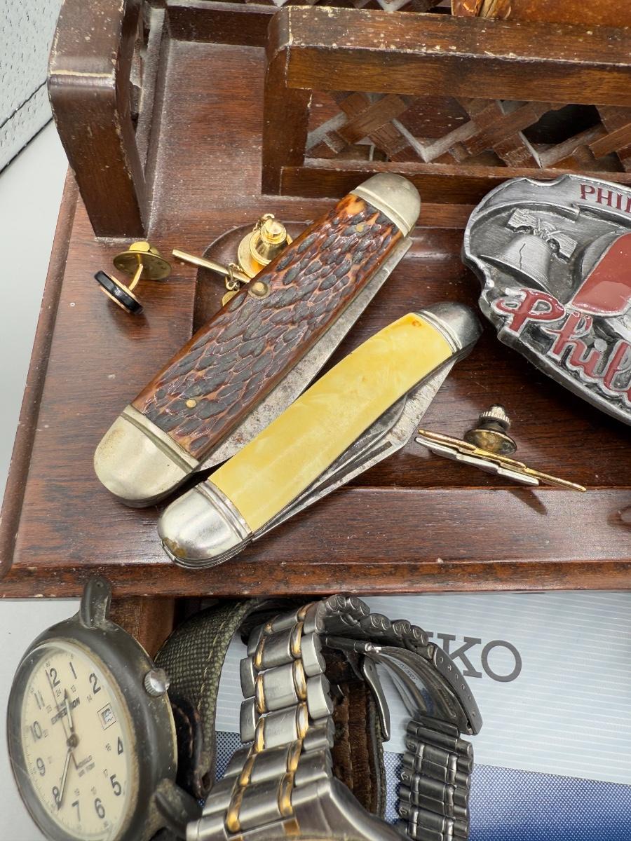 LOT 199J: Vintage Desktop Organizer, Avon Ship Mug, Phillies Belt Buckle, Pocket Knives & More
