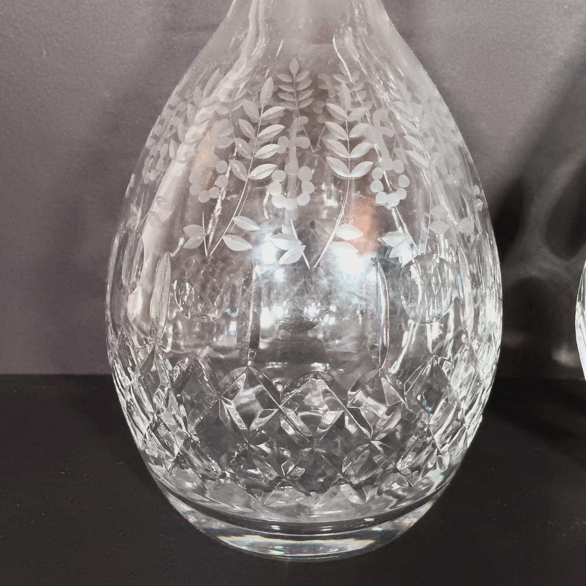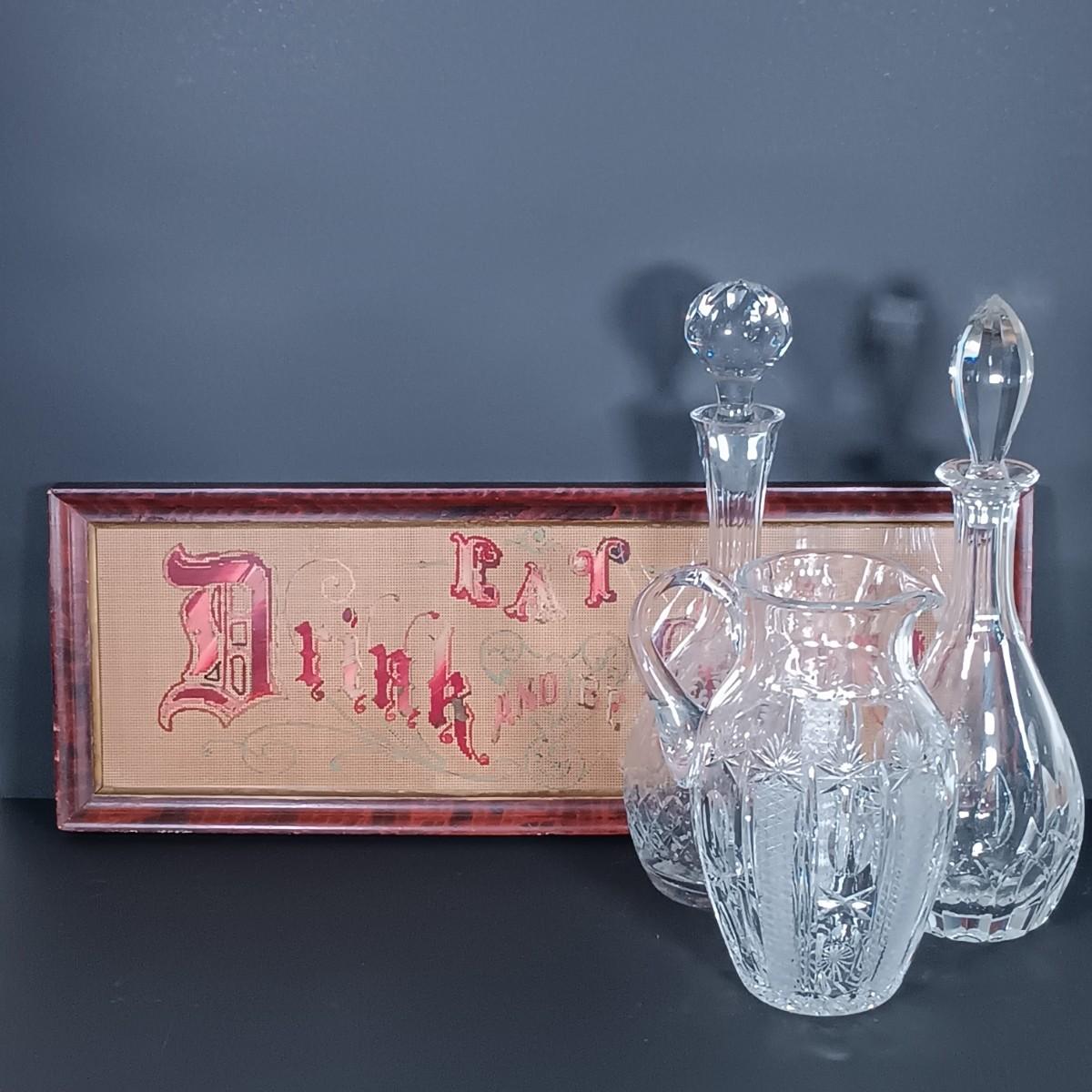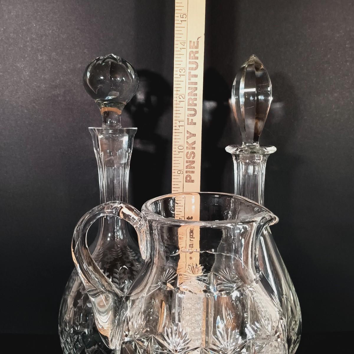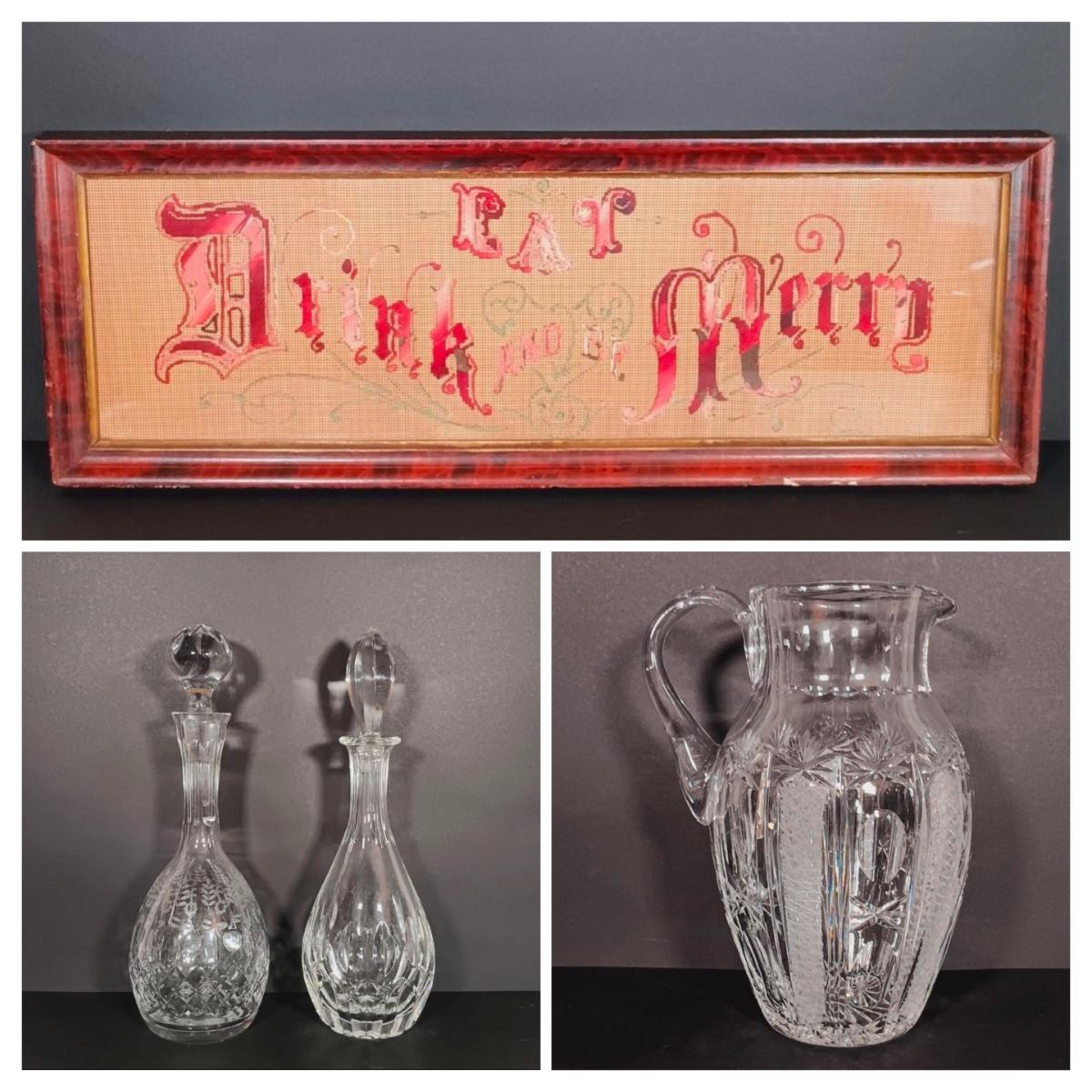 LOT 54: Antique Needlepoint with Crystal Decanters and Pitcher