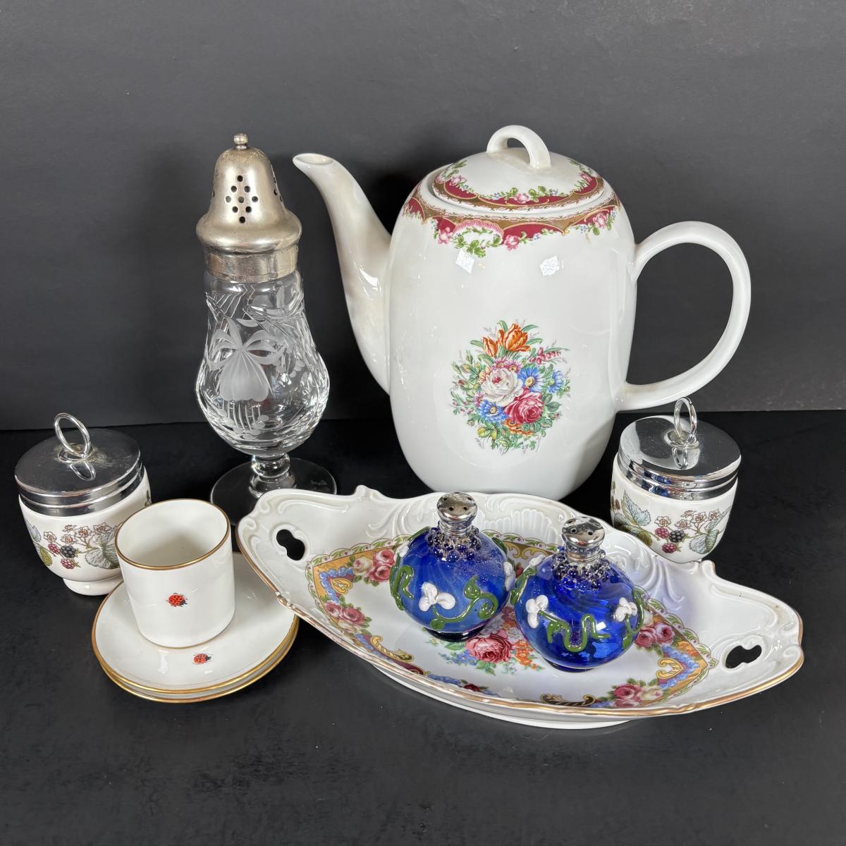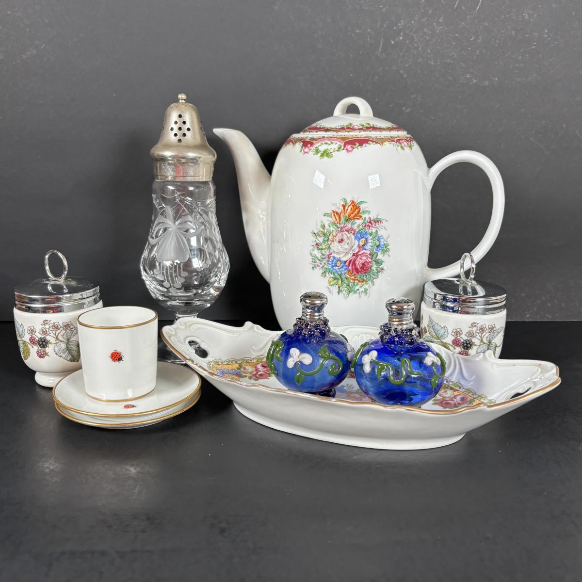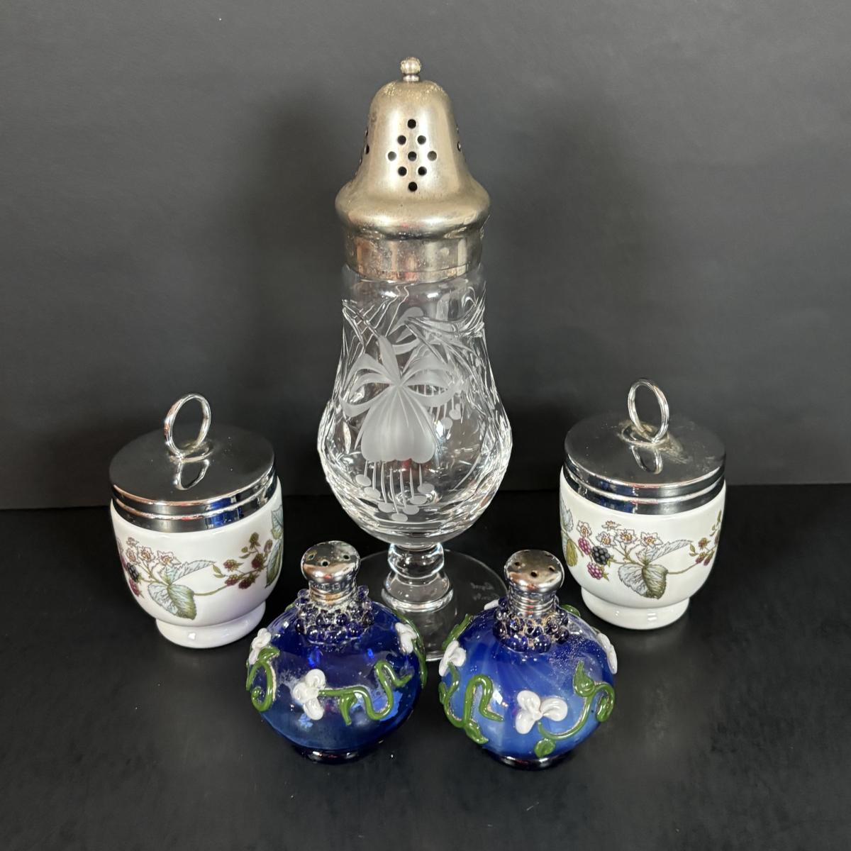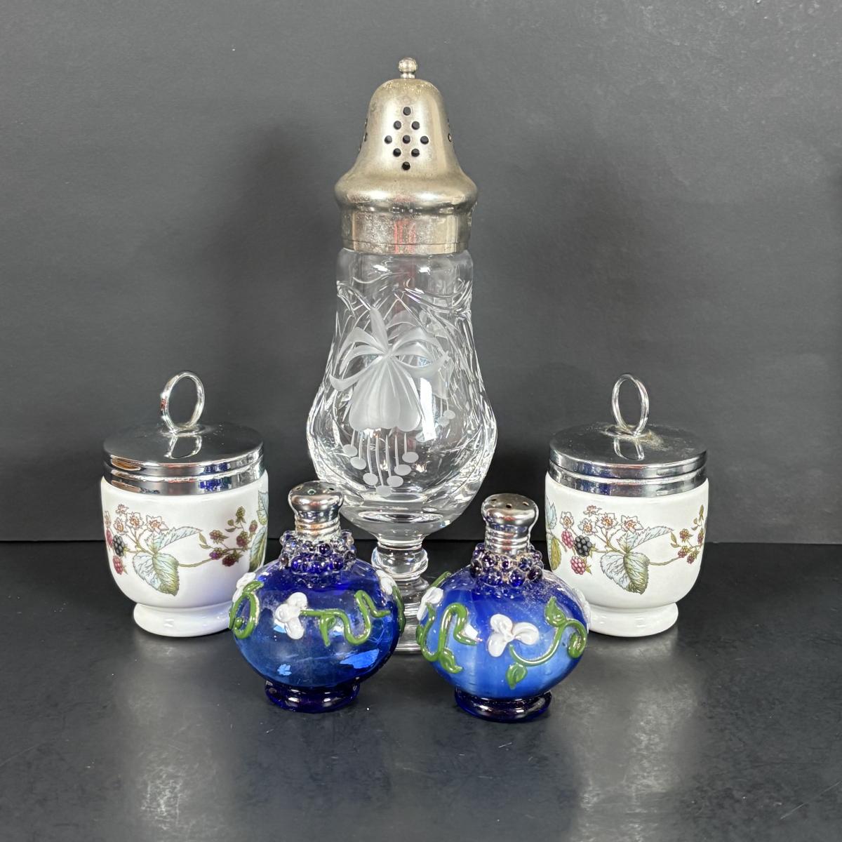 LOT 69: Royal Brierley Etched Sugar Shaker, Hand Blower Blue Salt/Pepper Shakers, Royal Worchester Egg Coddlers, Limoges