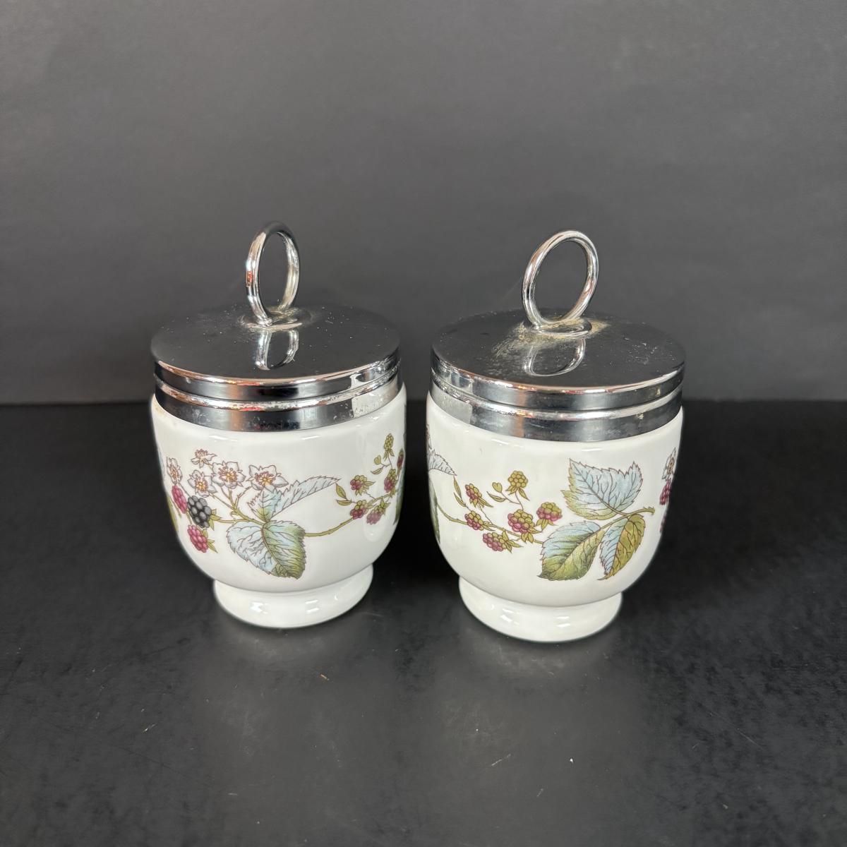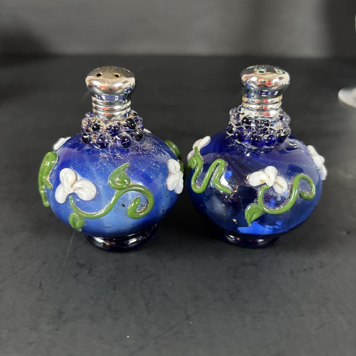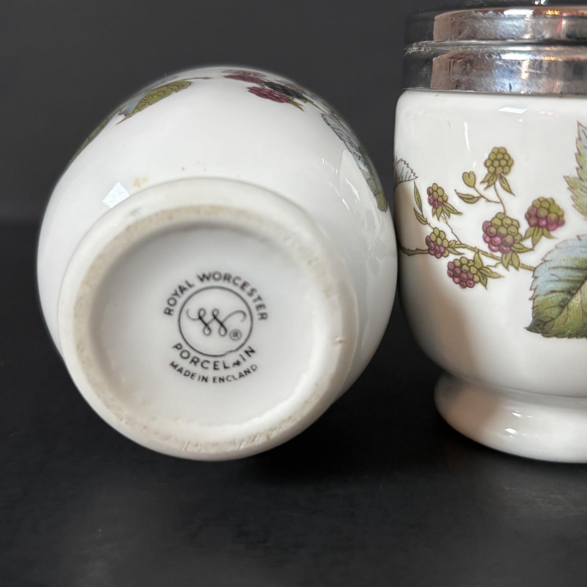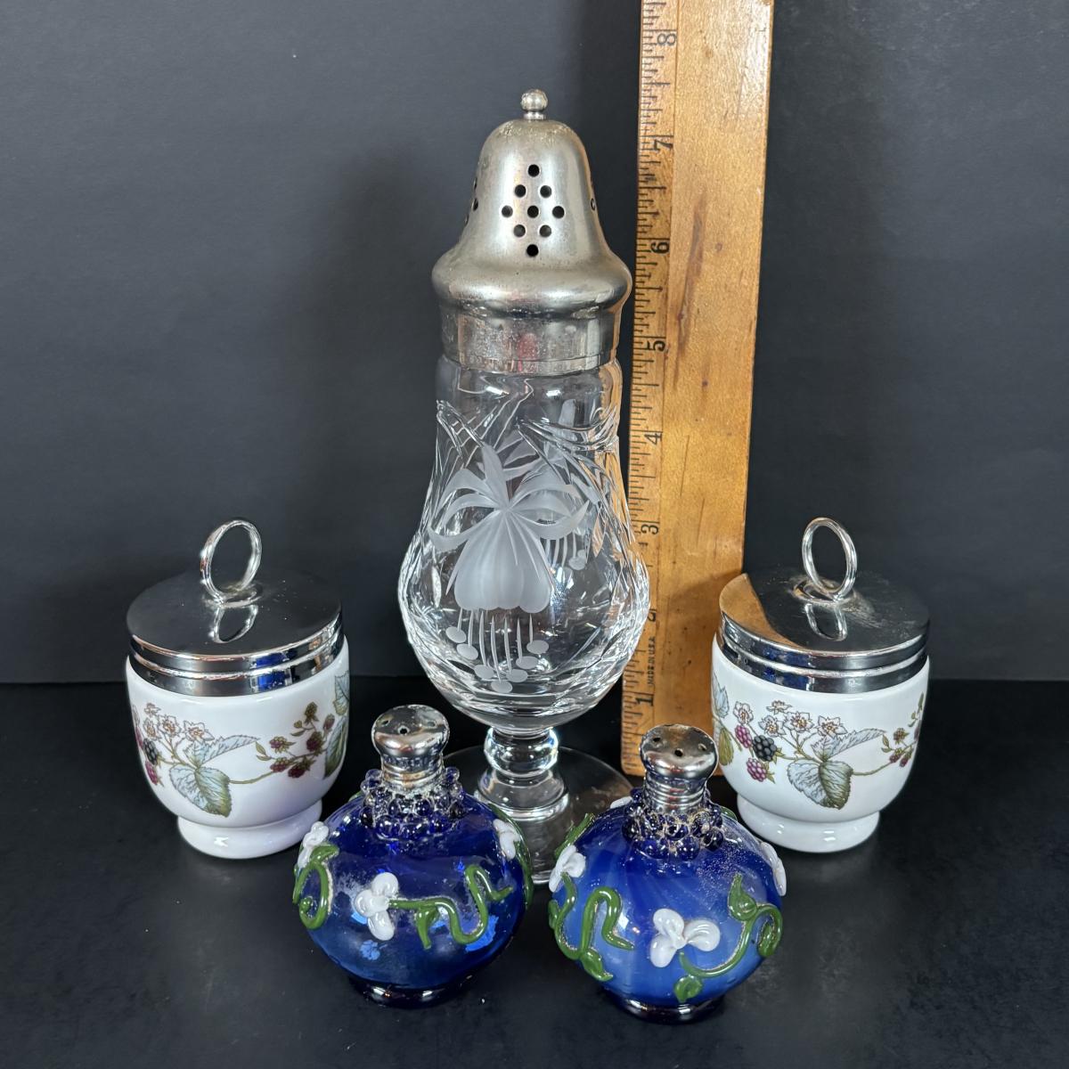 LOT 69: Royal Brierley Etched Sugar Shaker, Hand Blower Blue Salt/Pepper Shakers, Royal Worchester Egg Coddlers, Limoges