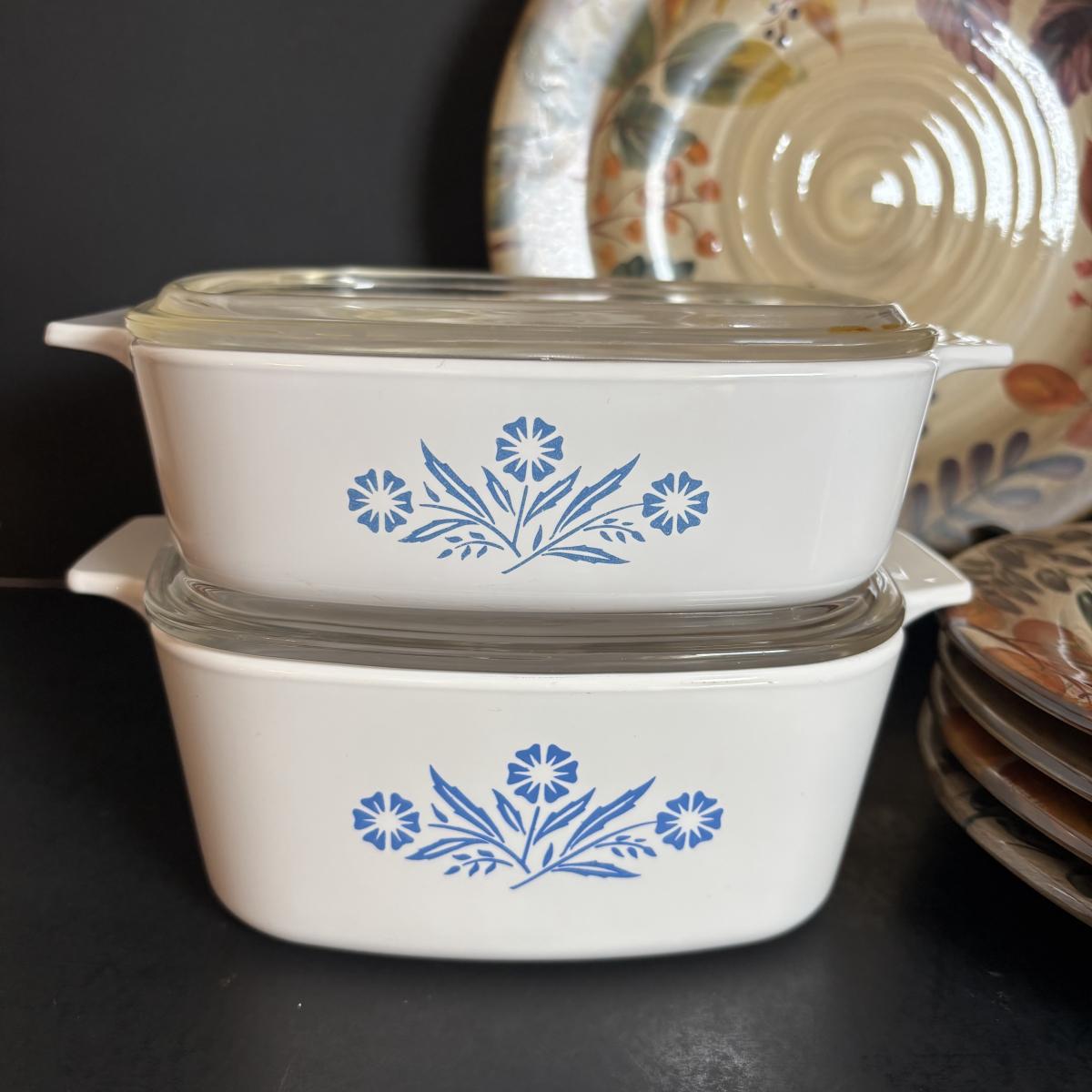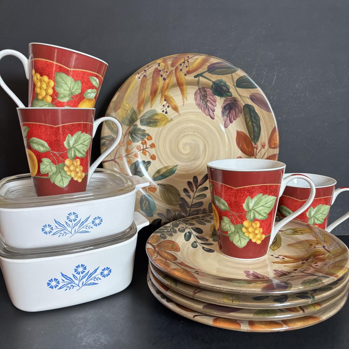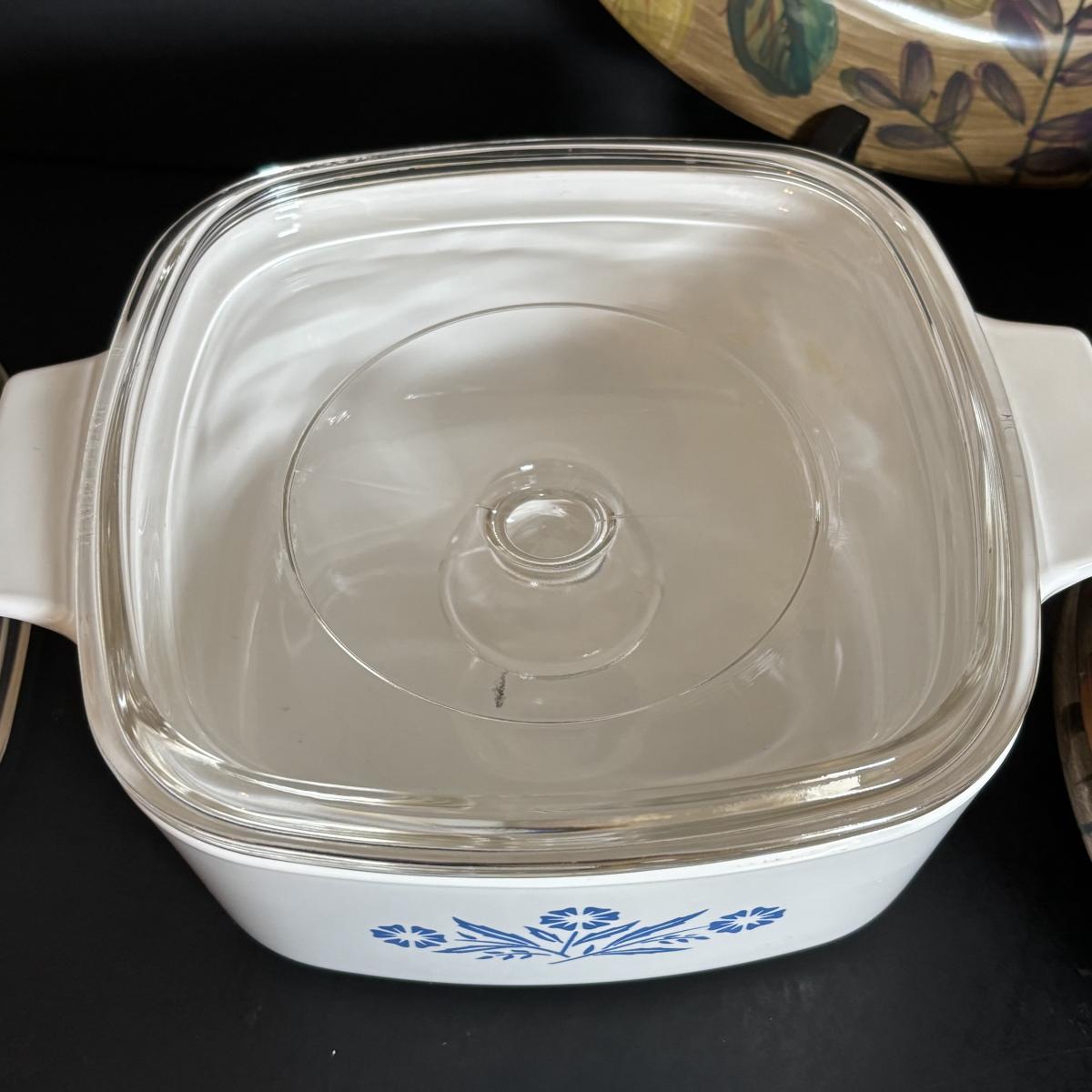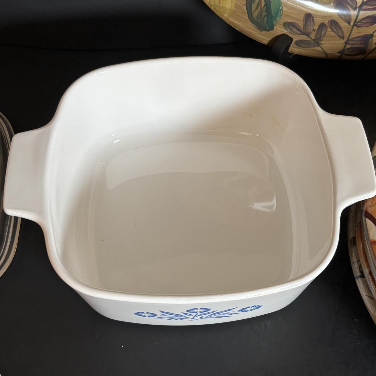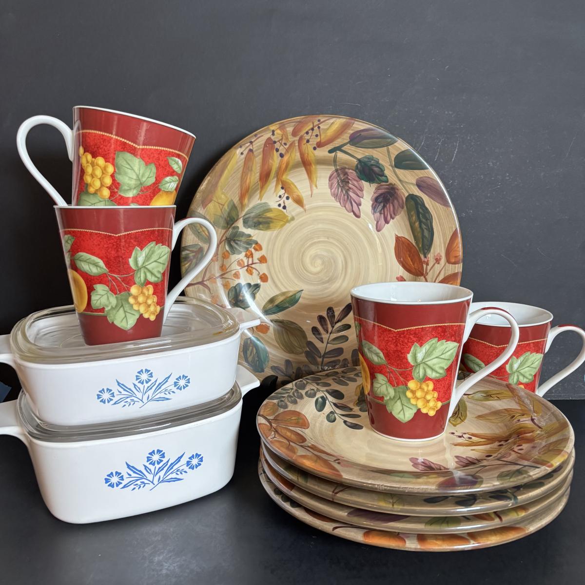 LOT 78: Corning Blue Cornflower Casseroles Dishes w/Lids, Home Trends Plates & 3 Mugs