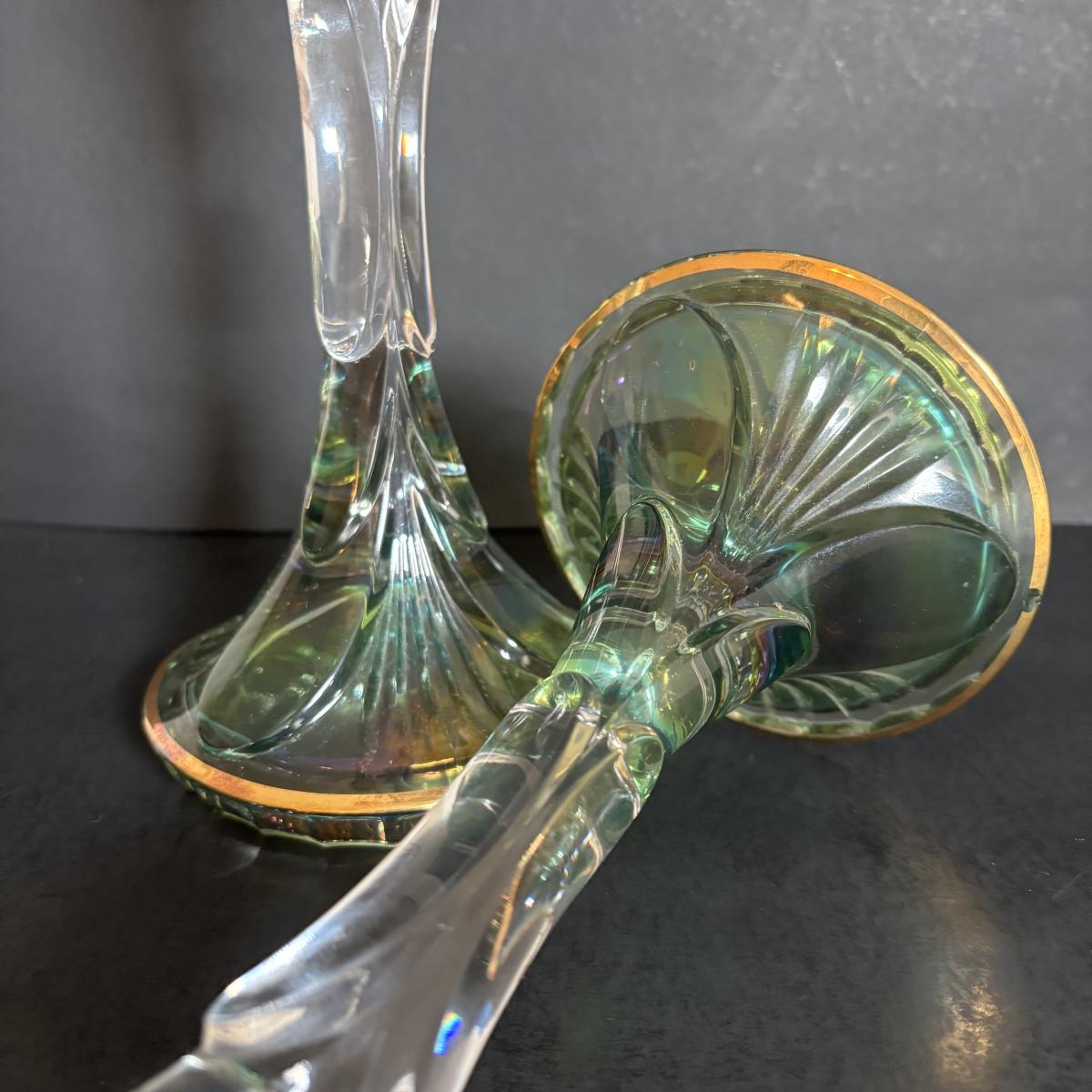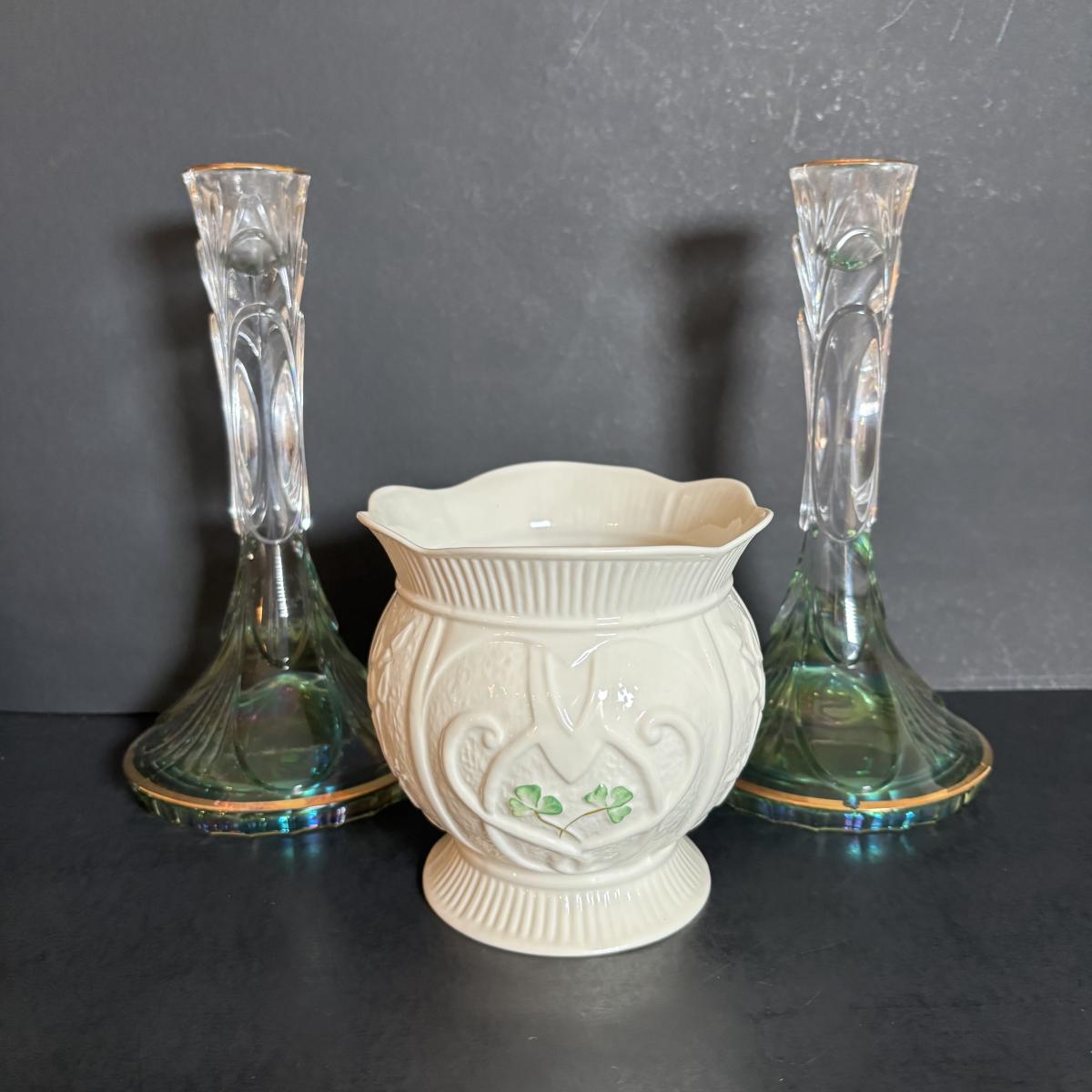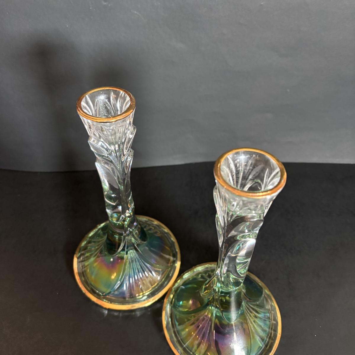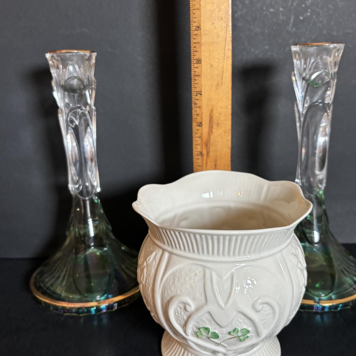 LOT 79: Crystal Iridescent Candle Sticks & Belleck Love Heart Footed Bowl