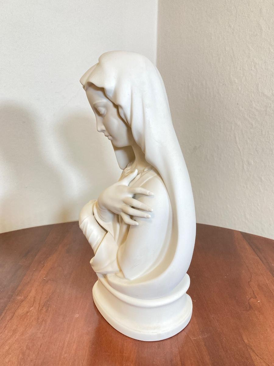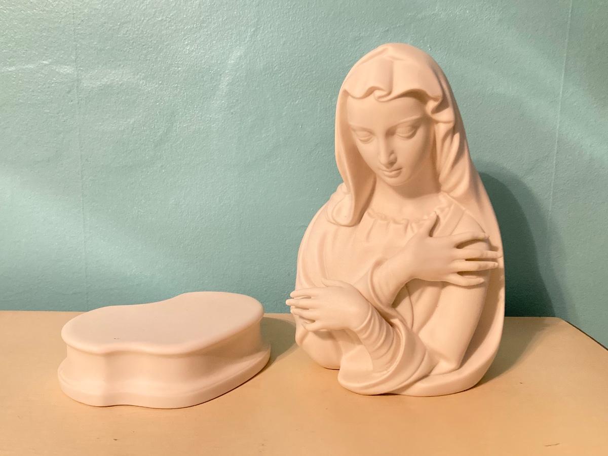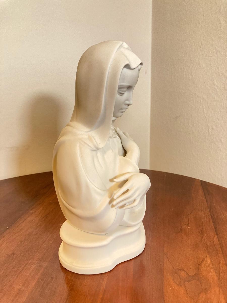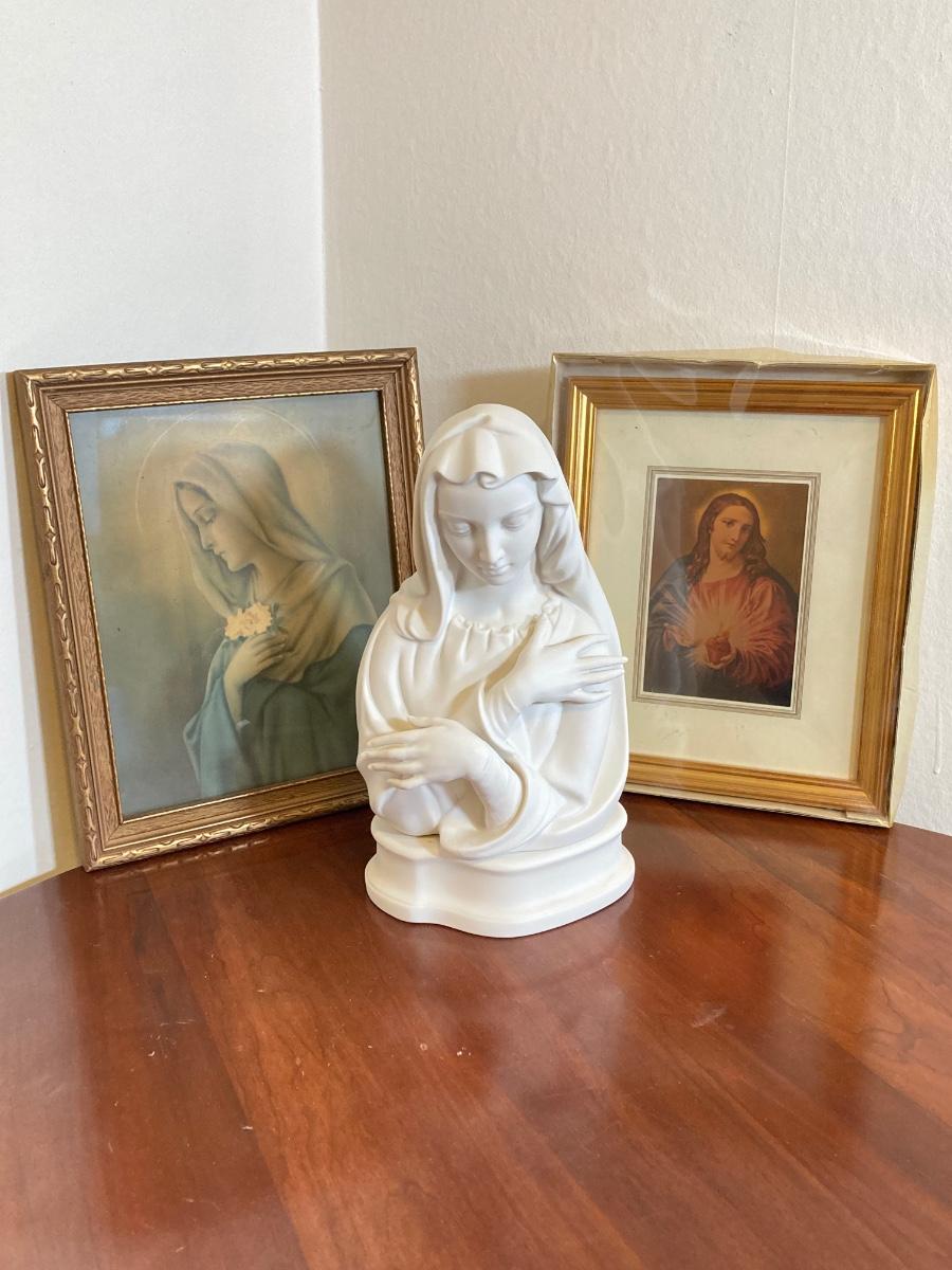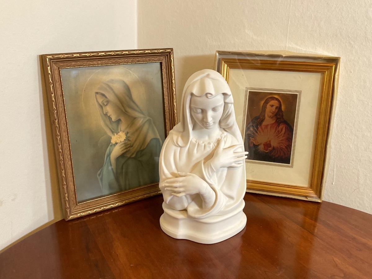 LOT 89: Religious Art Collection - Boehm Porcelain Bisque Blessed Mother Statue with Base Stand and Two Framed Pictures