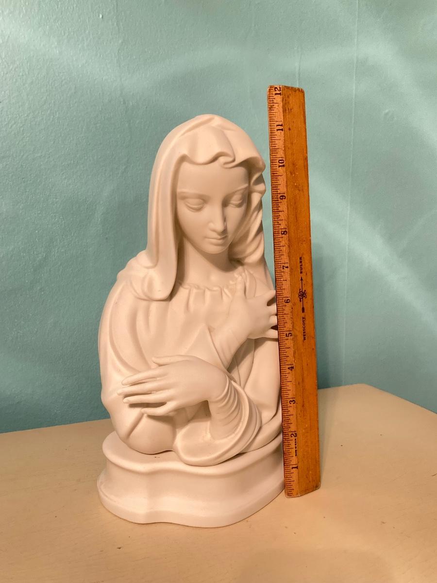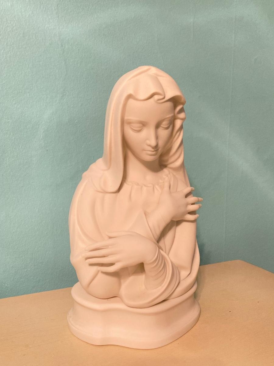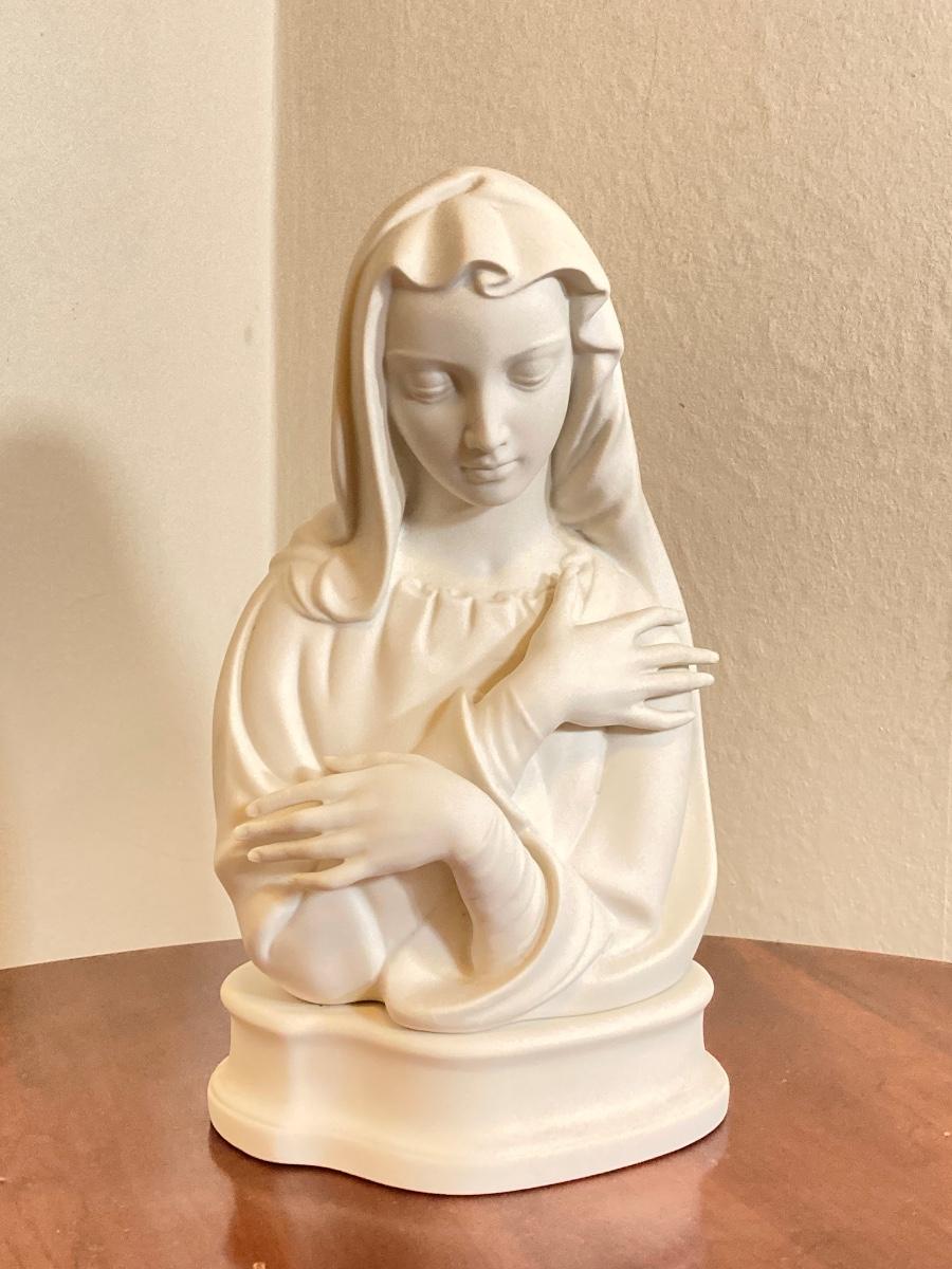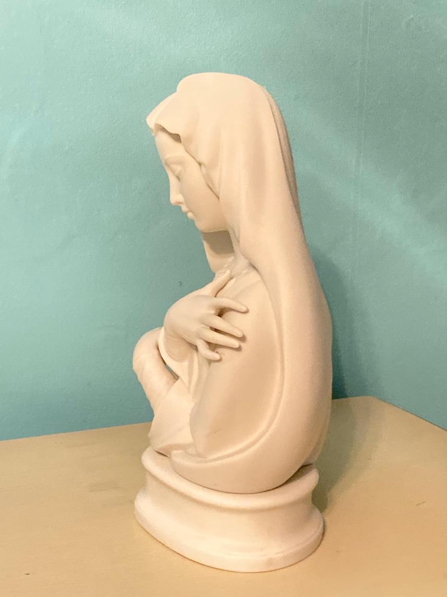 LOT 89: Religious Art Collection - Boehm Porcelain Bisque Blessed Mother Statue with Base Stand and Two Framed Pictures