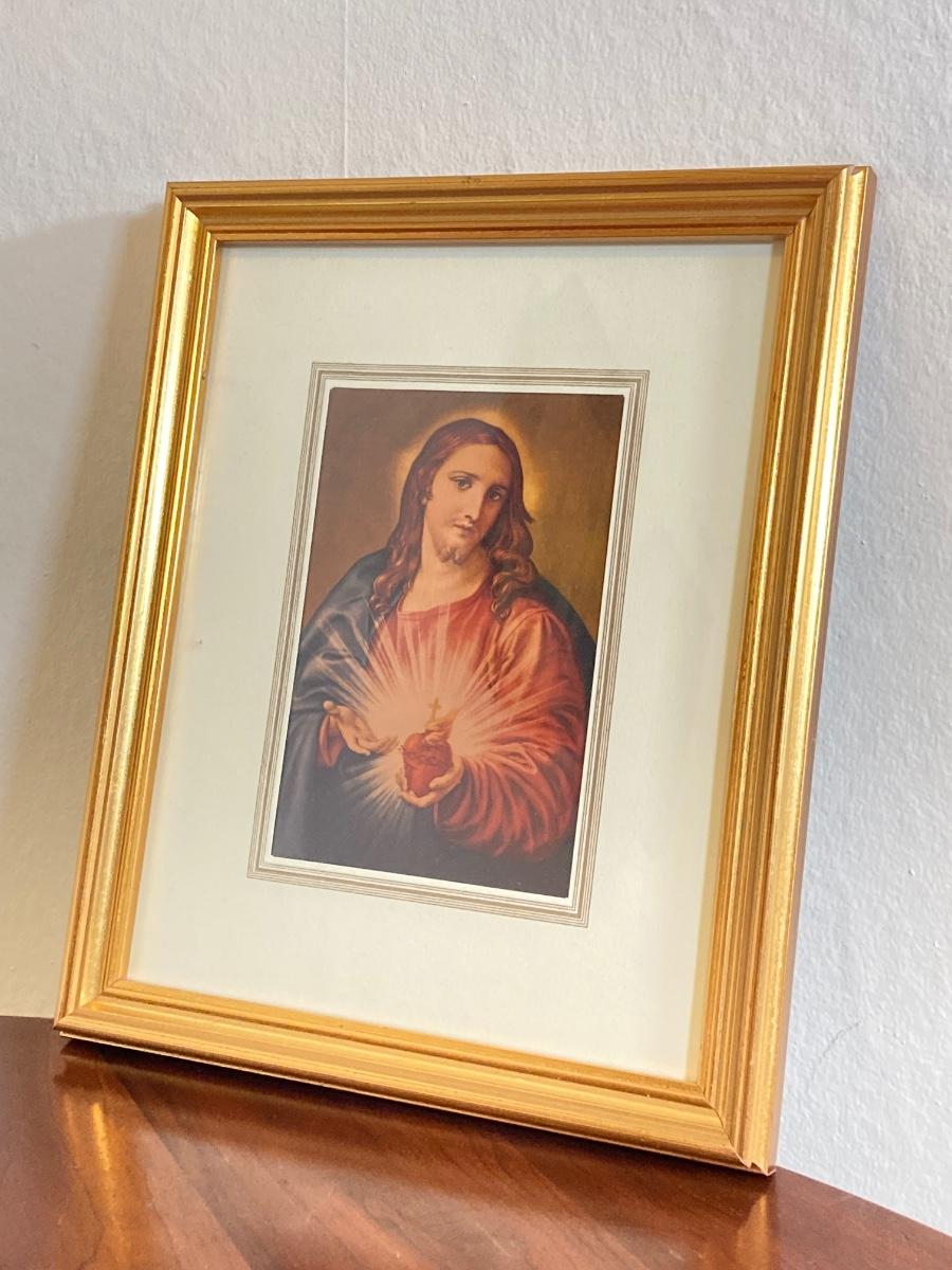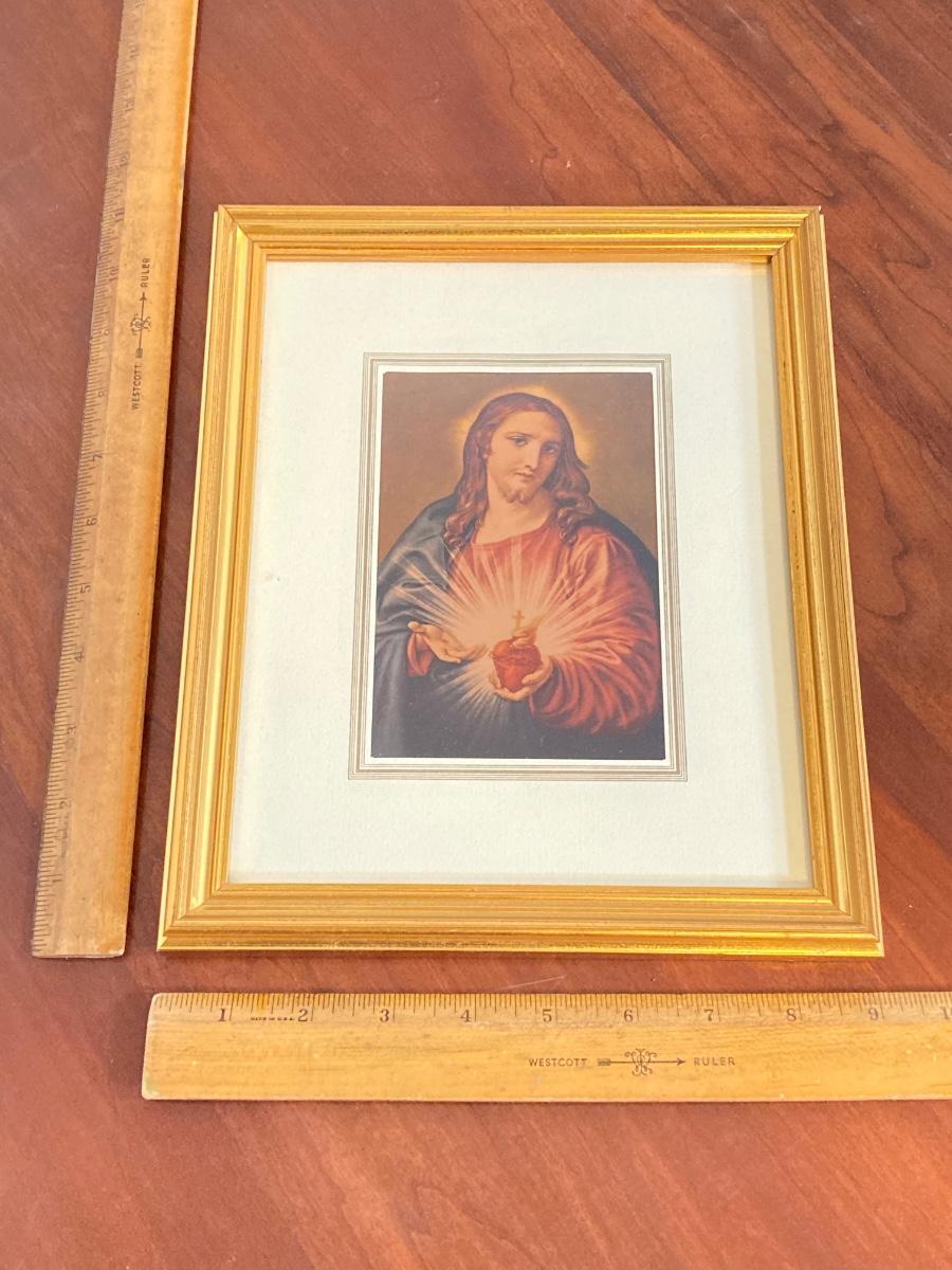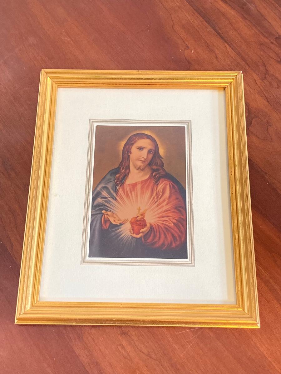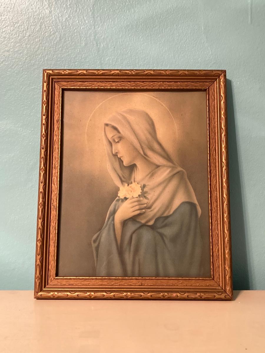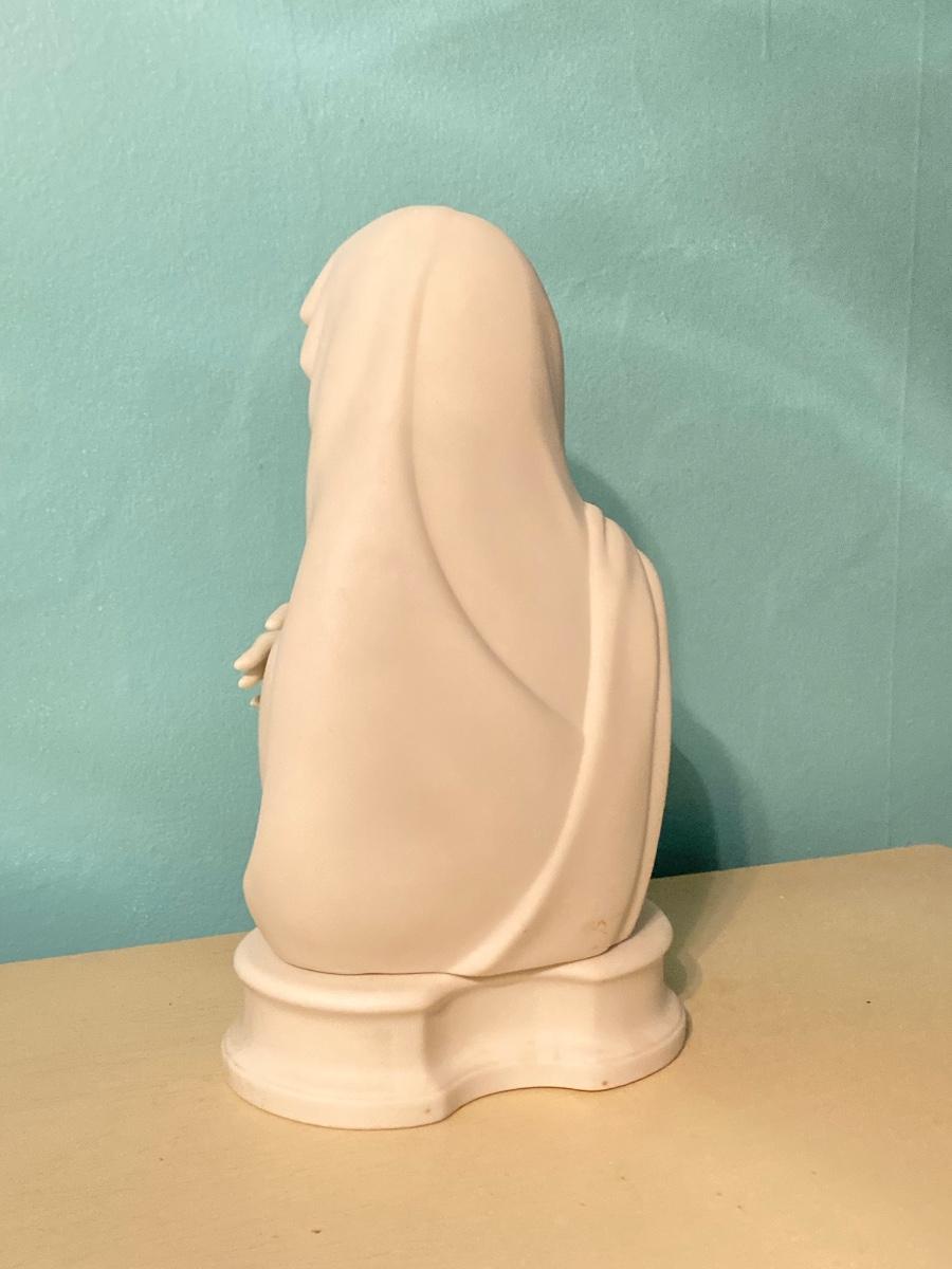 LOT 89: Religious Art Collection - Boehm Porcelain Bisque Blessed Mother Statue with Base Stand and Two Framed Pictures
