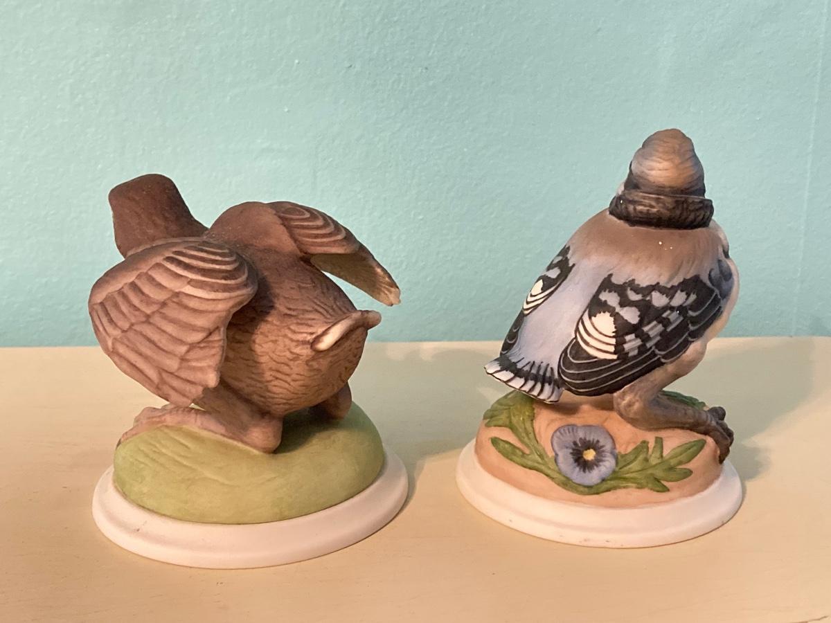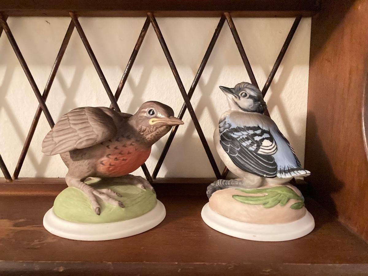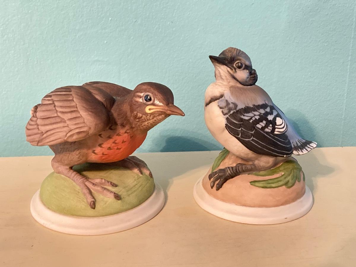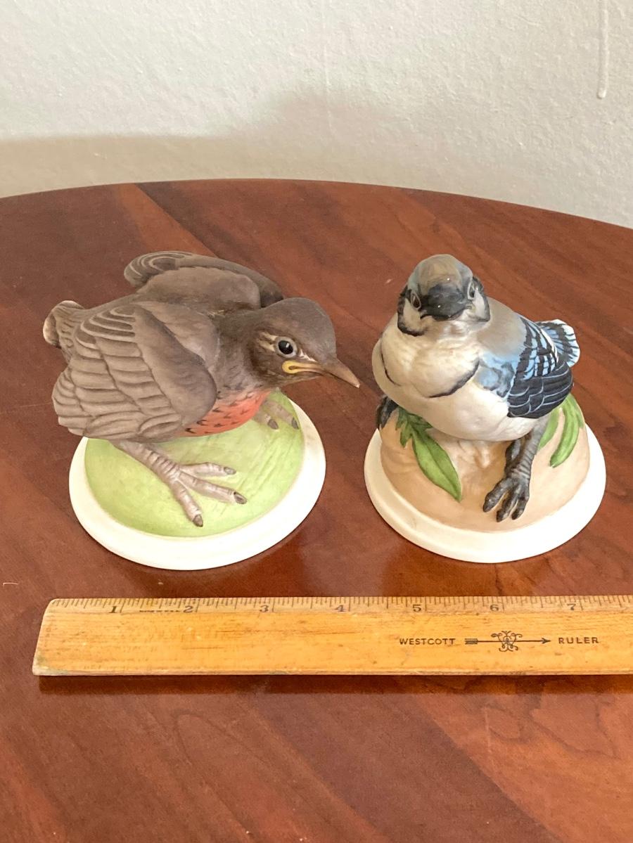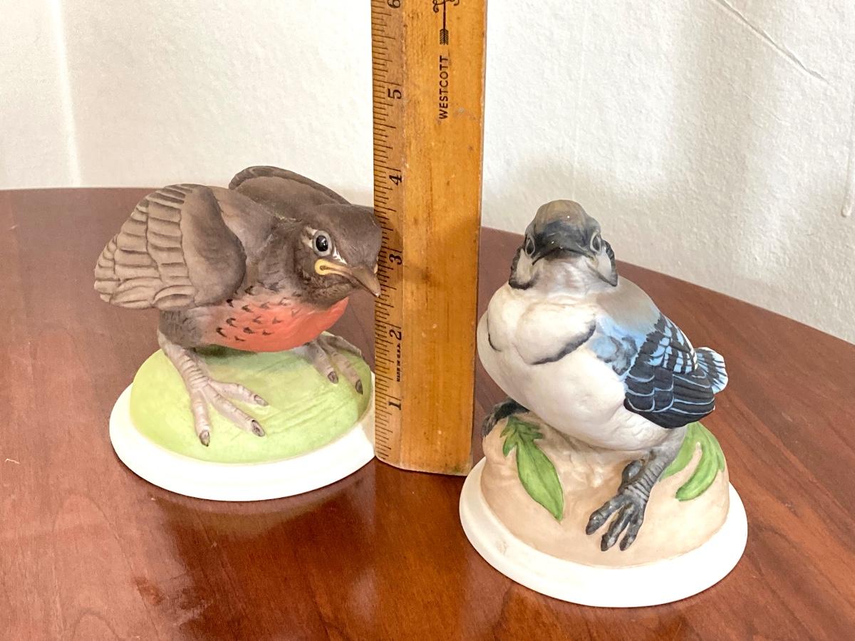 LOT 92: Pair of Boehm Porcelain Bird Figurines (Baby Blue Jay and Baby Robin) and Vintage Wall Shelf with Towel Bar