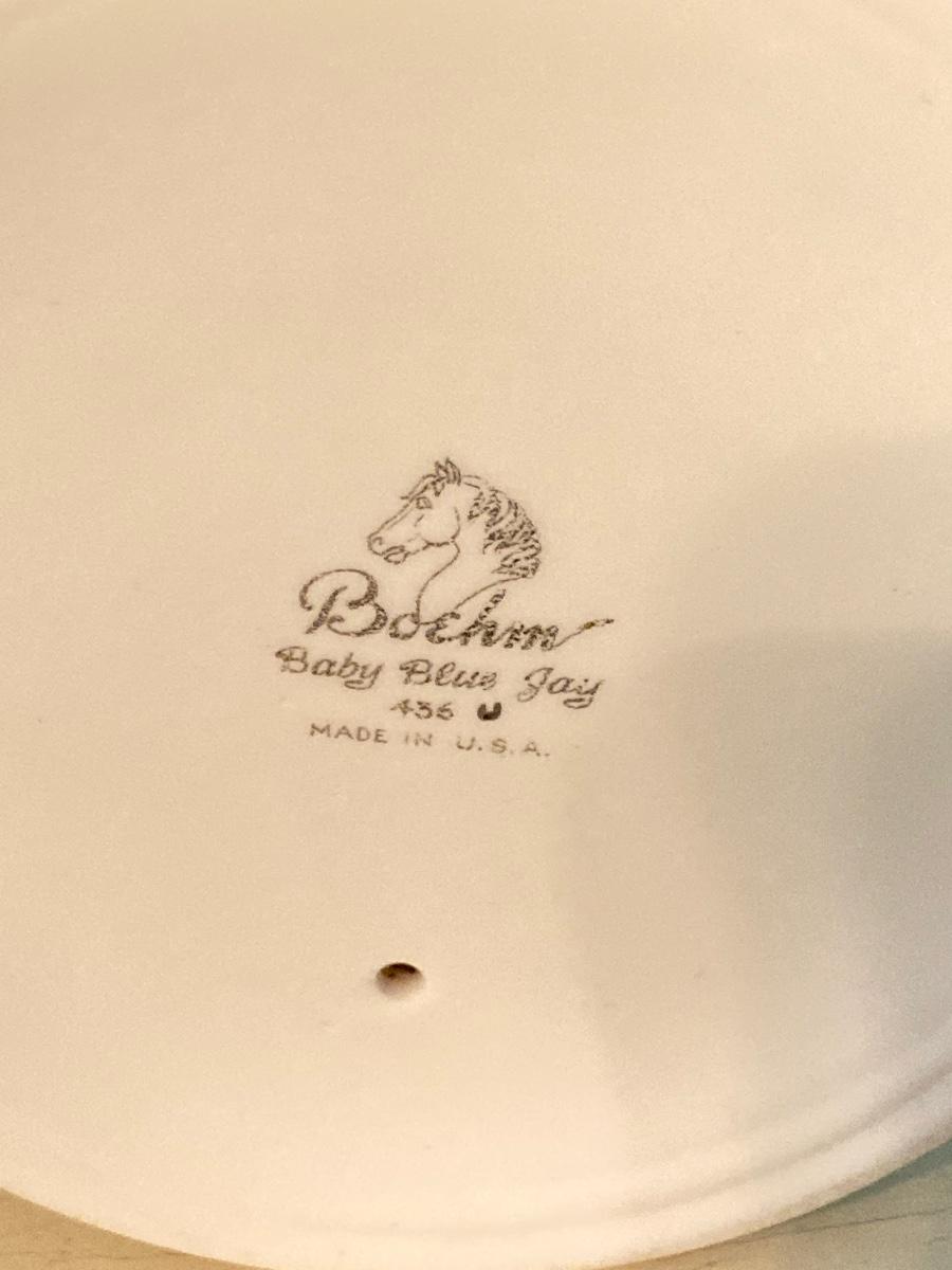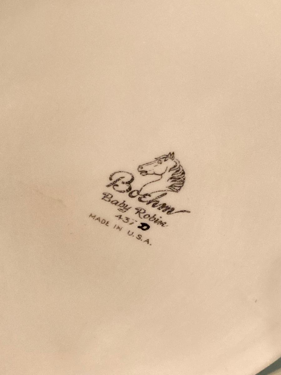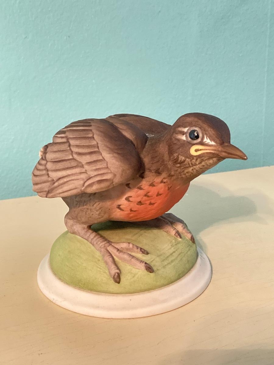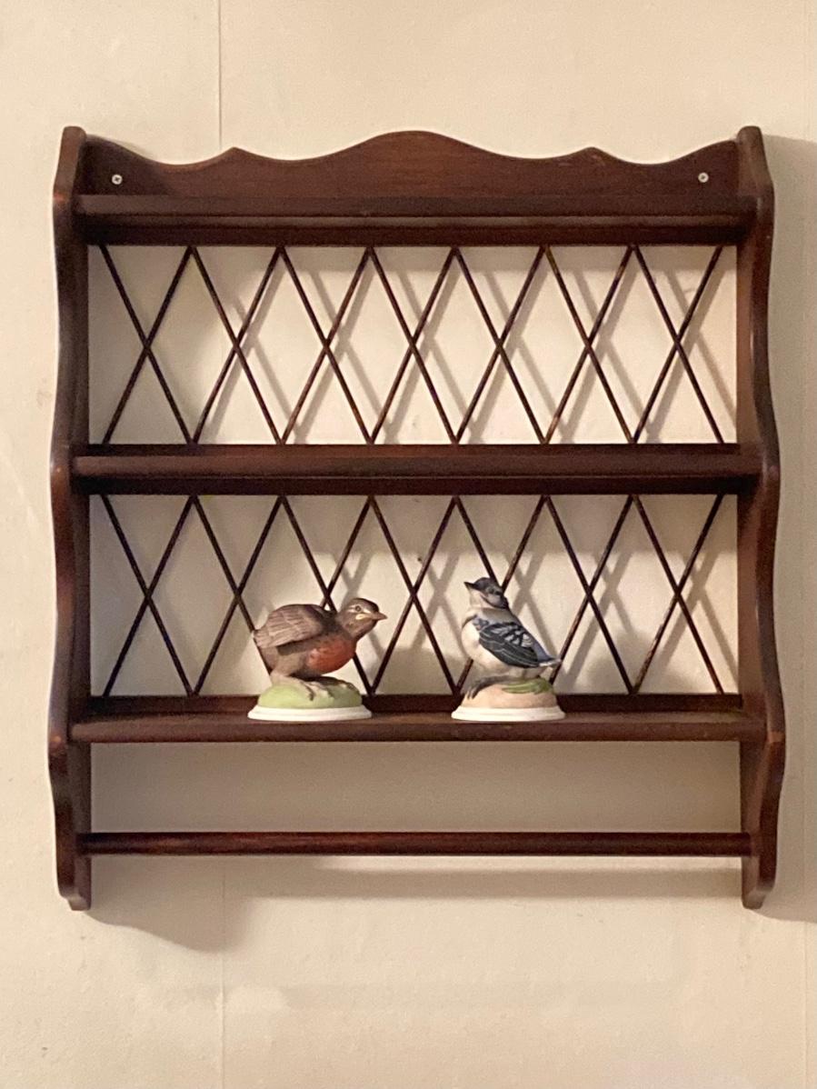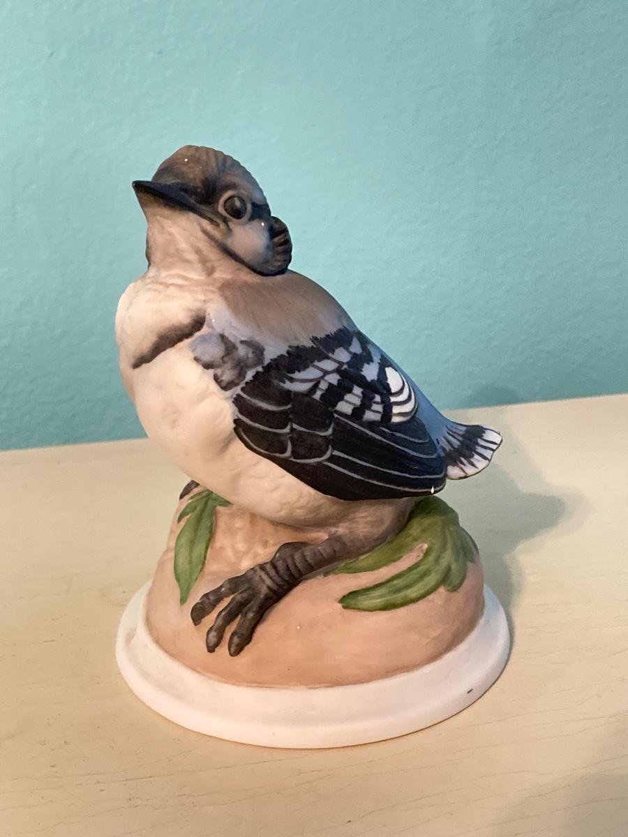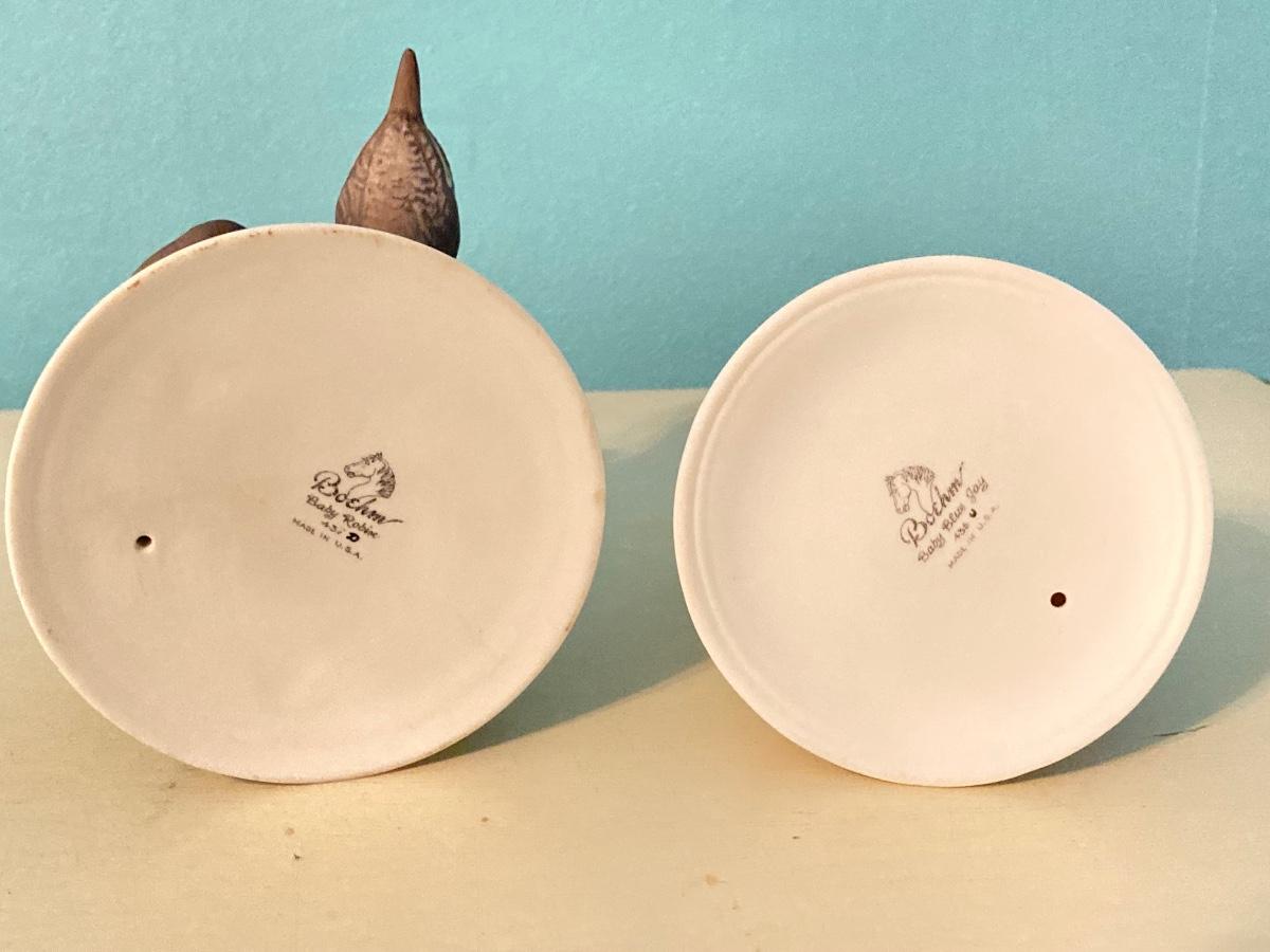 LOT 92: Pair of Boehm Porcelain Bird Figurines (Baby Blue Jay and Baby Robin) and Vintage Wall Shelf with Towel Bar
