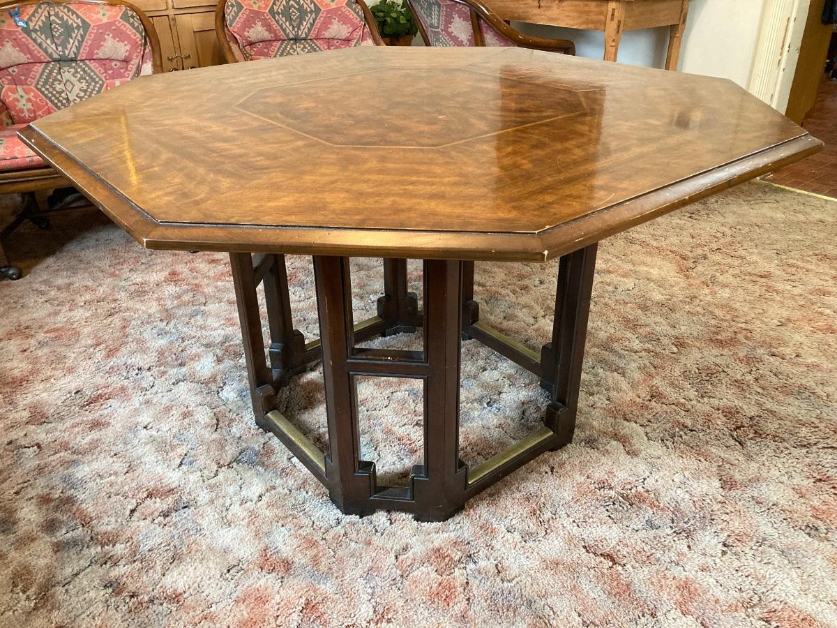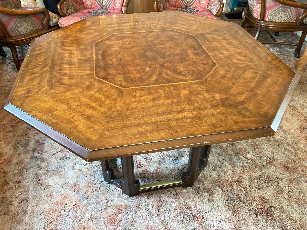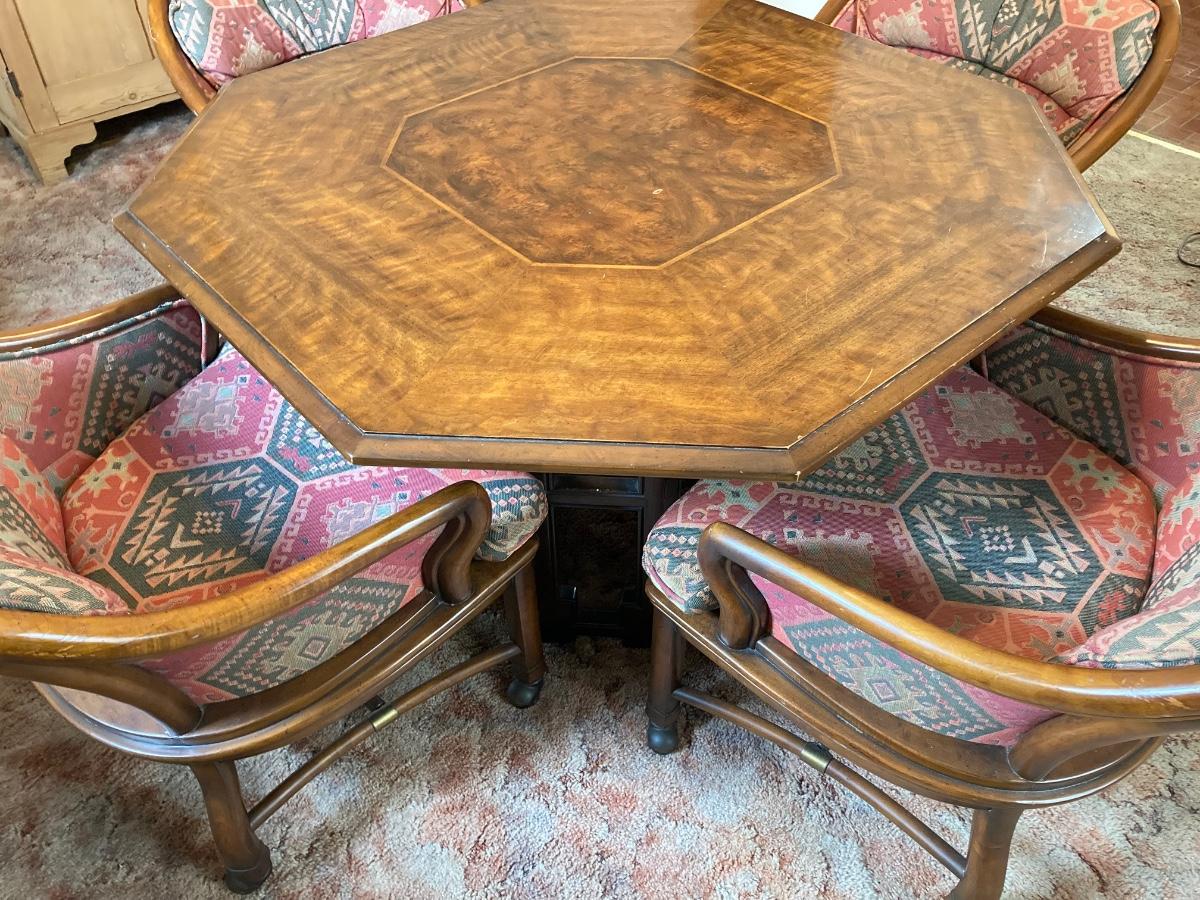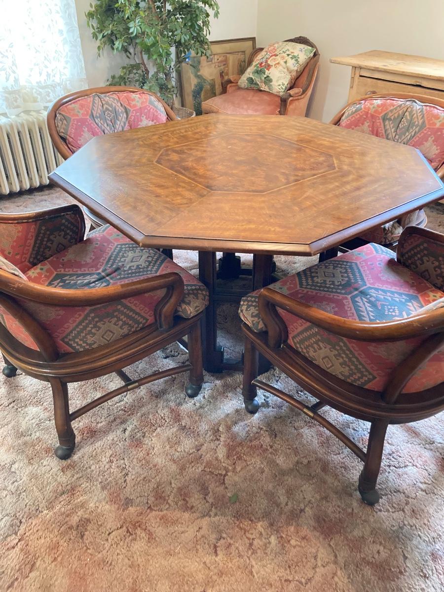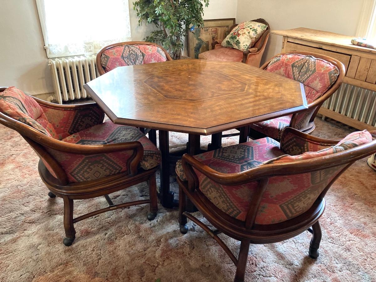 LOT 98: Octagon Wood Table with Four Wrap Around Wood / Upholstered Rolling Chairs
