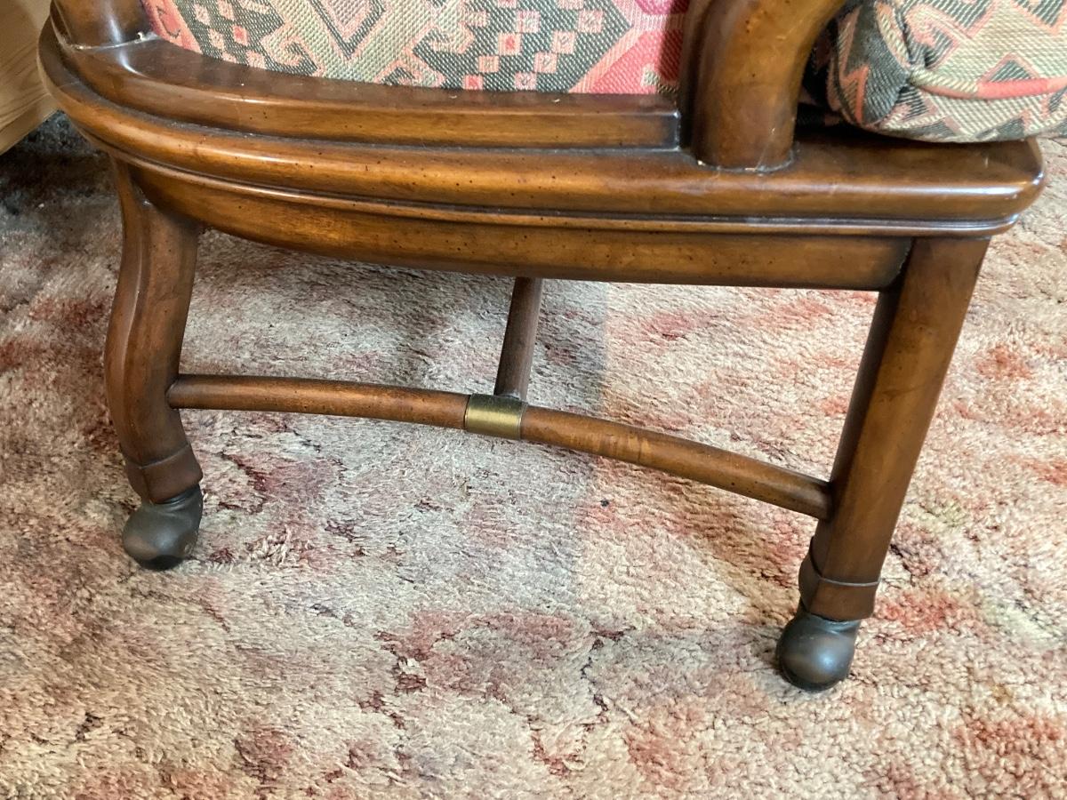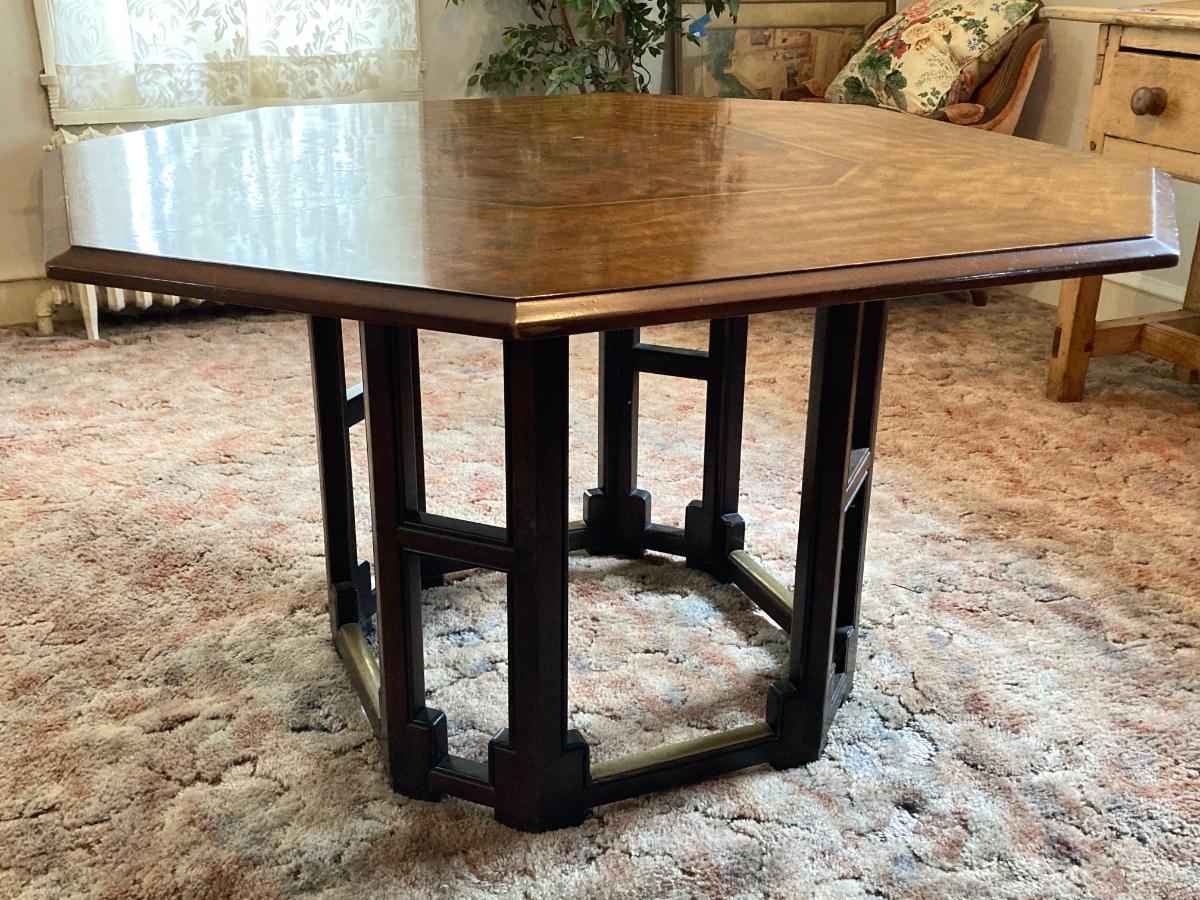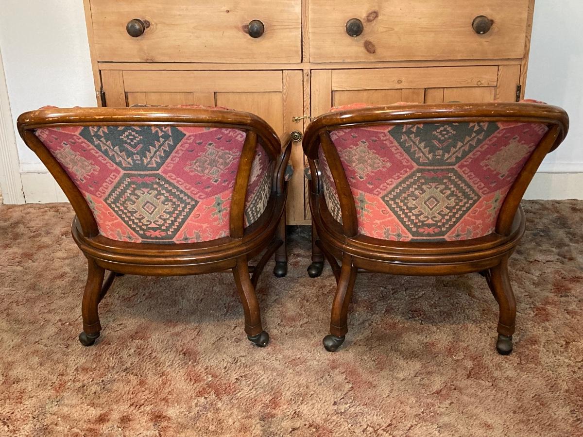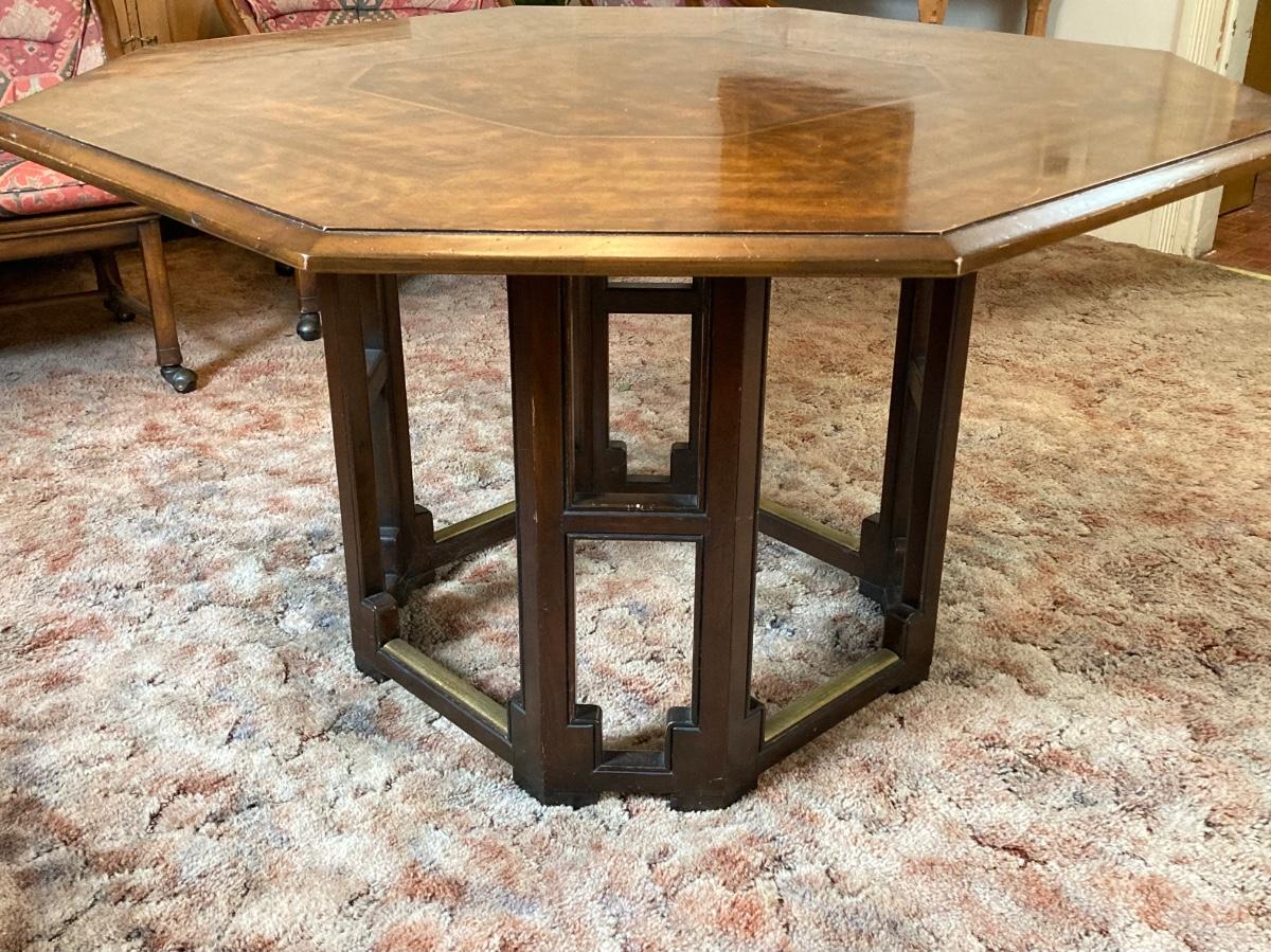 LOT 98: Octagon Wood Table with Four Wrap Around Wood / Upholstered Rolling Chairs