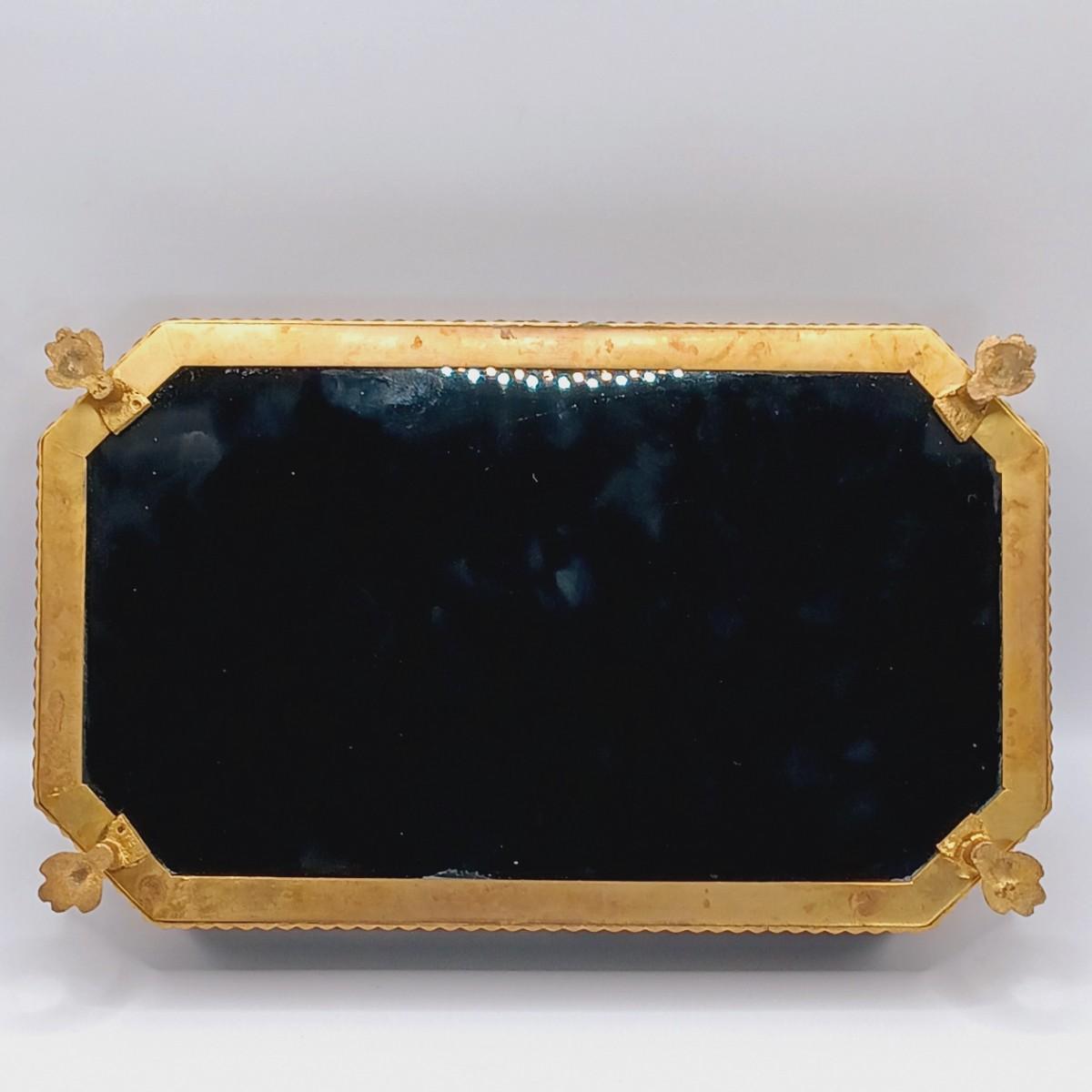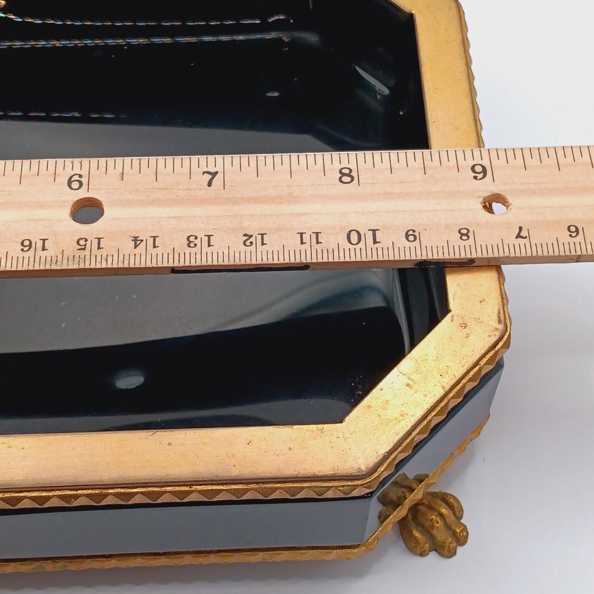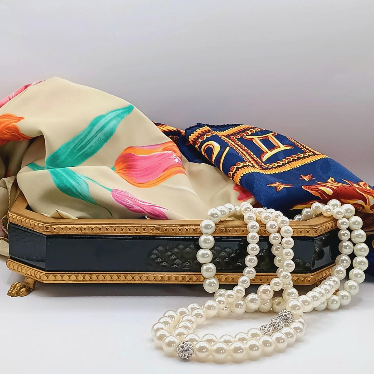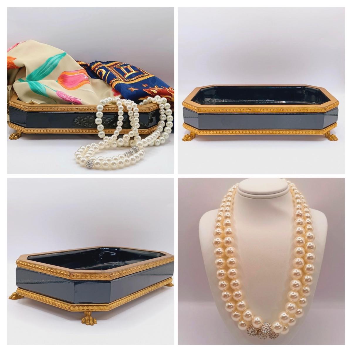 LOT 129: Vintage Black Glass Footed Trinket Tray with Scarves & Feaux Pearls
