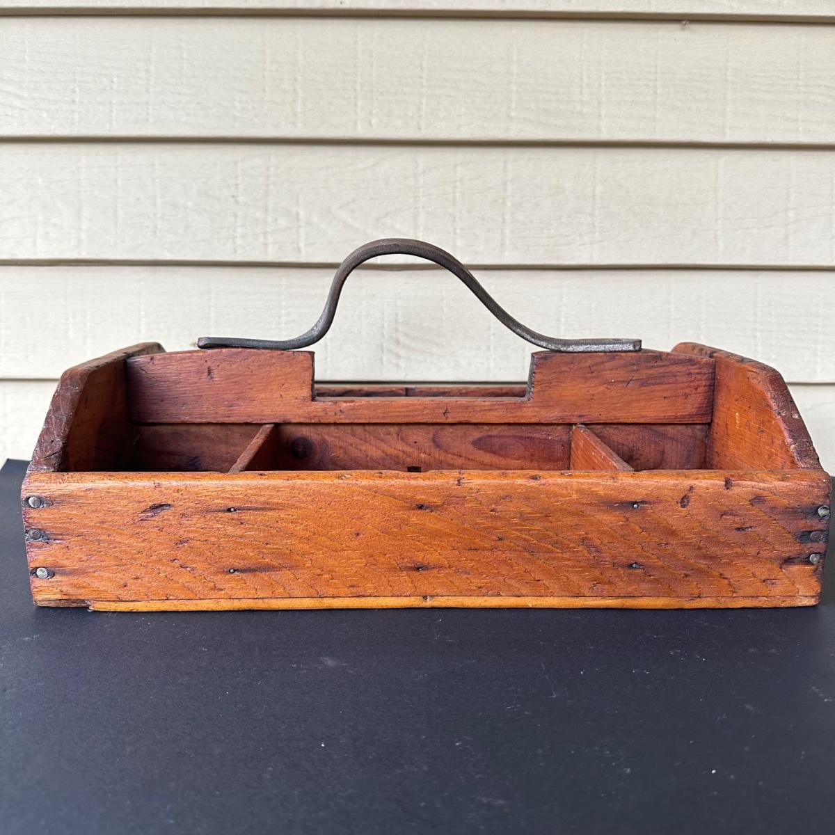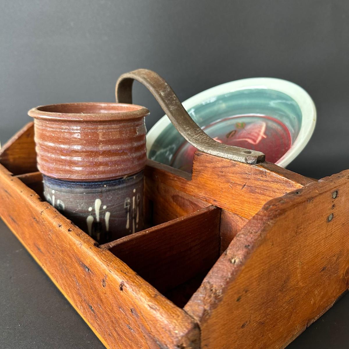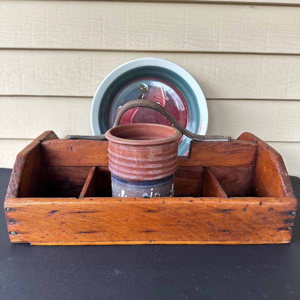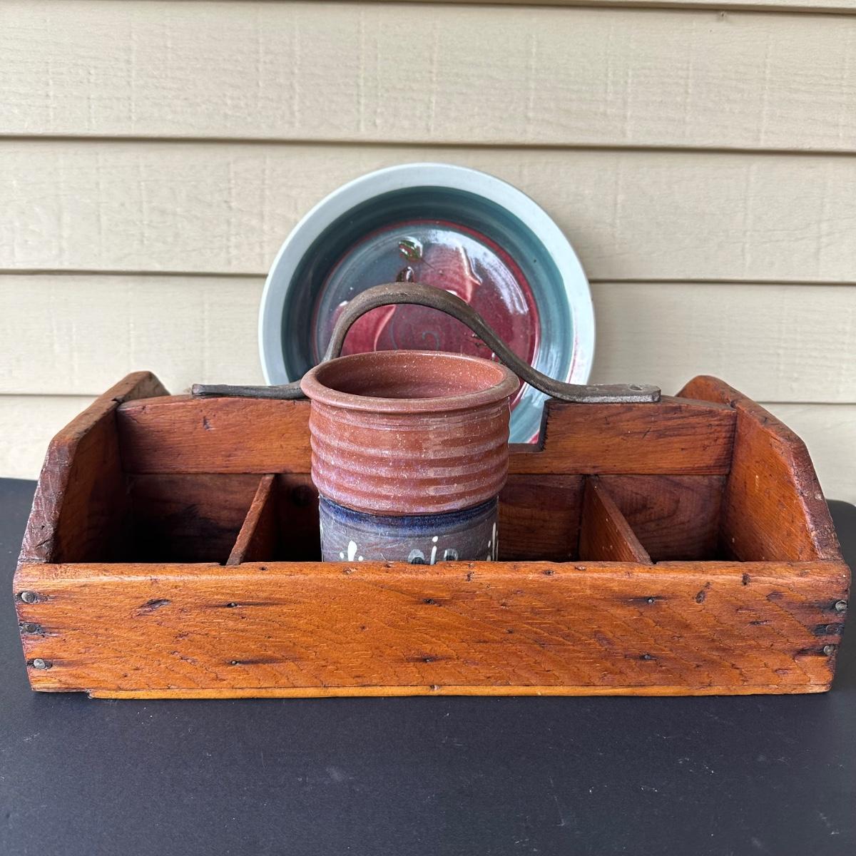 LOT 136: Antique Wooden Farmhouse Tool Caddy along w/Signed Pottery