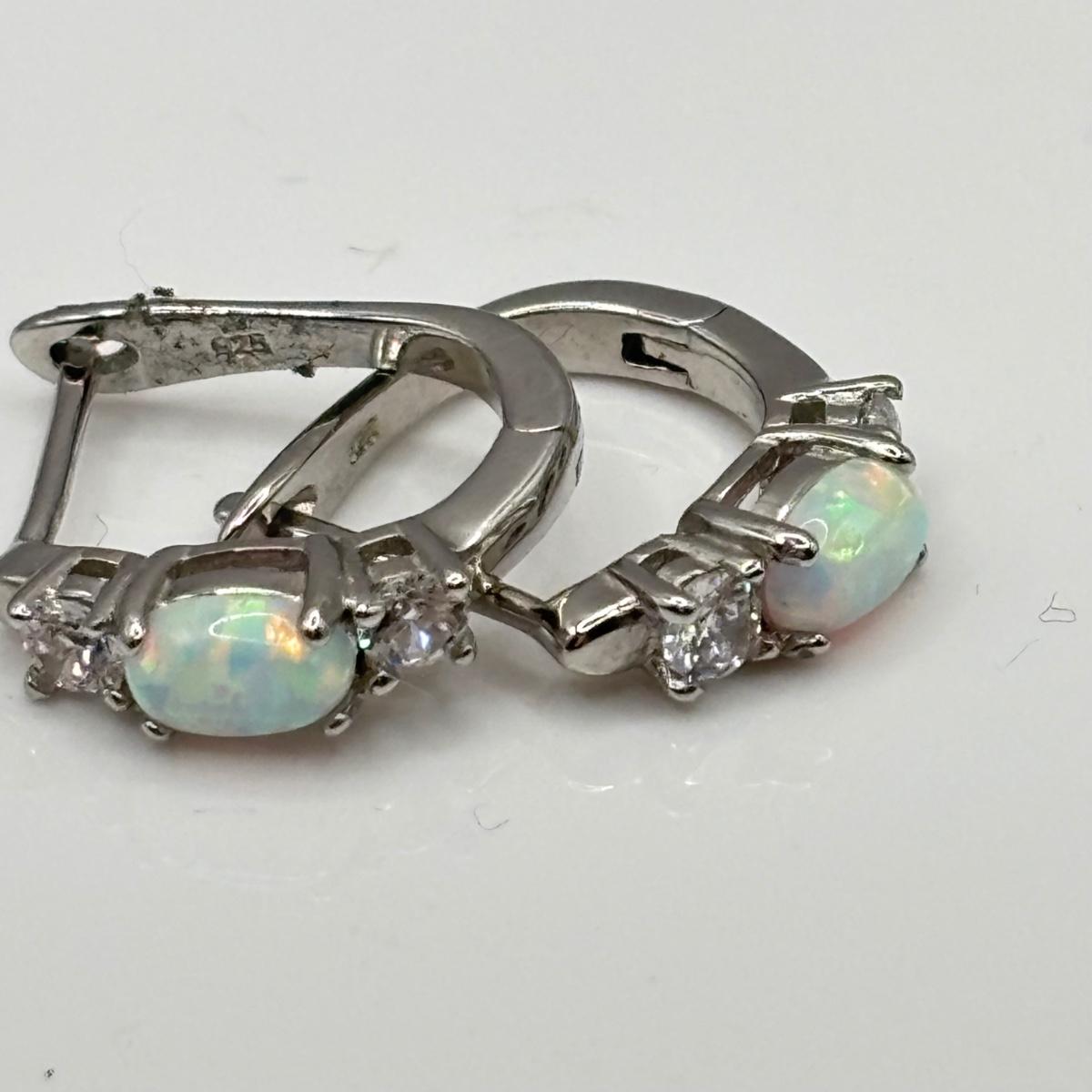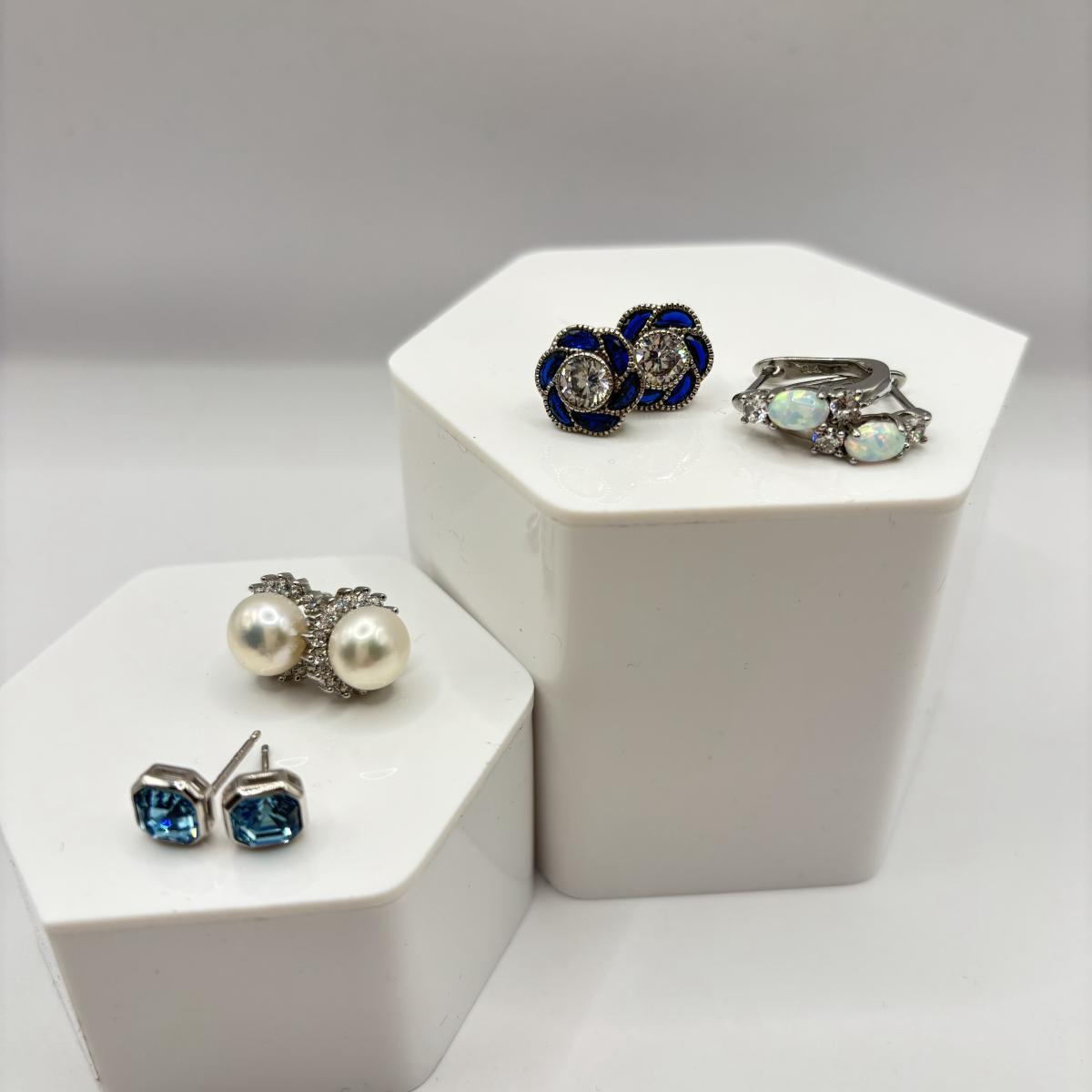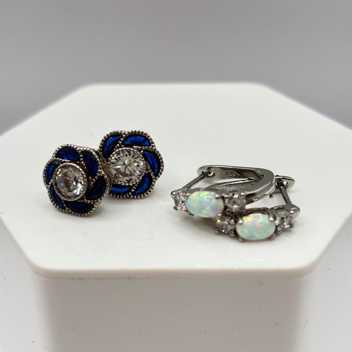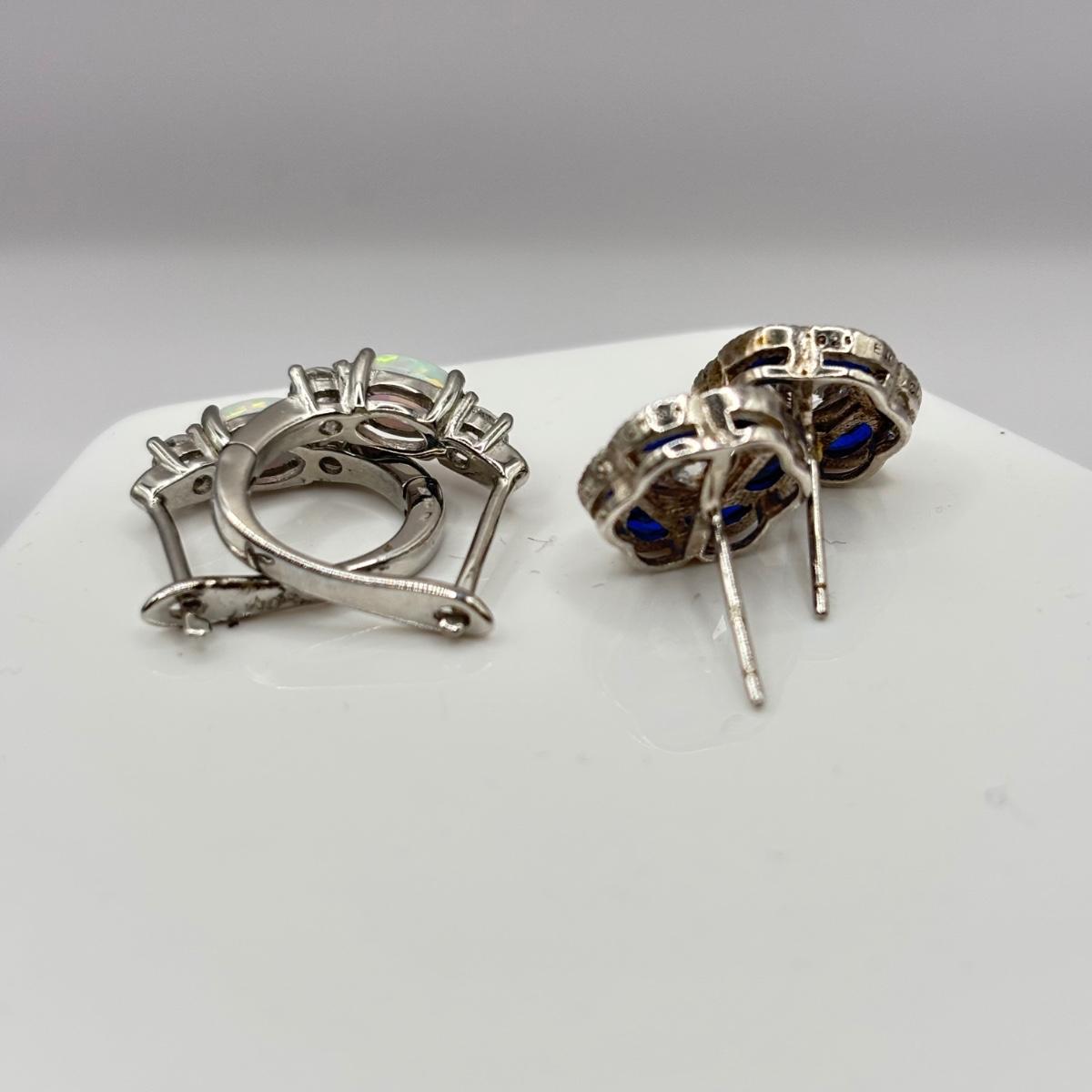 LOT 167: Sterling Silver Collection of 4pr of Earrings: Faceted Blue Topaz, Opals, Pearls & Sapphire