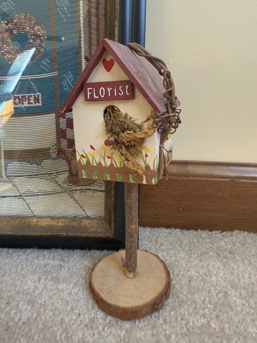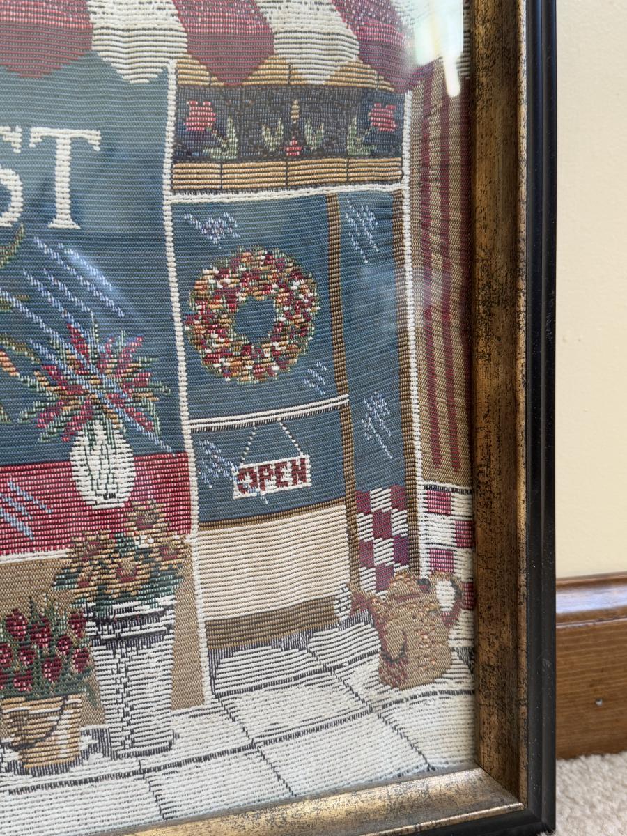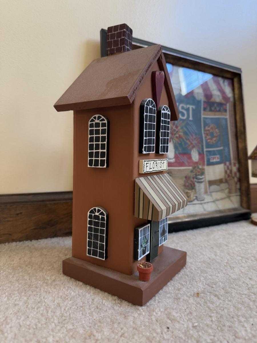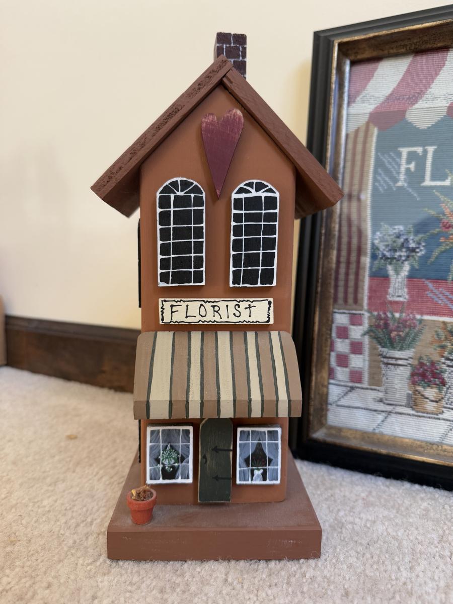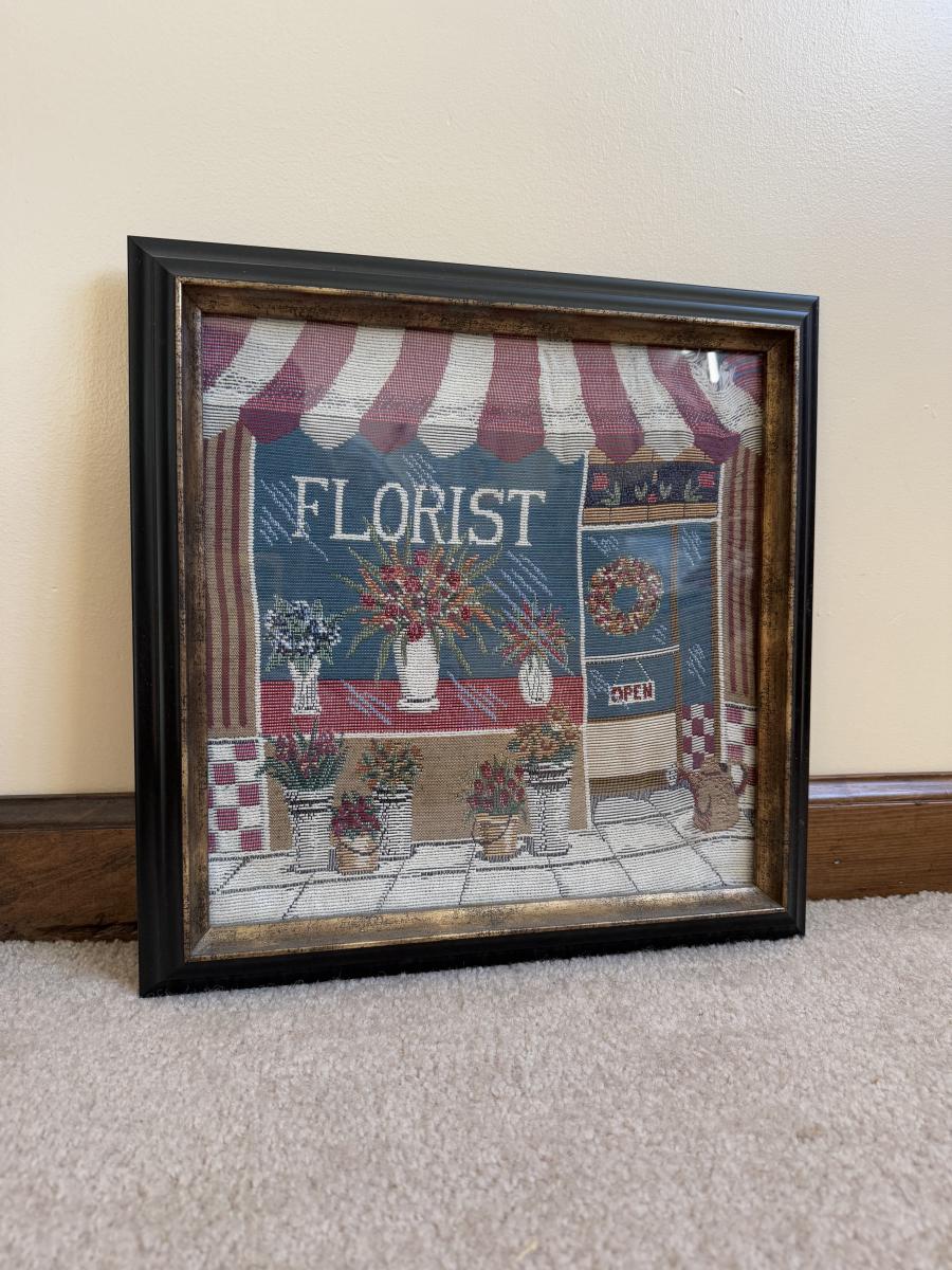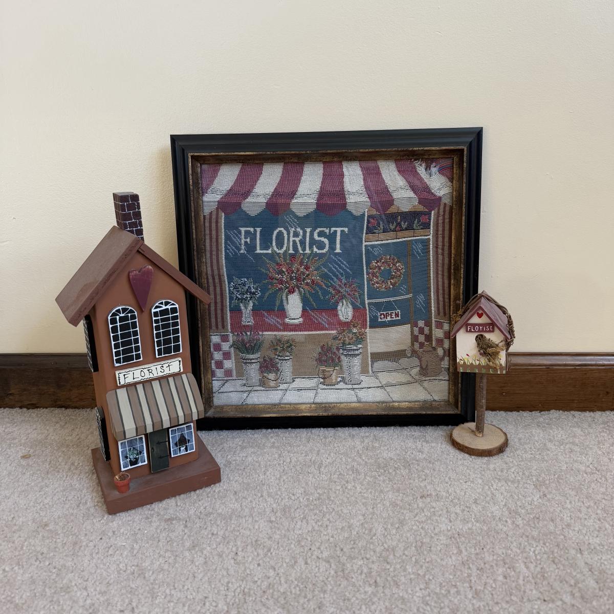 LOT 21B: Charlene Olson Embroidered Artwork, Florist Village House, Wreath in Box & More