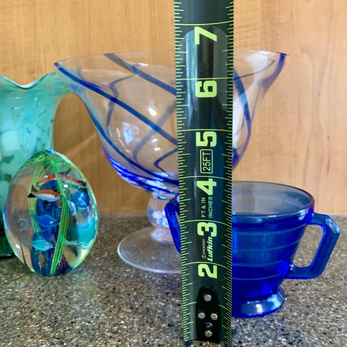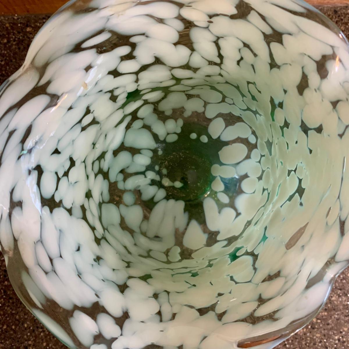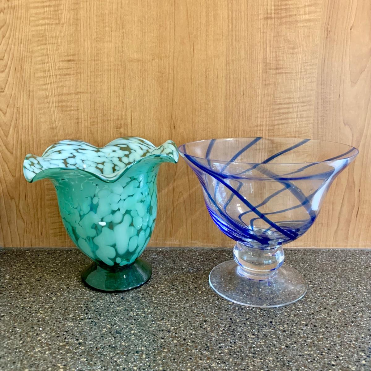 LOT 64 K: Signed Hand Blown Ruffled Rim Aqua & White Marbled Vase, Pasabahce Turkish Cobalt Blue Swirl Hand Blown Glass Footed Bowl, & More