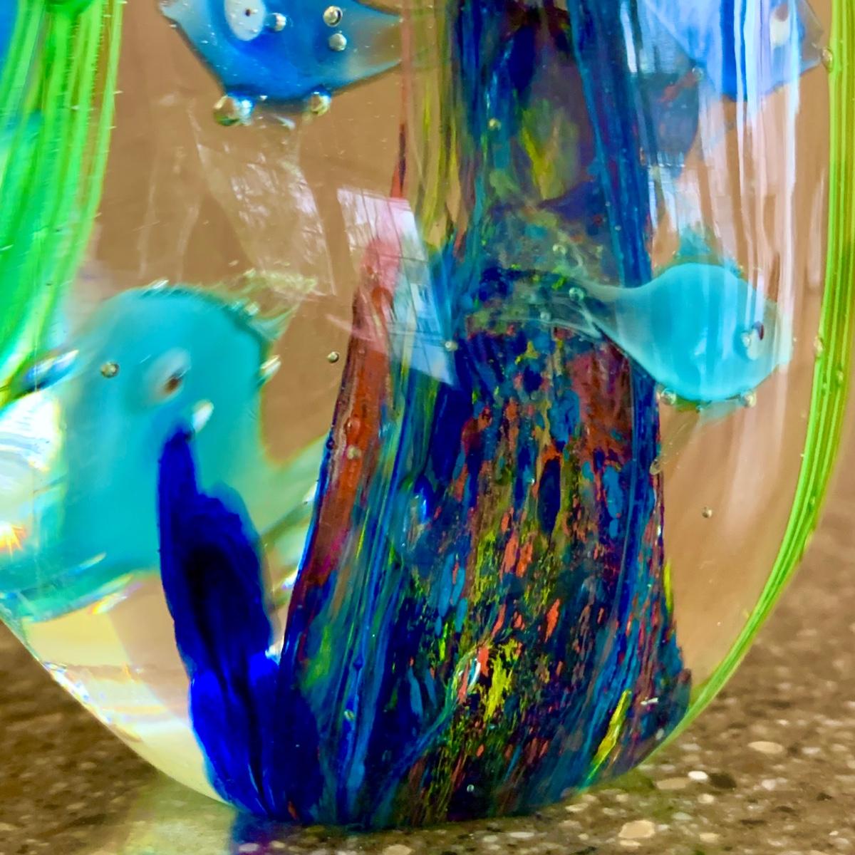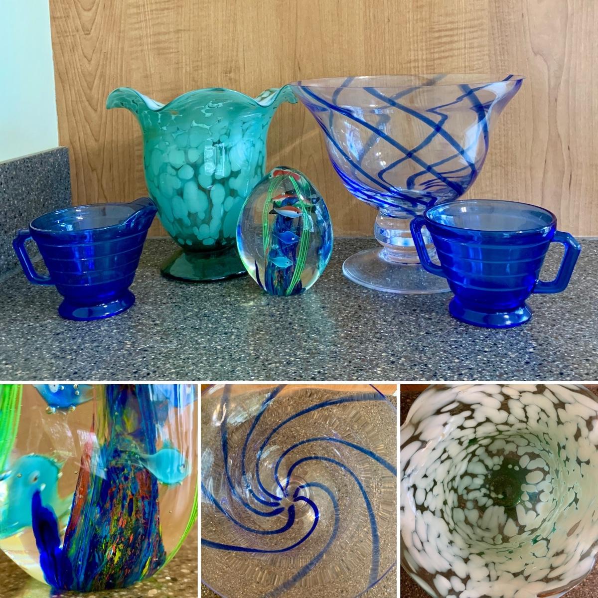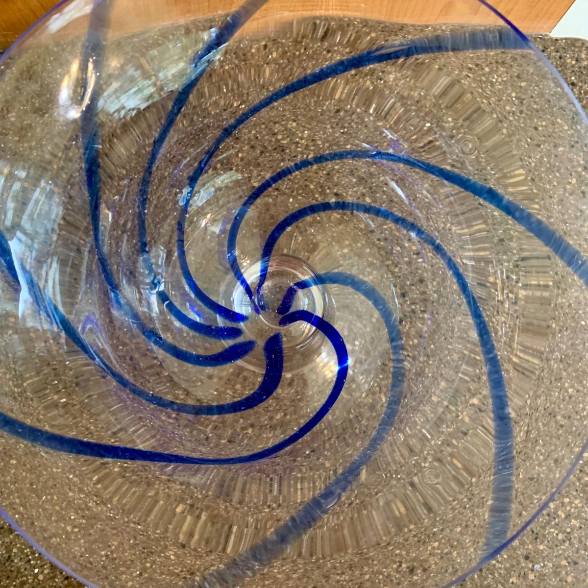 LOT 64 K: Signed Hand Blown Ruffled Rim Aqua & White Marbled Vase, Pasabahce Turkish Cobalt Blue Swirl Hand Blown Glass Footed Bowl, & More