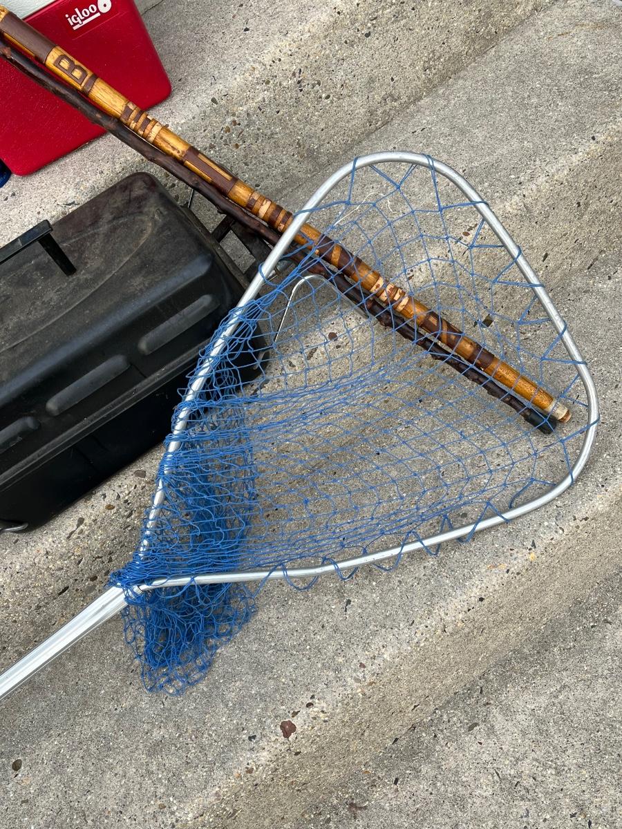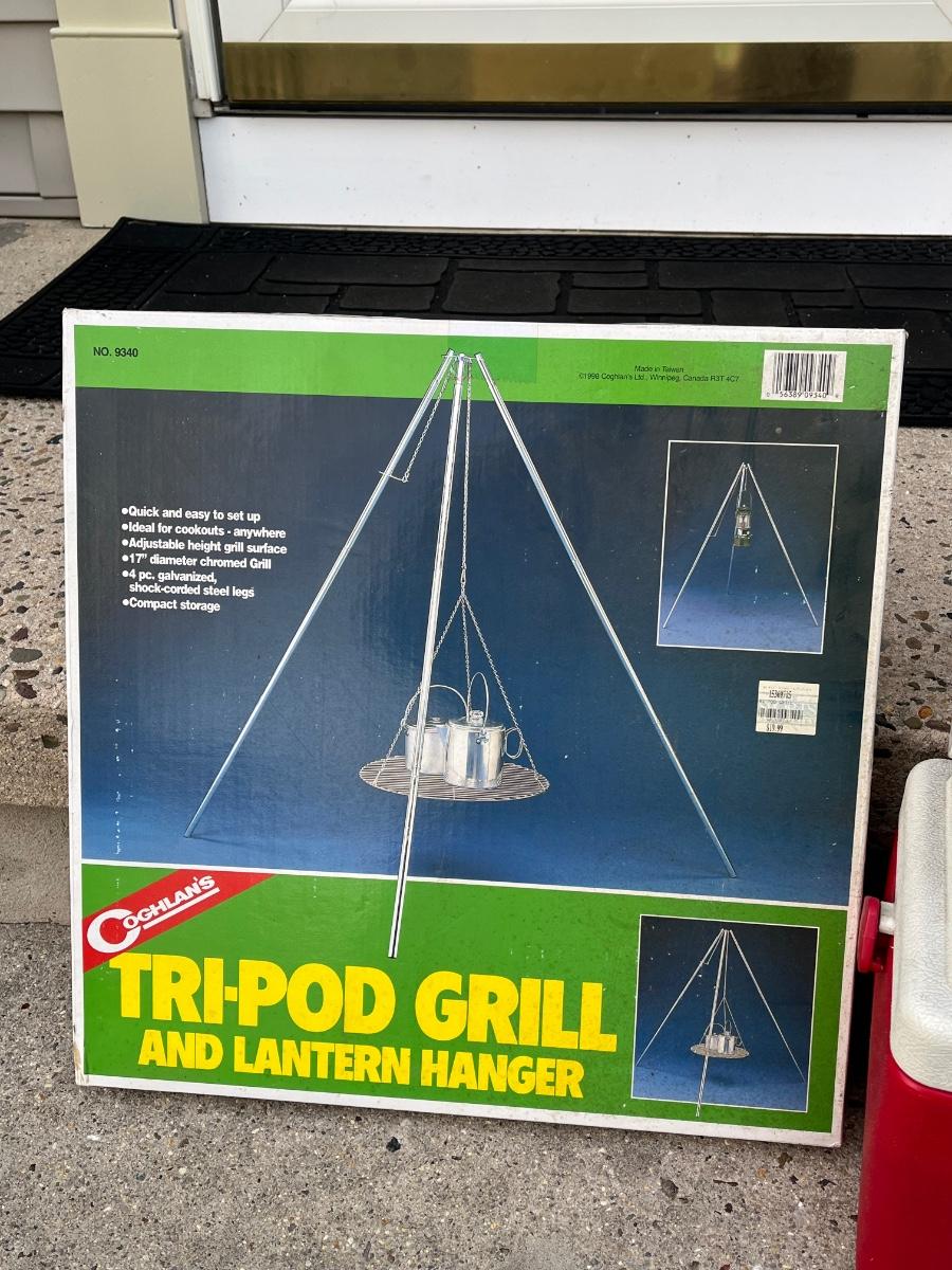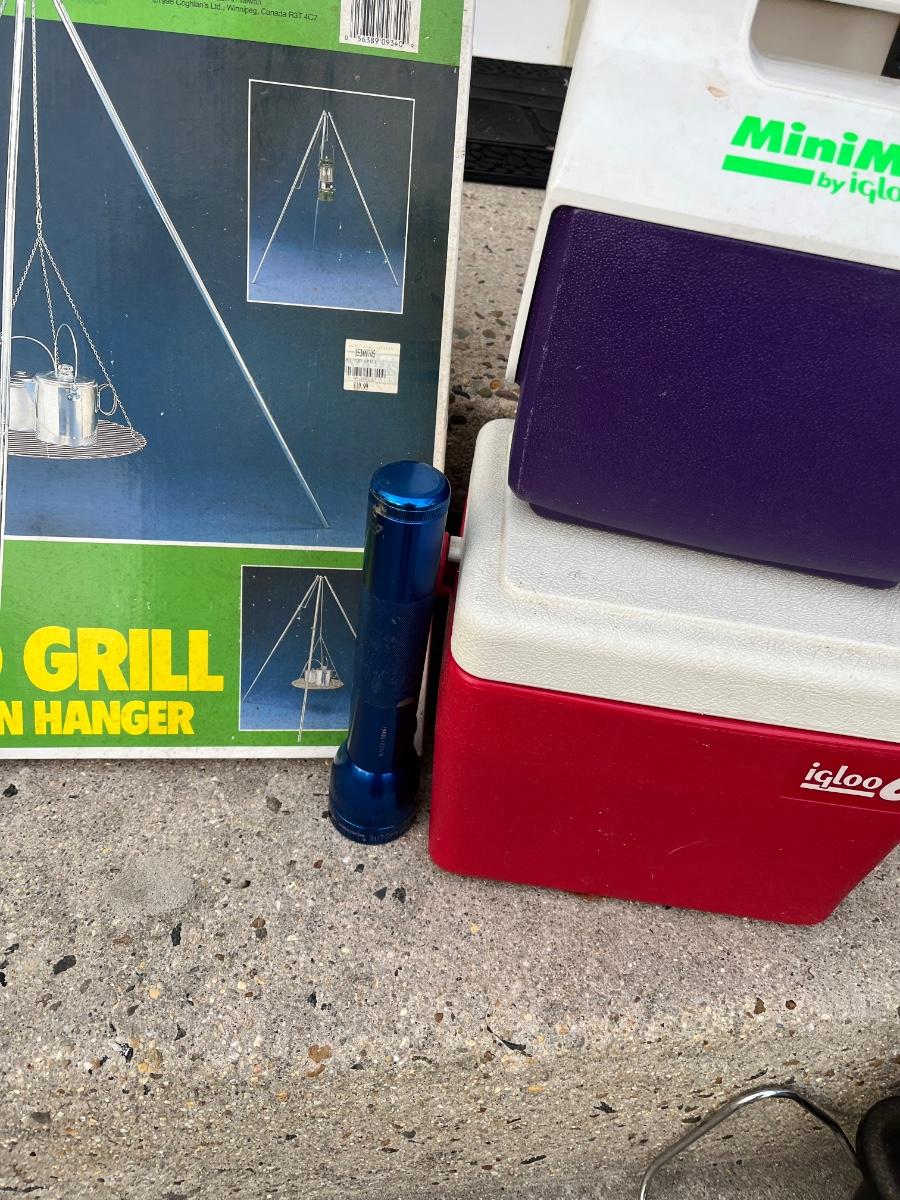 LOT 86G: Camping / Outdoors Equipment - Fishing Net, Cast Iron Pot, Binoculars, Lantern and More