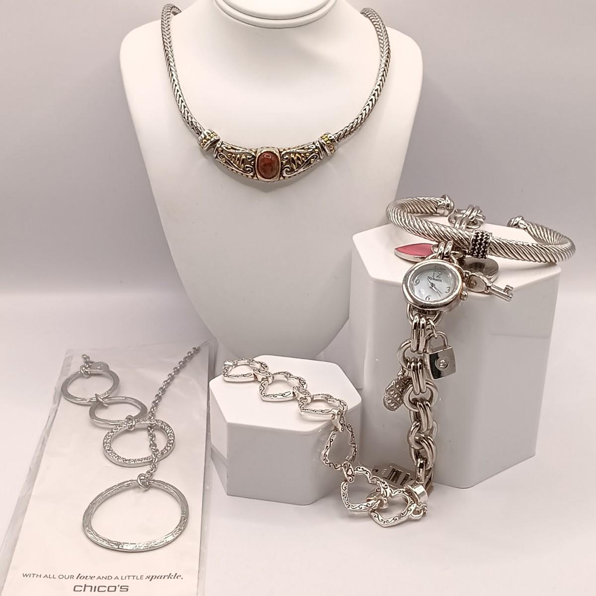 LOT 17: Silver-Tone Necklace with Garnet-Tone Stone, Chicos Circle Necklace, Style & Co Watch & More