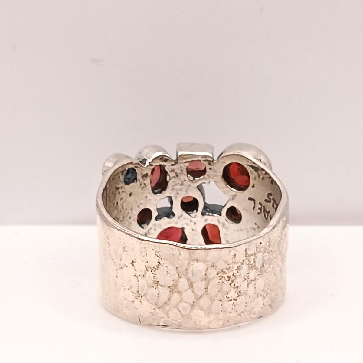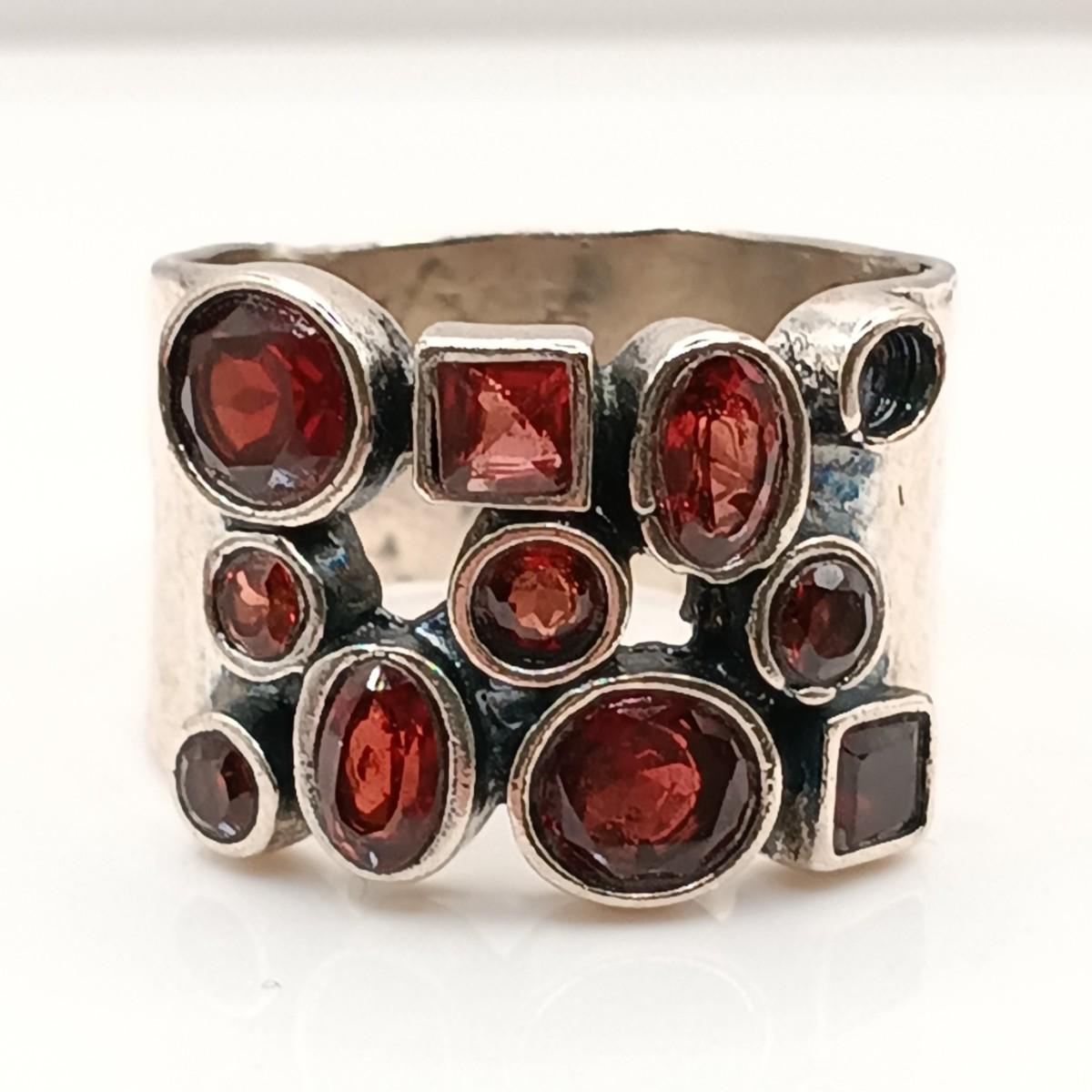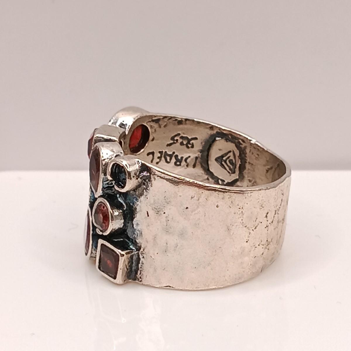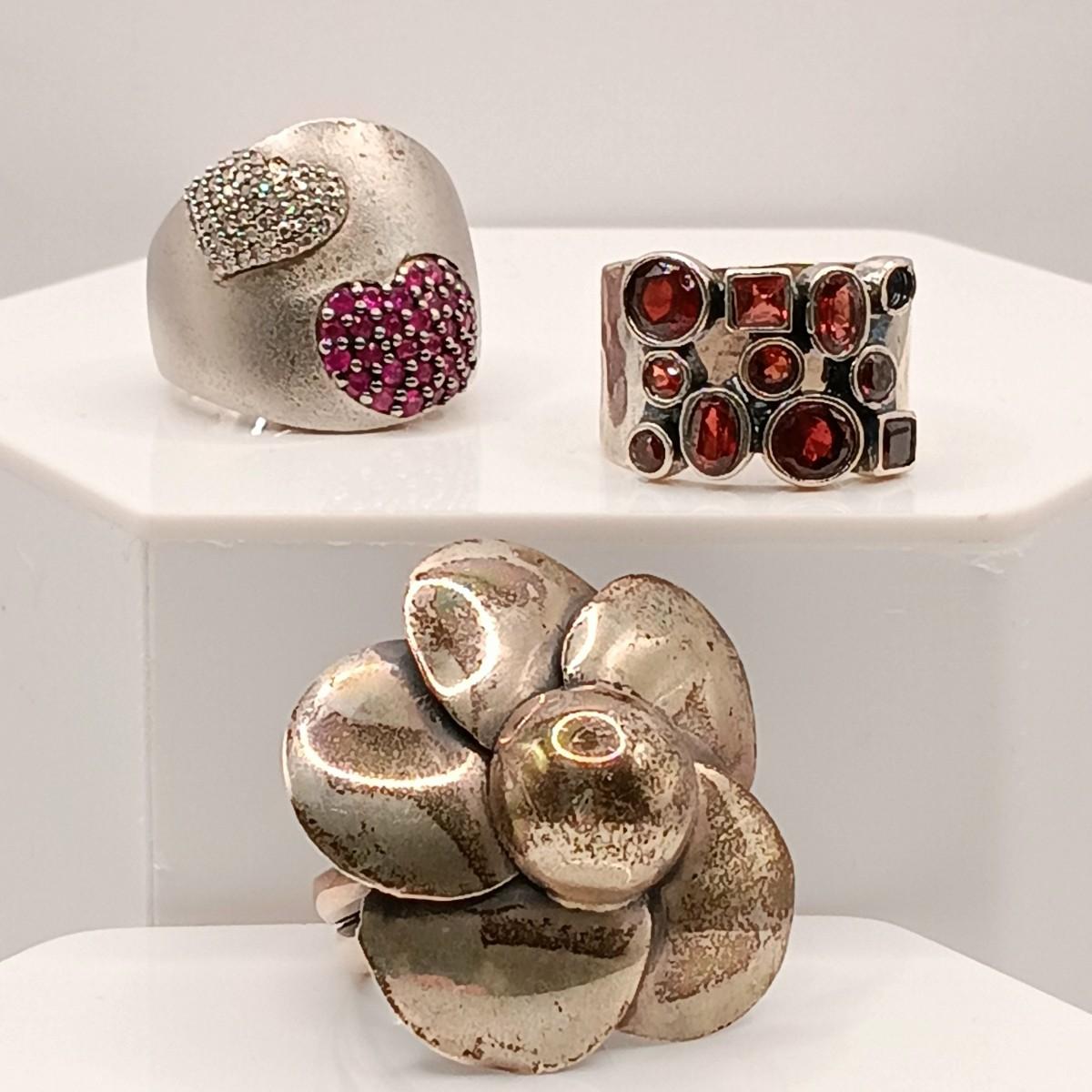 LOT 26: BH 925 Sterling Heart Ring 13.39g, 950 Flower Ring 10.73g & Israel 925 Ring with Garnet-Tone Stones 7.94g