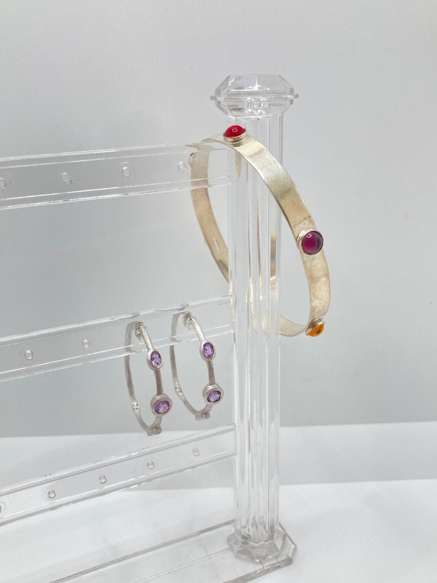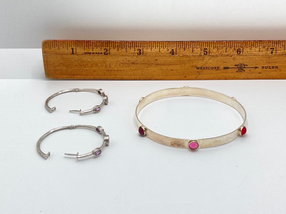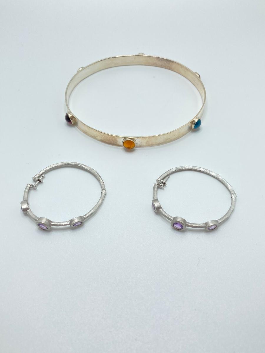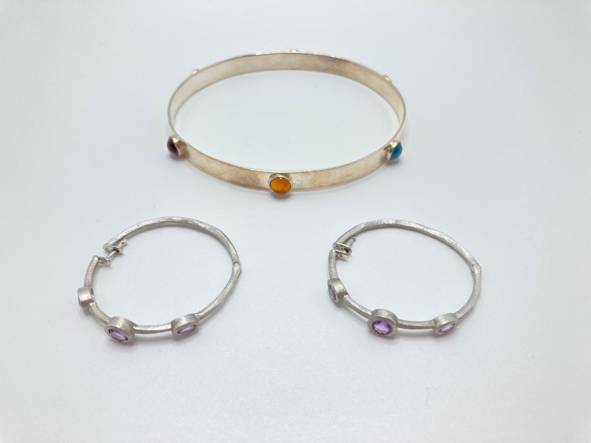 LOT 51: Amethyst Hoop Earrings and Artisan Sterling and Gemstone Bangle Bracelet