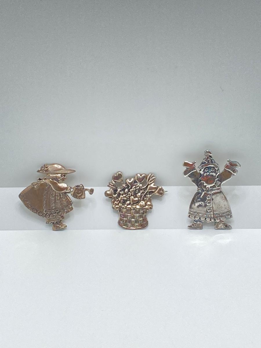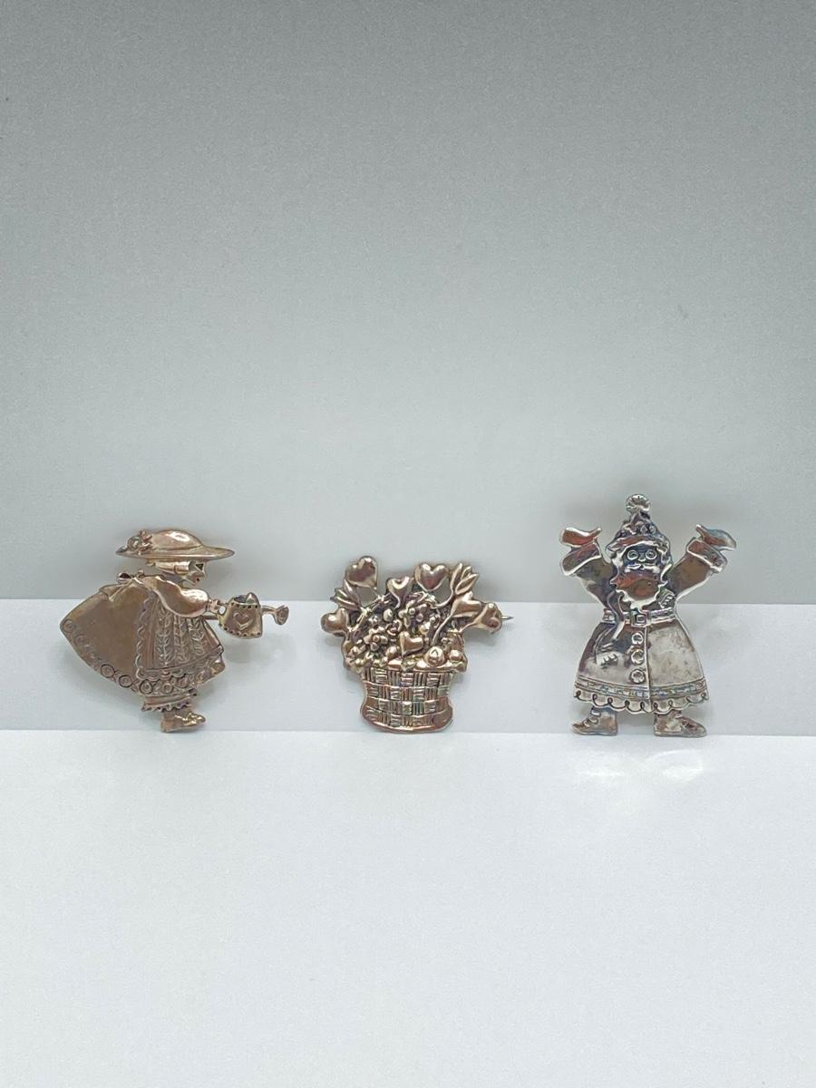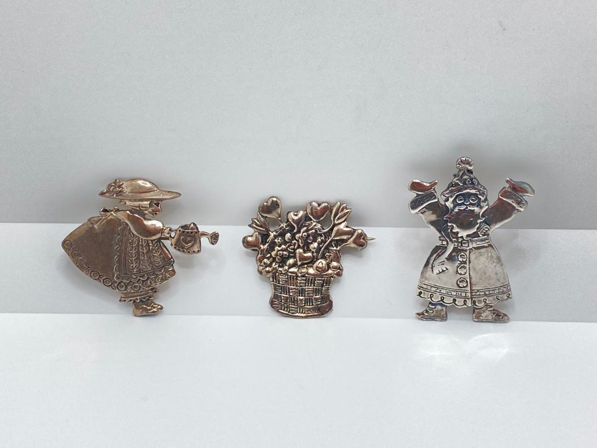 LOT 52: Sterling Mary Engelbreit Hearts in Basket Brooch, "Bloom" Girl with Water Can Brooch and Santa Claus Pin (MEINK)