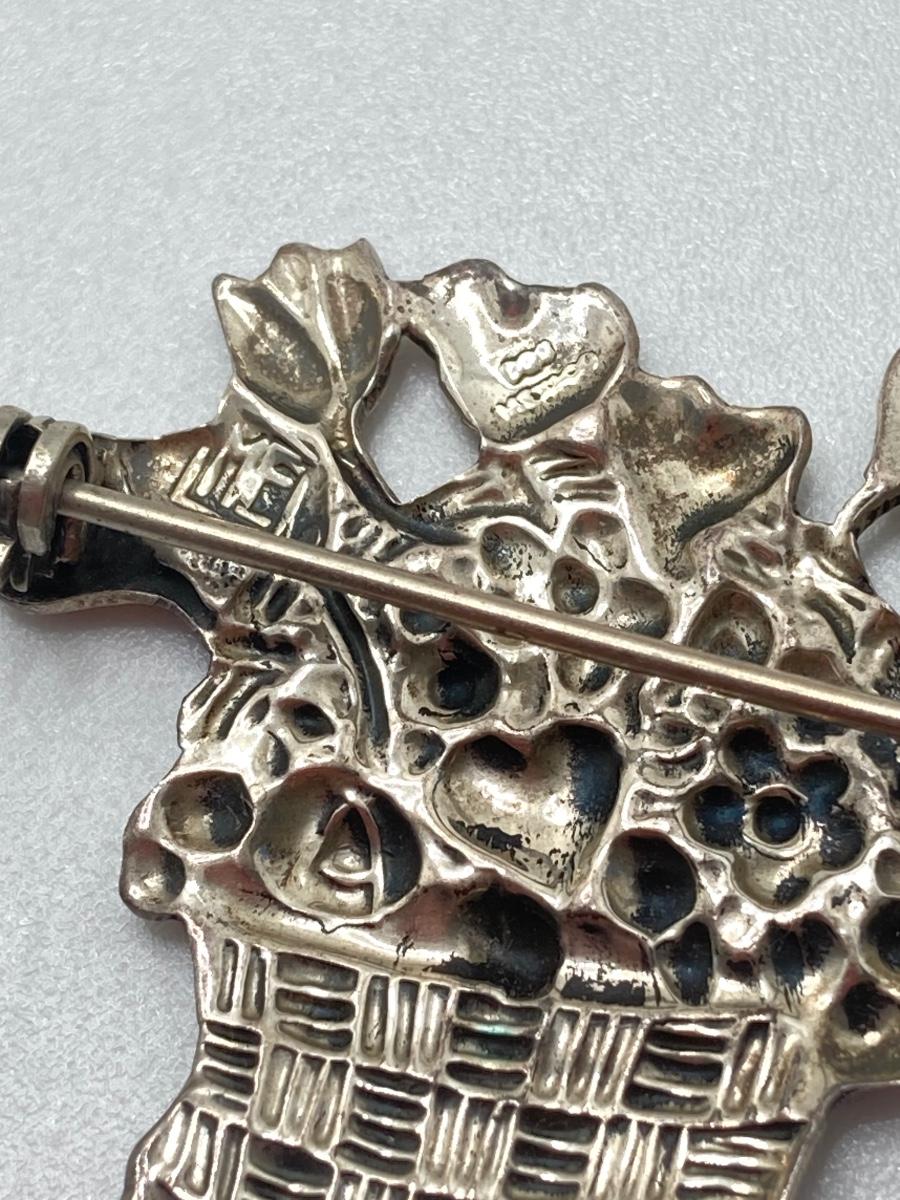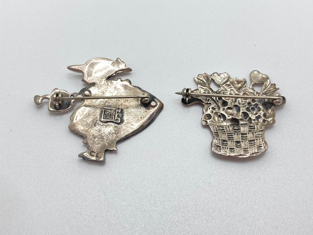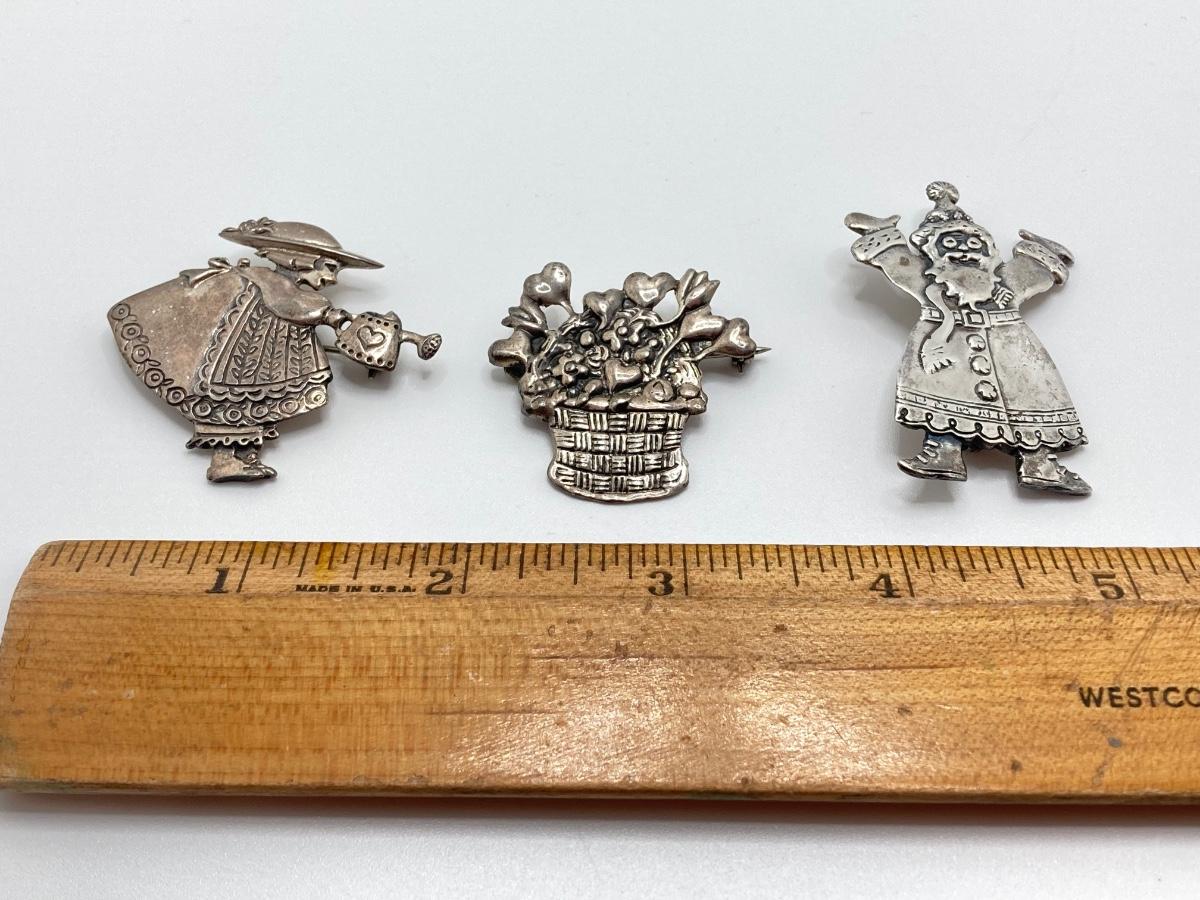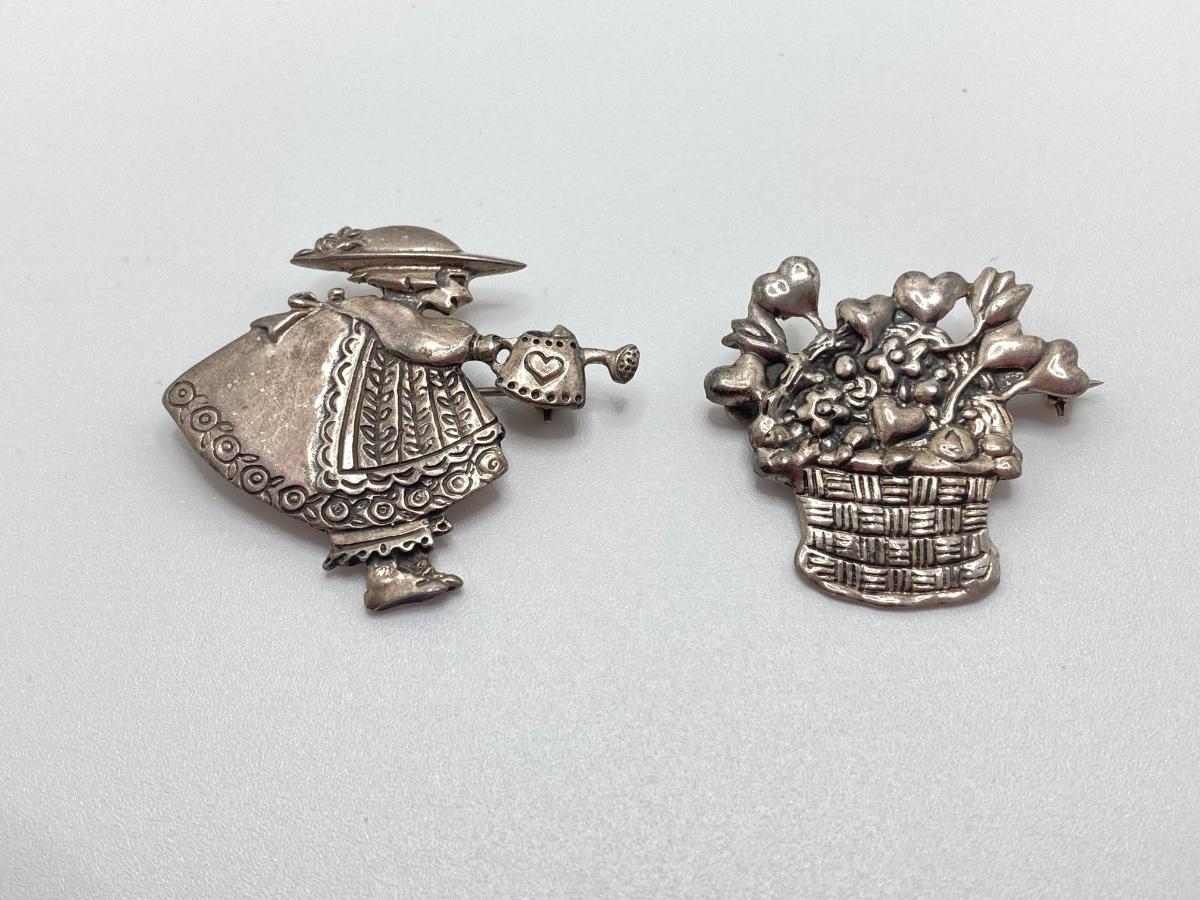 LOT 52: Sterling Mary Engelbreit Hearts in Basket Brooch, "Bloom" Girl with Water Can Brooch and Santa Claus Pin (MEINK)