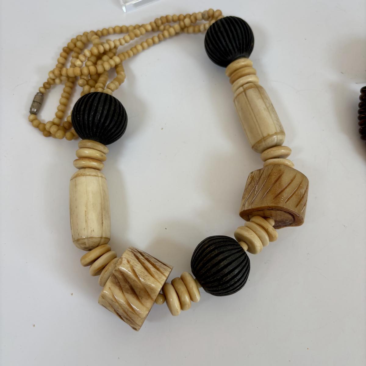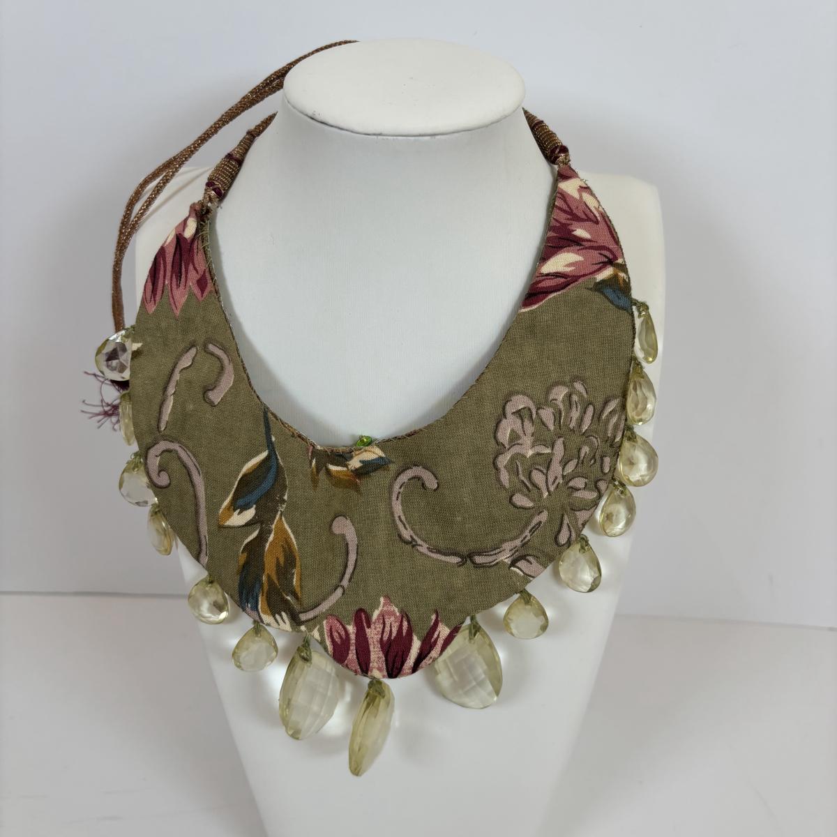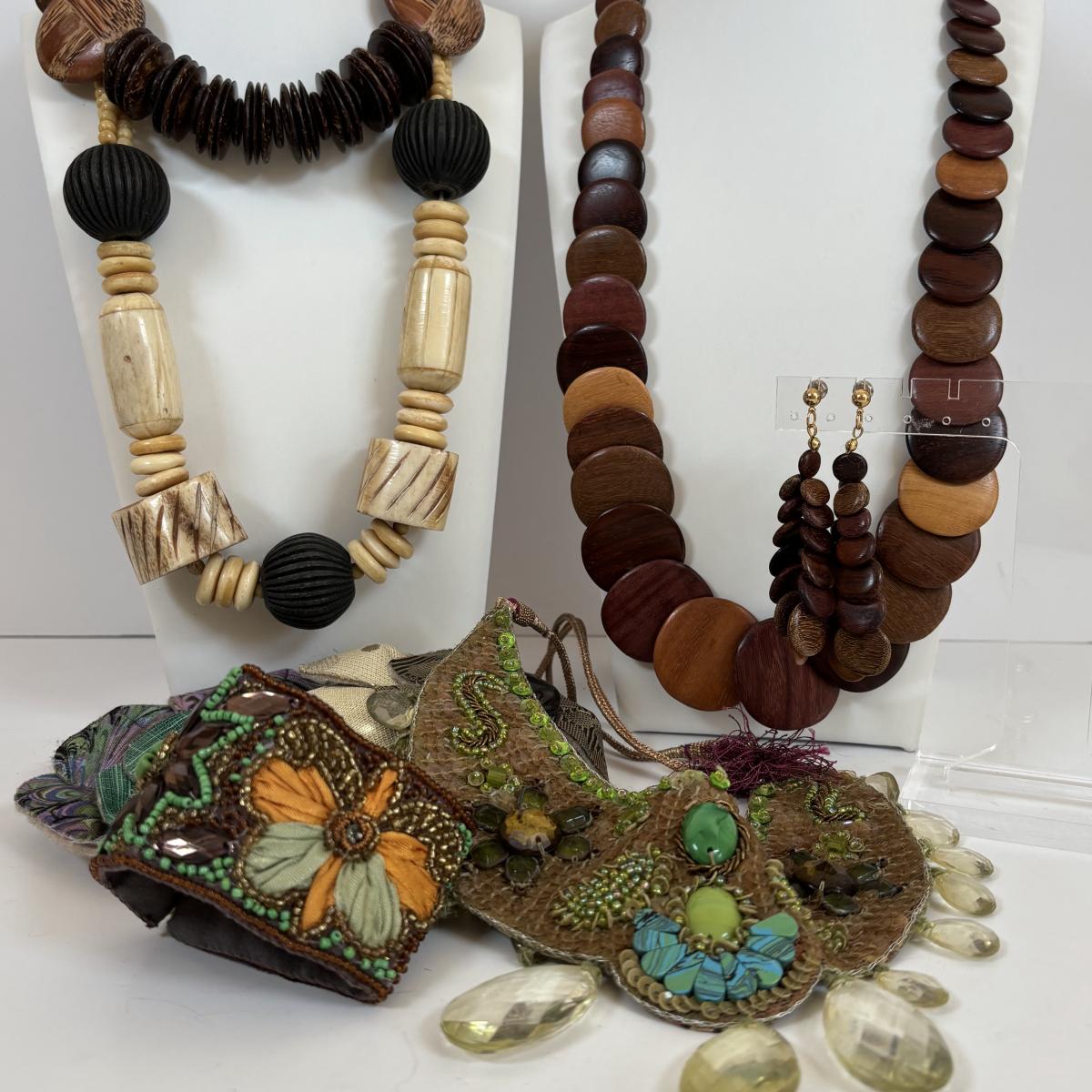 LOT 64: Hand Crafted Jewelry Collection: Wood Necklace & Earrings, Fabric Brooches & Collar Necklace, Embroidered Beaded Bracelet and Bone Necklace