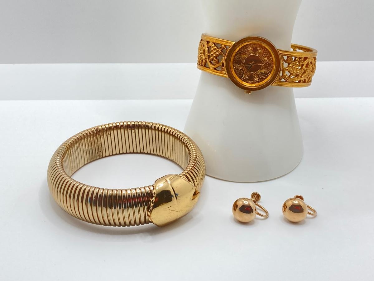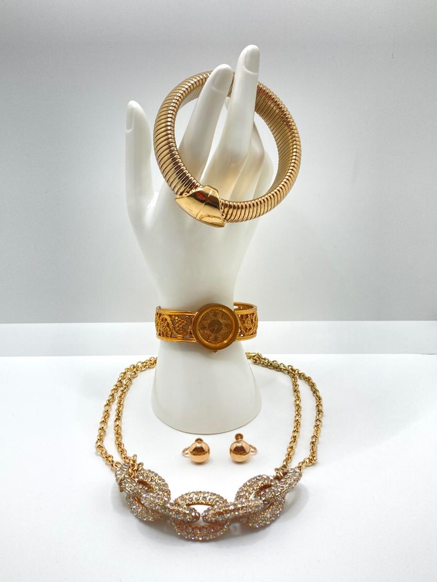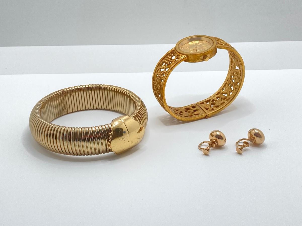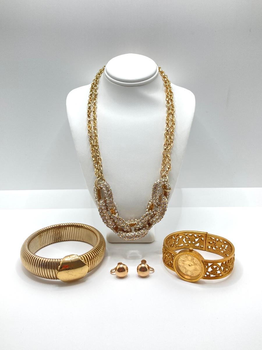 LOT 110: Metropolitan Museum of Art Watch, Van Dell Gold Filled Screw Back Earrings and Gold Tone Chain Link Rhinestone Necklace and More