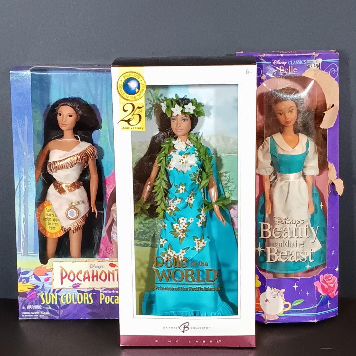 LOT 42: Disney's Sun Colors Pocahontas and 1992 Belle Doll w/ Barbie 'Dolls of the World' Princess of the Pacific Islands