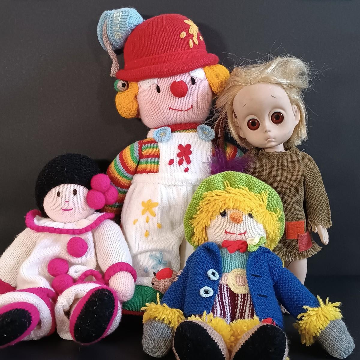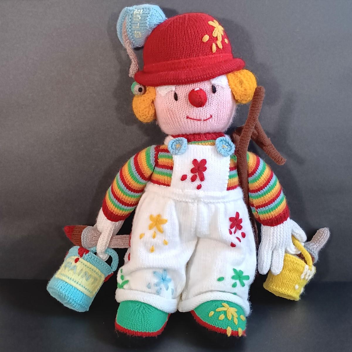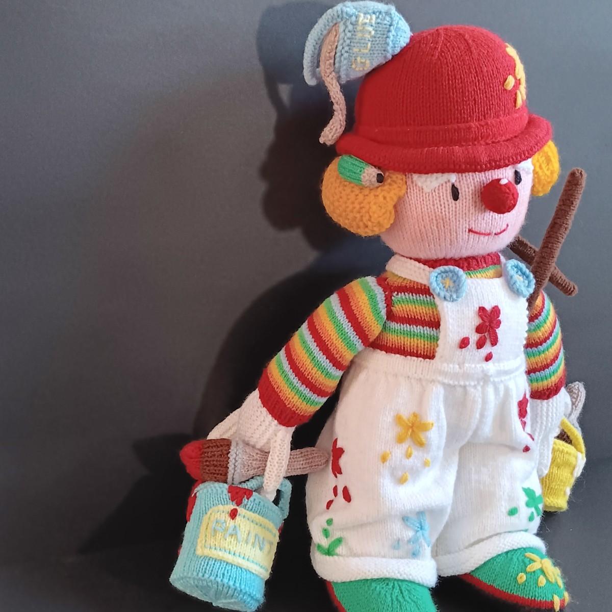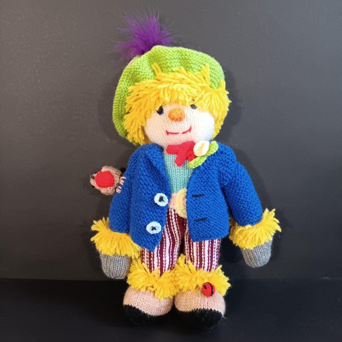 LOT 50: Jean Greenhowe Patterns Knitted 'Sidney Slapstick' Clown, Scarecrow and Pierrot with Little Miss No Name Doll