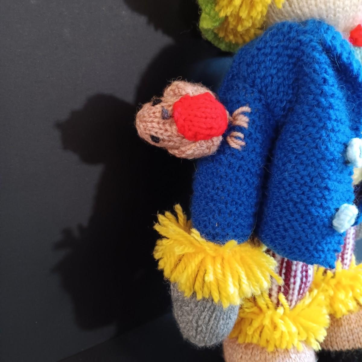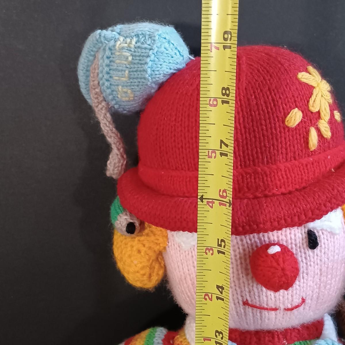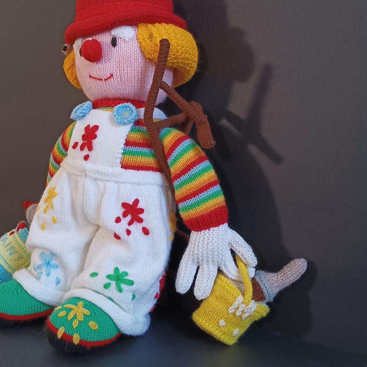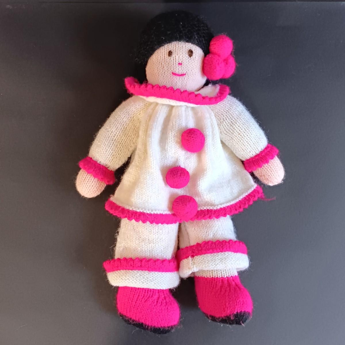 LOT 50: Jean Greenhowe Patterns Knitted 'Sidney Slapstick' Clown, Scarecrow and Pierrot with Little Miss No Name Doll